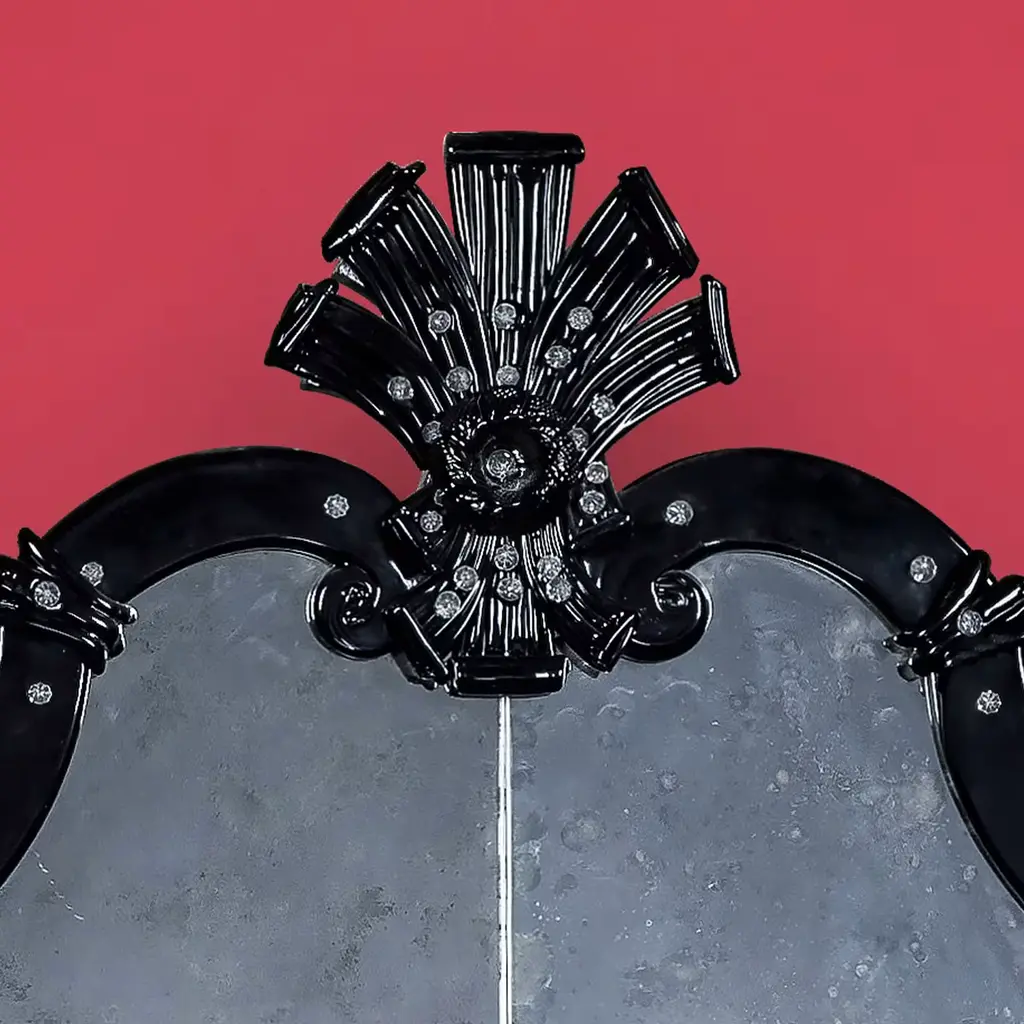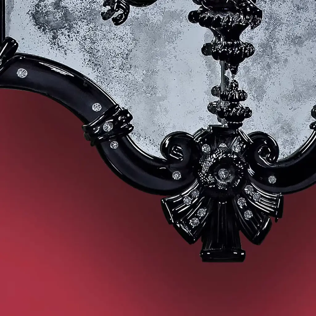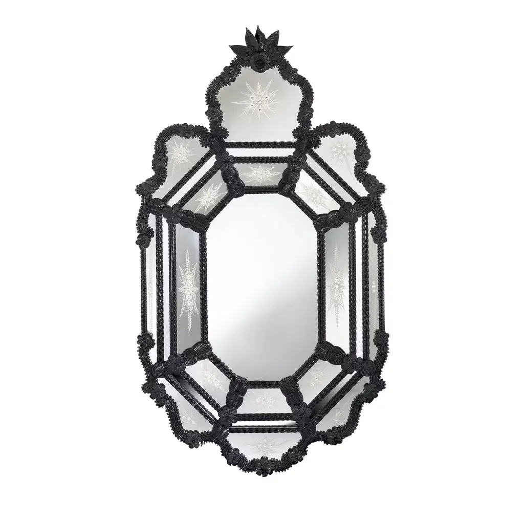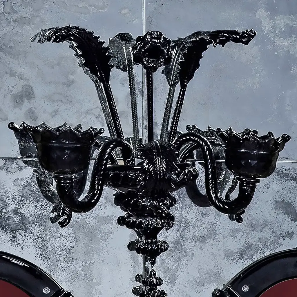 Iridescent mirror in Murano glass with the insertion of a two-light applique in the central mirror in typical Venetian style. Black applique, executed following the ancient techniques of our glass masters that handed down to the present day generates a unique work of its kind, with two functions, illuminating our homes with a mirror in total Venetian style, produced by Fratelli Tosi on Design by Fratelli Barbini Glass Mirror. The mirror composed of a black frame in Murano glass, is silvered and antiqued with pure silver, and then all finished with black leaves and flowers.