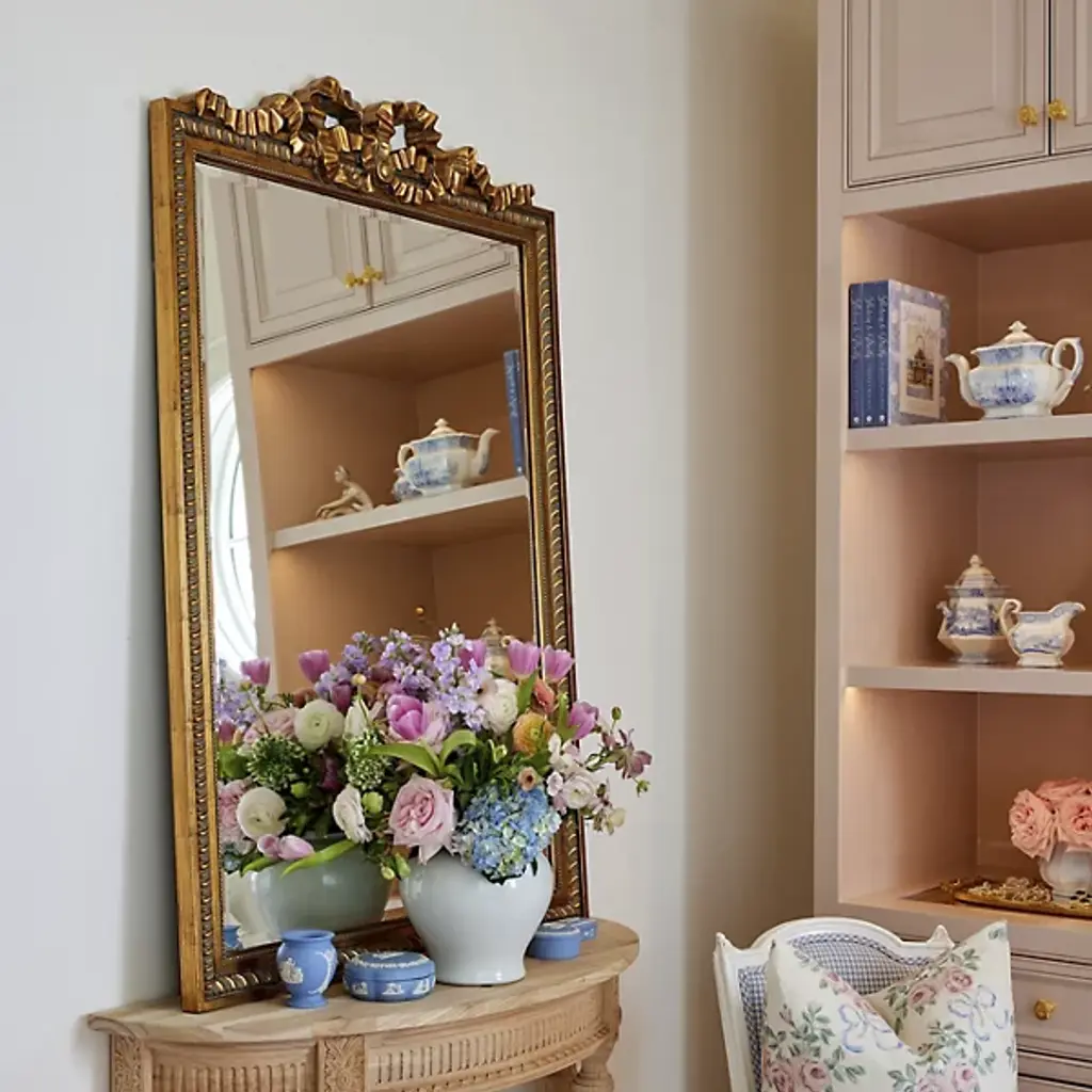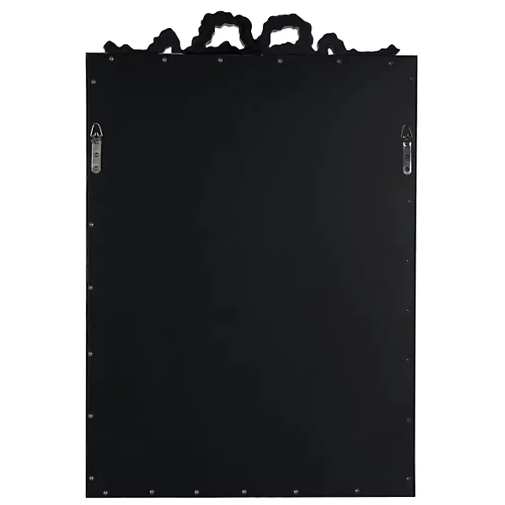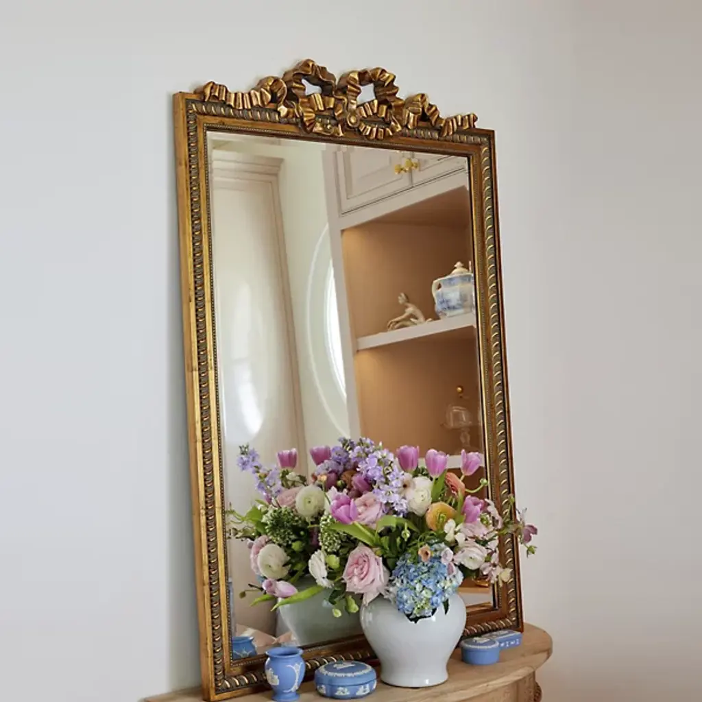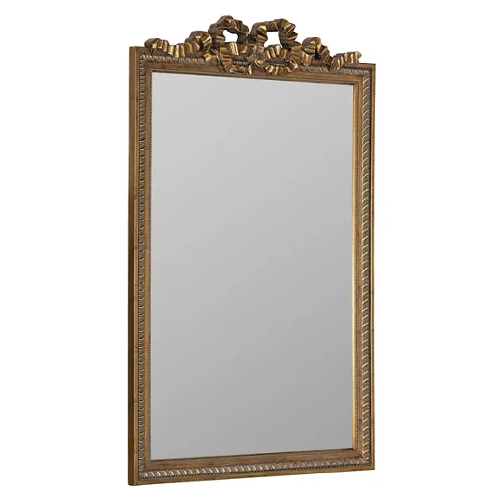 The Caitlin Wilson x Cooper Classics Clarence Wall Mirror from Cooper Classics surrounds its glass with intricate polyurethane scrollwork and ribbon details. A dramatic carved crest tops the frame, while matching ornamental corners complete the design. Beaded trim and rope motifs add layers of decorative depth. The frame draws from French baroque furniture while maintaining proper scale for contemporary spaces. This mirror enhances formal rooms where elaborate historical details complement the interior architecture.