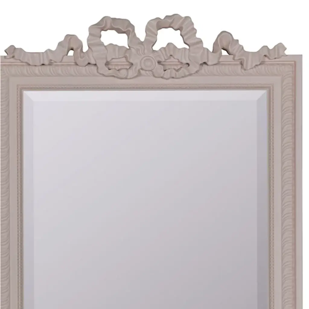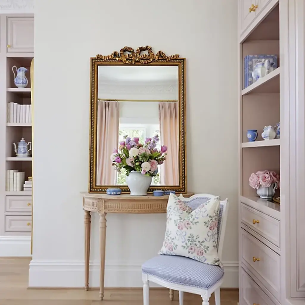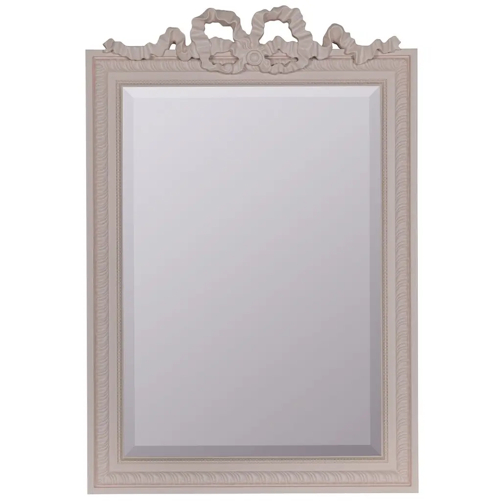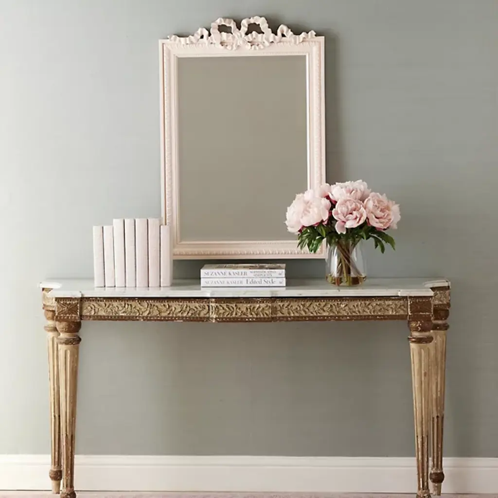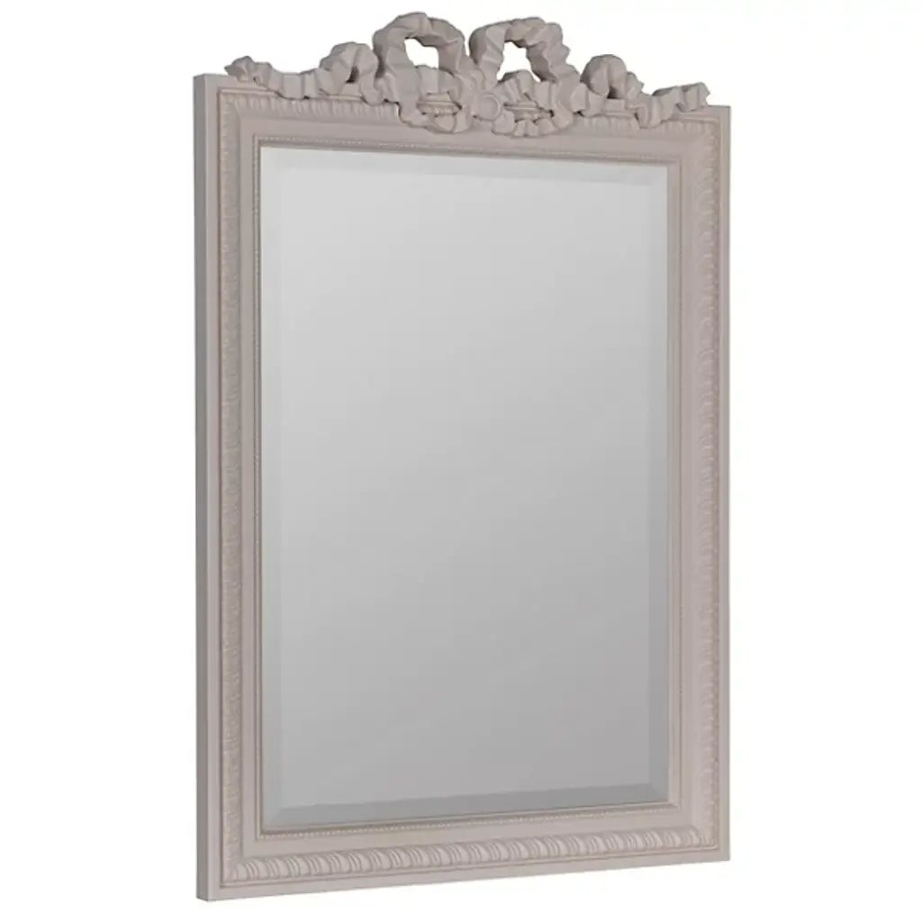 The Caitlin Wilson x Cooper Classics Clarence Wall Mirror from Cooper Classics surrounds its glass with intricate polyurethane scrollwork and ribbon details. A dramatic carved crest tops the frame, while matching ornamental corners complete the design. Beaded trim and rope motifs add layers of decorative depth. The frame draws from French baroque furniture while maintaining proper scale for contemporary spaces. This mirror enhances formal rooms where elaborate historical details complement the interior architecture.