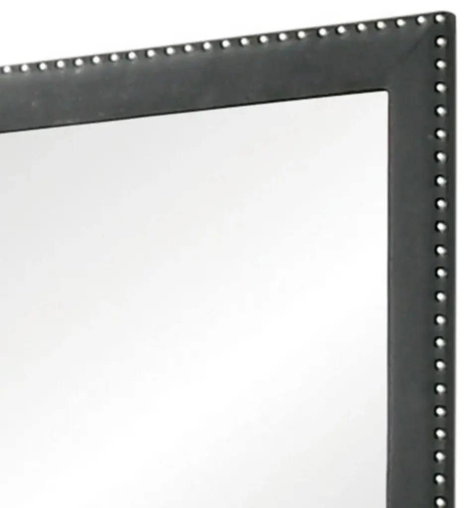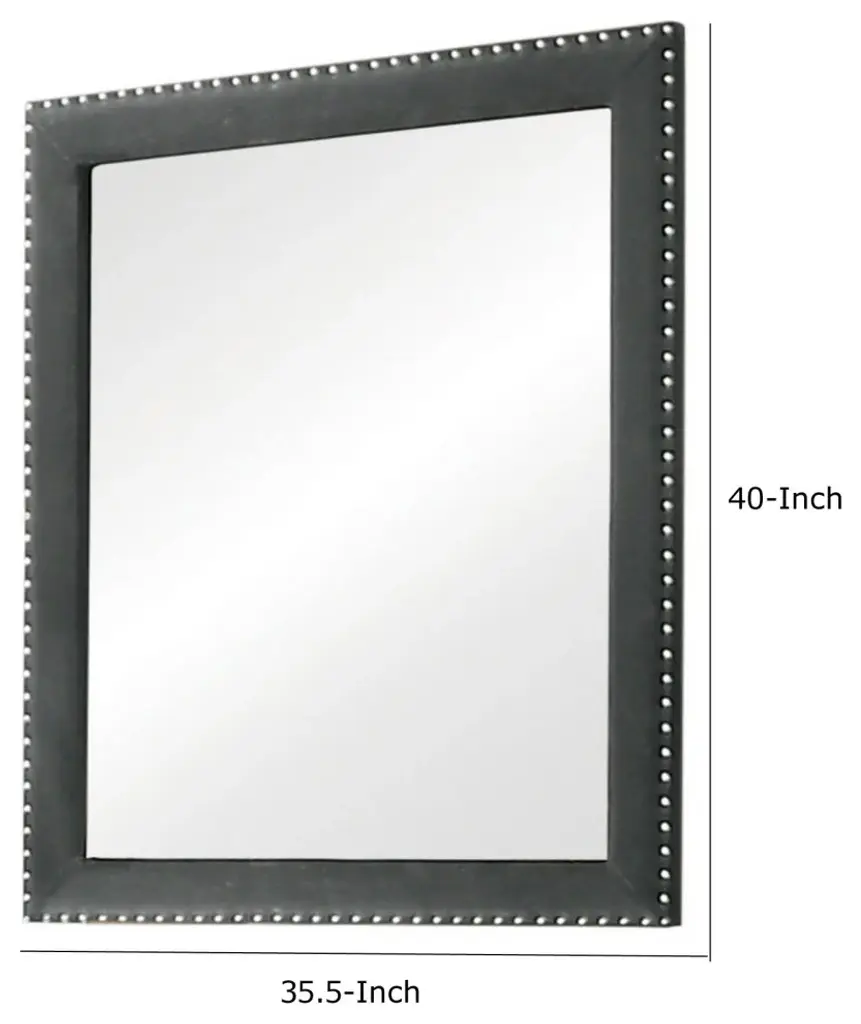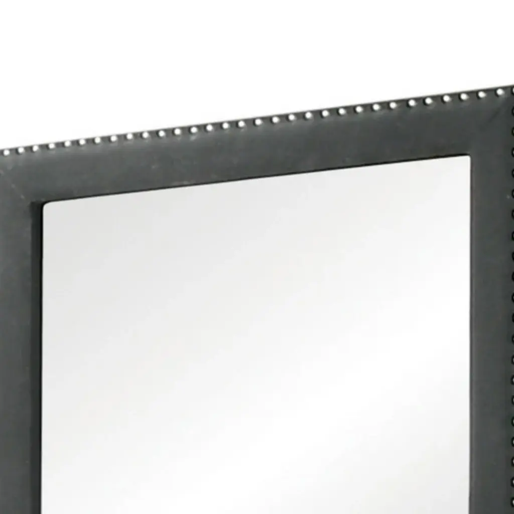 Cale 40 Inch Modern Portrait Mirror, Velvet Upholstery, Nailhead Trim, GrayThe portrait oriented wood frame with velvet upholstery is noticeably stylish, while the nailhead trim makes for a striking and eye catching accent. Check our Cale collection for matching items.