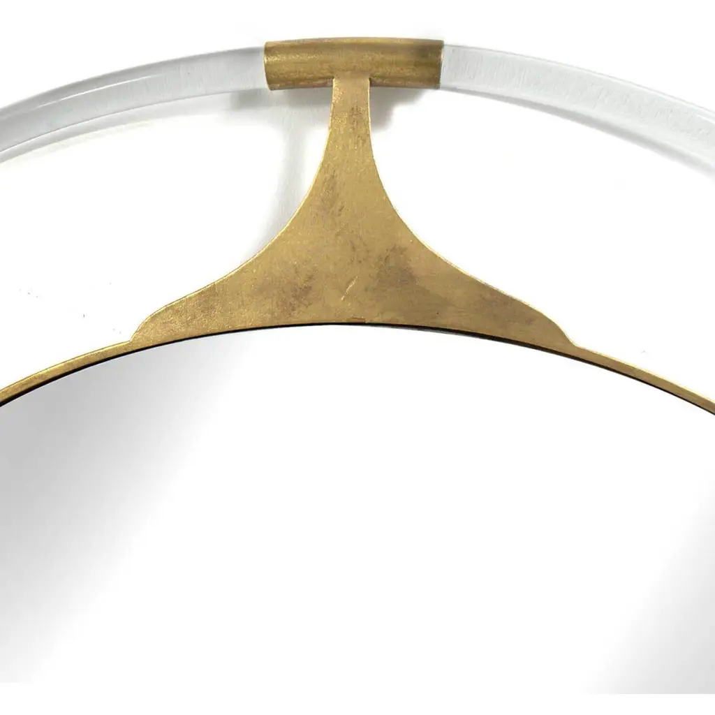 A bold, modern take on a coastal ring buoy, the Callisto Mirror beautifully surrounds a central round mirror with a ring of clear acrylic and delicate petals in gilded gold. This unique design element infuses any space with a touch of elegance and contemporary flair with a nod to coastal design. The combination of acrylic and gold accents creates a striking visual appeal, making this mirror a stunning statement piece for your home décor. Whether placed in an entryway, living room, or bedroom, the Callisto Mirror adds a sophisticated and artistic touch to any setting.