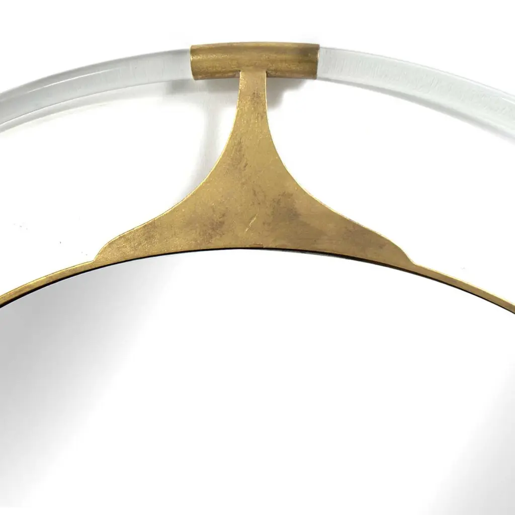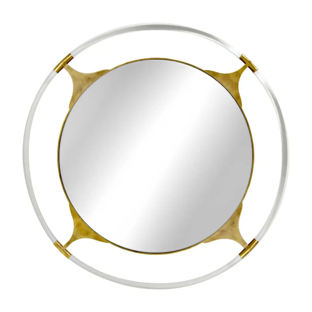 A bold, modern take on a coastal life ring style mirror, the Callisto Mirror surrounds a central round mirror with a ring of clear lucite and delicate petals in gilded gold. Hangs both horizontal and vertical.
