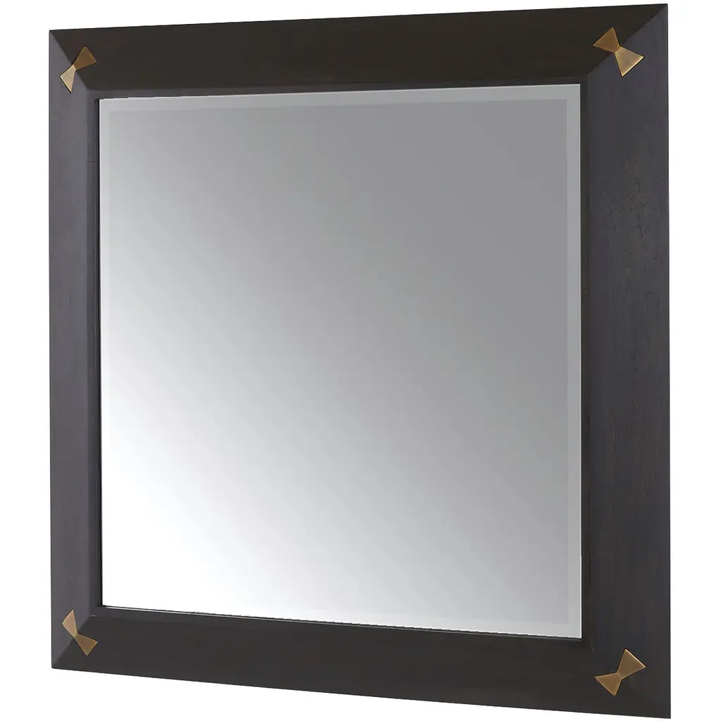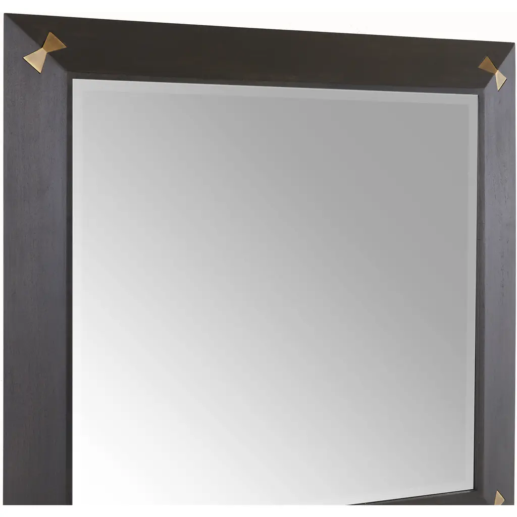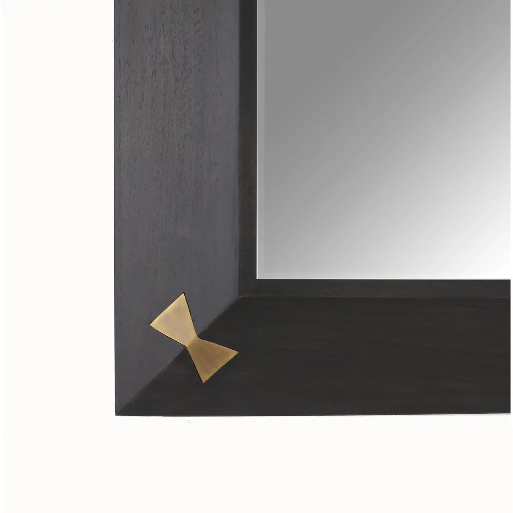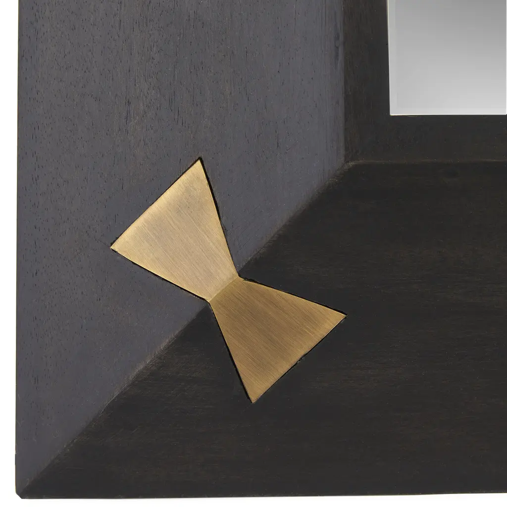 A polished sable mango wood frame is adorned with inlaid butterflies of antique brass to catch the light. The beveled mirror is held securely with dovetail joints, while each hinge lies flush within the frame for a smooth finish. Designed to be hung vertically, it is secured with a cleat at the back. Finish will vary.