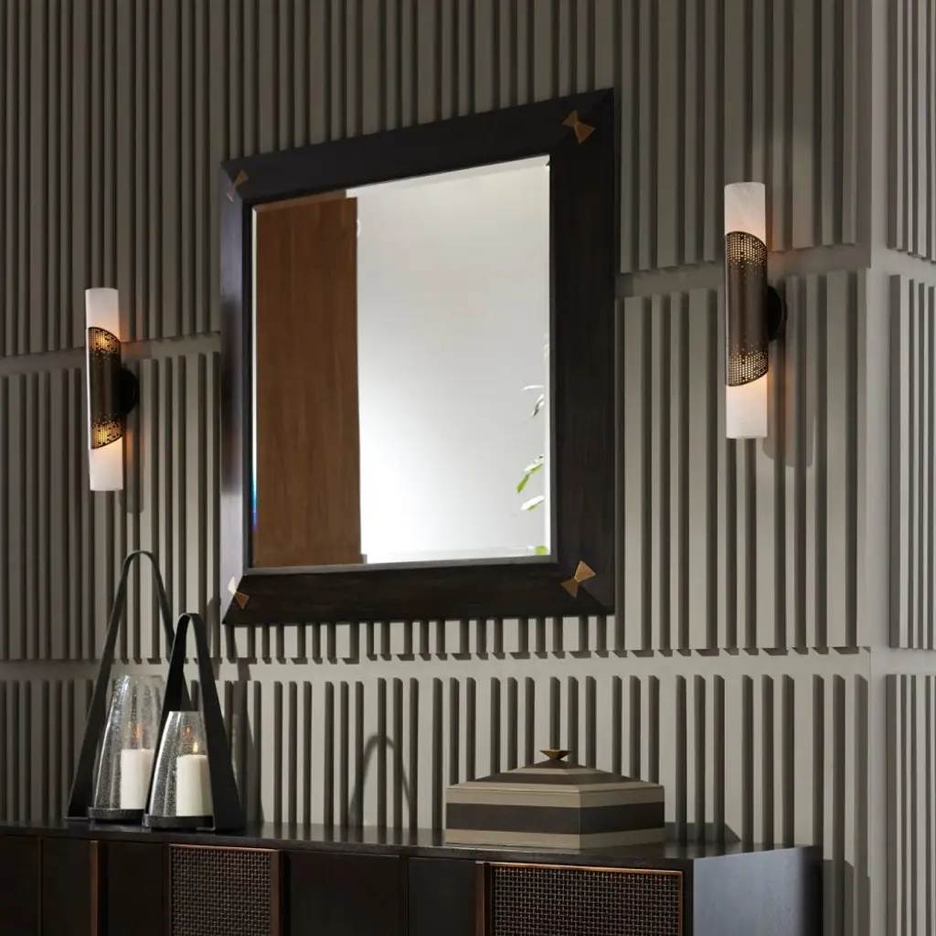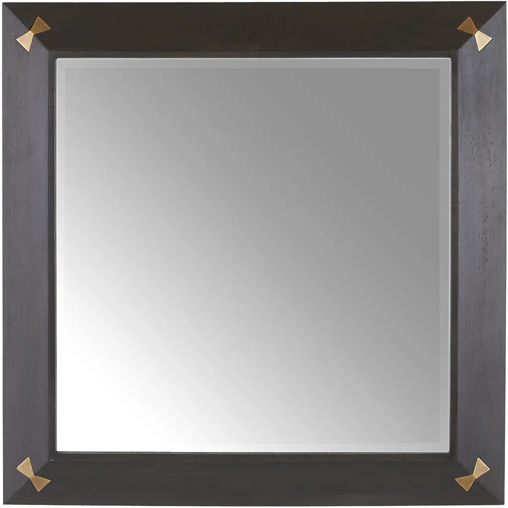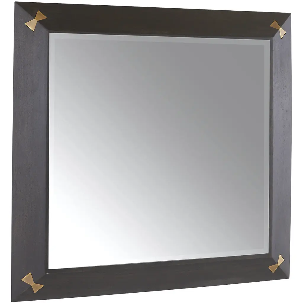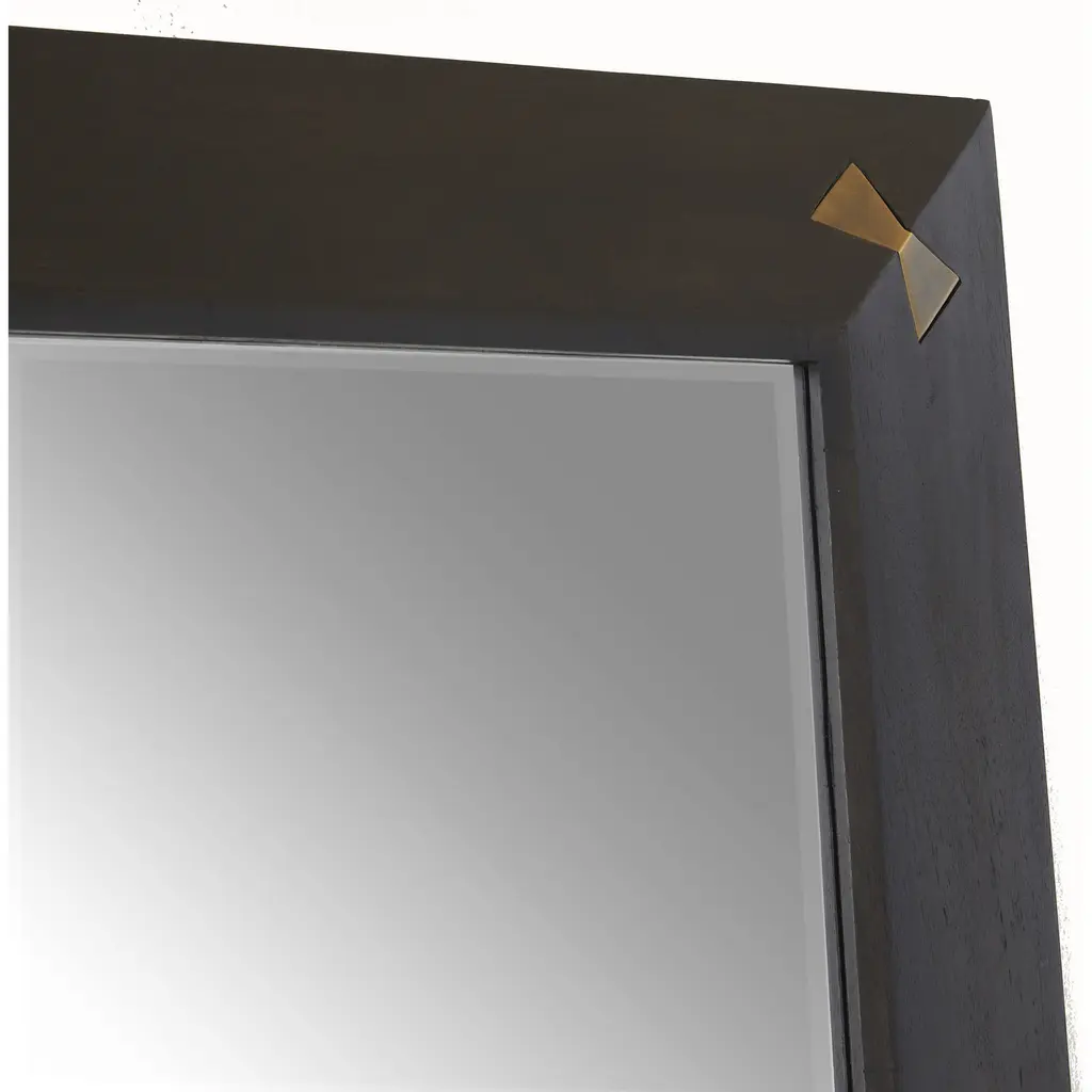 A polished sable mango wood frame is adorned with inlaid butterflies of antique brass to catch the light. The beveled mirror is held securely with dovetail joints, while each hinge lies flush within the frame for a smooth finish. Designed to be hung vertically, it is secured with a cleat at the back. Finish will vary.
