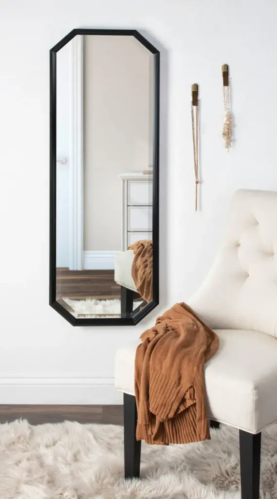 The glamorous, modern style of the sophisticated Calter wall mirror offers your home a practical accent for any room. Inspired by modern, geometric forms, the Calter mirror has minimal lines and a lovely octagon shape. Constructed with a resilient, lightweight plastic and mirrored glass, the Calter surface and frame each have a beveled edge to spread more light throughout the area. Adding a mirror to your wall expands your space by reflecting light, creating a more dimensional, open concept room. Hang this practical, geometric accent in any modern or glamorous living room,bedroom, entryway, bathroom, closet, or dining room. The overall dimensions of this mirror are 17.5 inches wide by 1.5 inches deep by 49.5 inches tall, showcasing a robust, full-length mirror for checking you appearance, tying your tie, or doing your makeup. Hang the Calter on its own for a bold focal point or in multiples to create a grand wall display. The metal D-ring hangers attached to the back of the frame allow you to hang it both vertically or horizontally, depending on your unique decorative aesthetic.• MODERN GLAM STYLE: This sophisticated wall mirror takes inspiration from geometric forms, designed with narrow, clean lines and an octagon shape to create a stunning glam statement• QUALITY MATERIALS: This resilient, lightweight accent is crafted with a resilient, octagon frame and a large mirrored glass surface, both with a beveled edge to reflect and spread more light throughout the room• LARGE SIZE: The overall dimensions of the Calter wall mirror are 17.5 inches wide by 1.5 inches deep by 49.5 inches high, providing a chic, dimensional accent for any wall• READY FOR ANY ROOM: As a bold, one-of-a-kind accent and practical mirror, the Calter octagon looks excellent on its own or in a large wall gallery in your living room, bedroom, bathroom, entryway, or dining room• EASY TO HANG: Hang this sophisticated wall mirror vertically or horizontally in a with convenient metal D-ring hangers securely attached to the frame