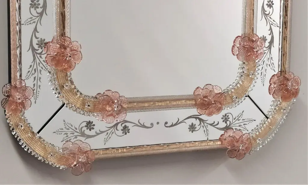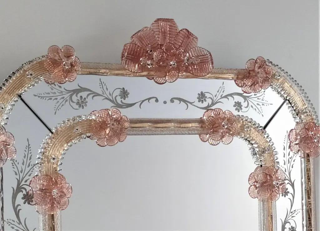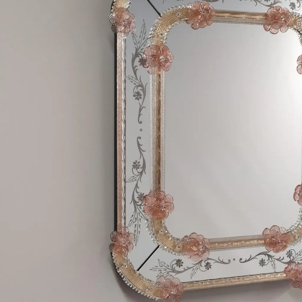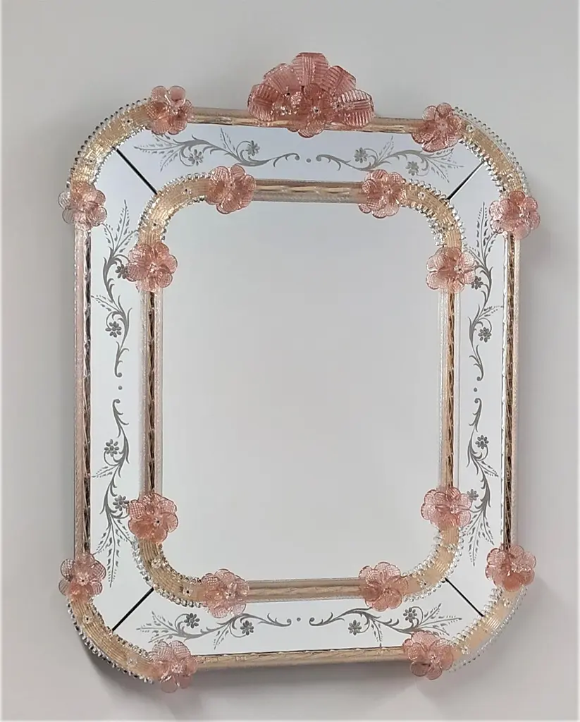 Specchio in vetro di Murano in Stile Veneziano, specchio realizzato su disegno dei Fratelli Tosi Murano, interamente lavorato a mano secondo le tecniche degli antichi "Specieri" Veneziani. Specchio composto da cornice in cristallo su fondo oro, in vetro di Murano e riccioli decorati in vetro di Murano, il tutto su fondo oro, impreziosito dai particolari colorati di fiori e foglie di colore Rubino , lo specchio è tutto decorato con incisioni floreali interamente realizzate a mano.Lo specchio è personalizzabile nelle misure e nei colori