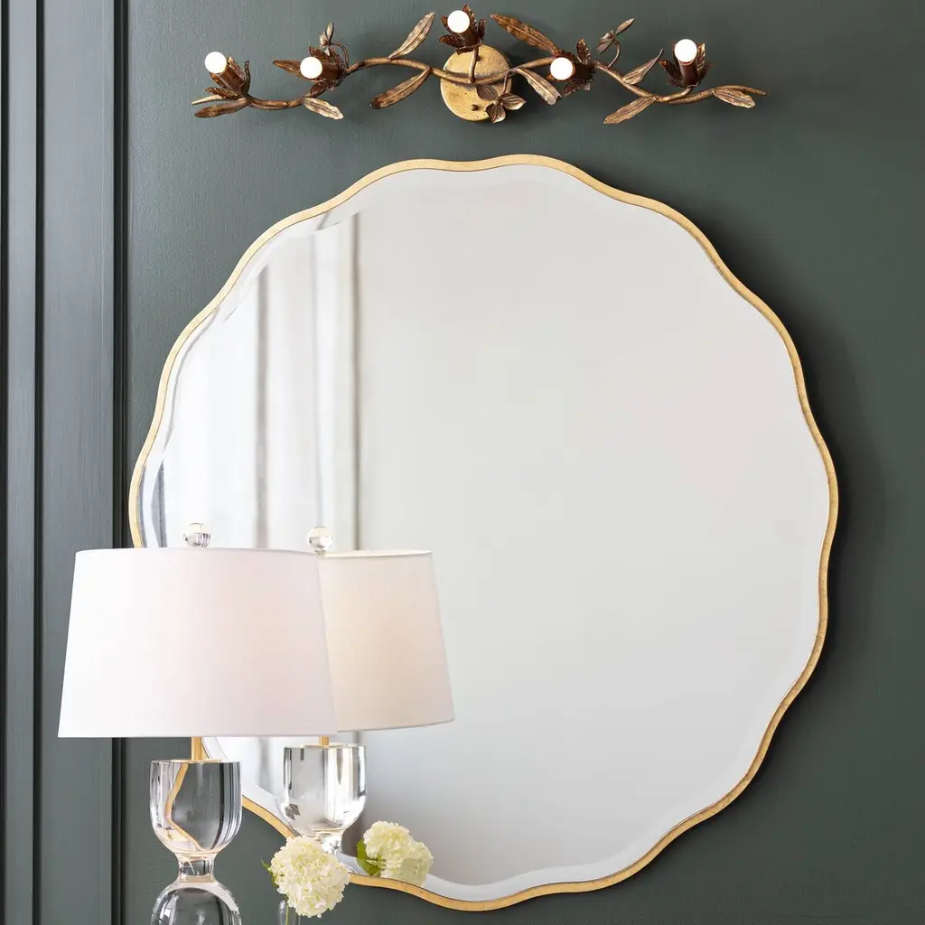 The gilded frame adds time-honored elegance to this mirror's undulating, daisylike shape. So does the beveling of the mirror itself.