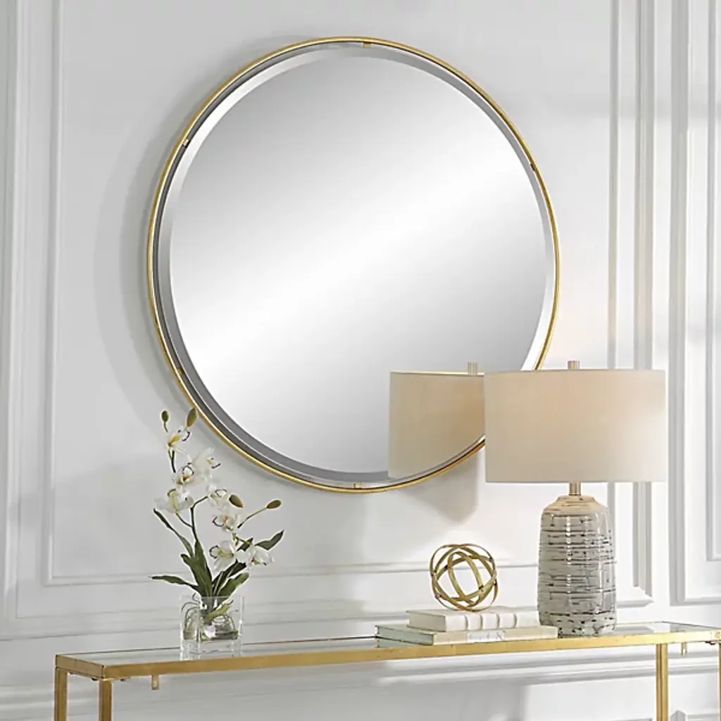 The Canillo Round Mirror from Uttermost effortlessly blends design and functionality. Crafted with deliberation, this mirror seamlessly combines form and aesthetics, becoming a focal point in your interior. With a floating design and beveled glass edge, Canillo exudes a sense of elegance. Combining iron, MDF, and glass, it stands as a testament to both durability and transitional style.