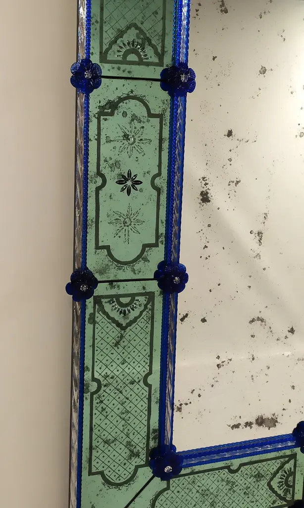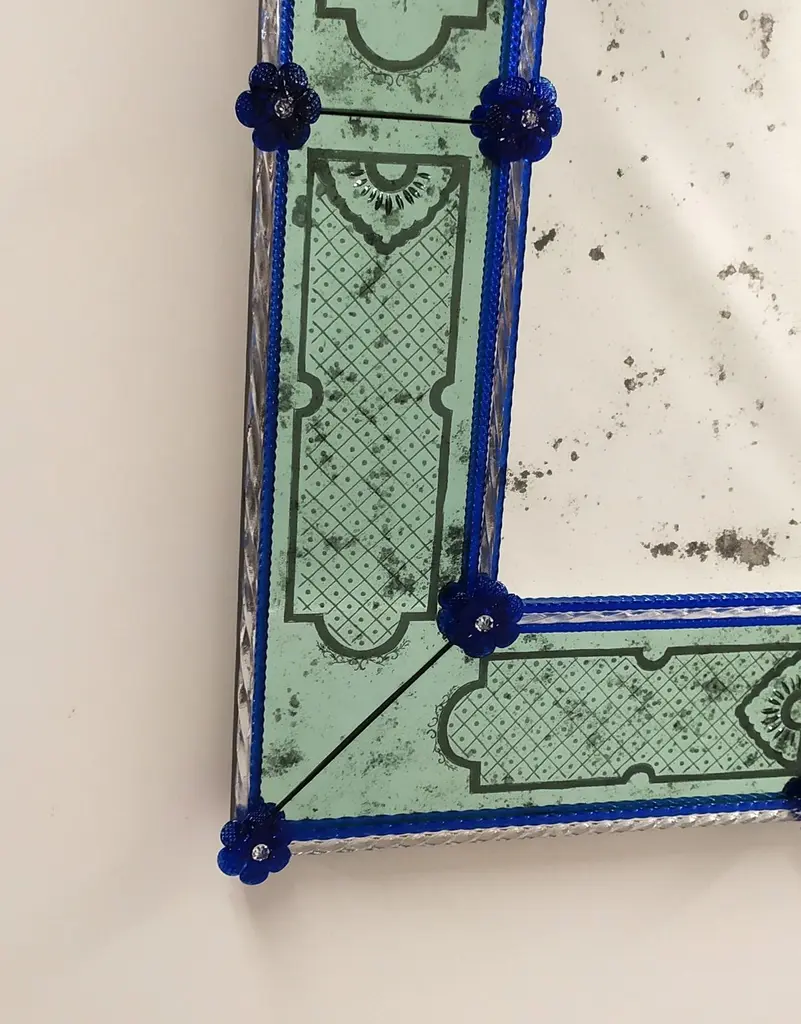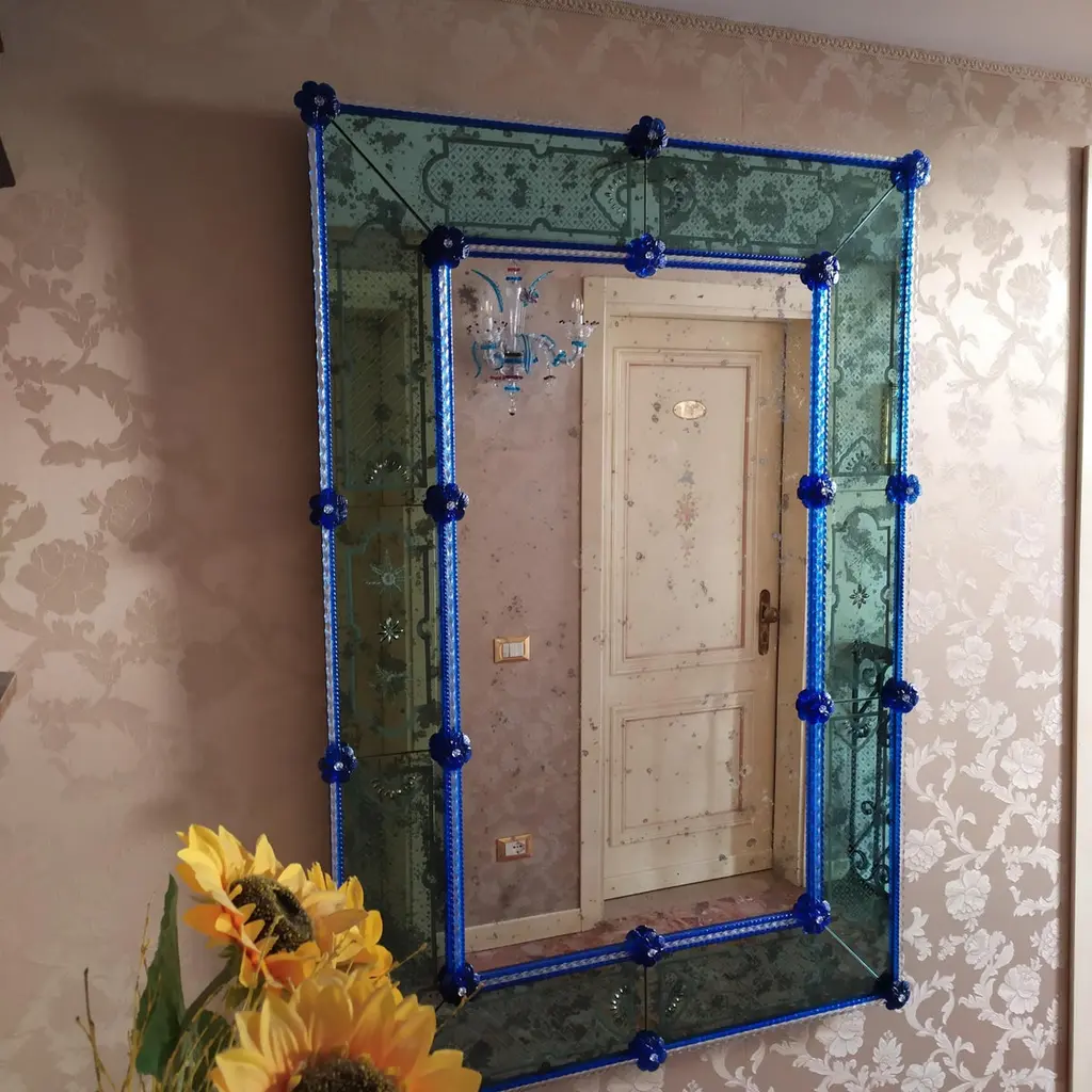 Beautiful Venetian Mirror in dark blue color inspired by the beautiful "Cannareggio" neighborhood of Venice.Made and designed by Fratelli Tosi according to tradition.Adorned with beautiful glass rosettes and filaments, decorated with ornaments.