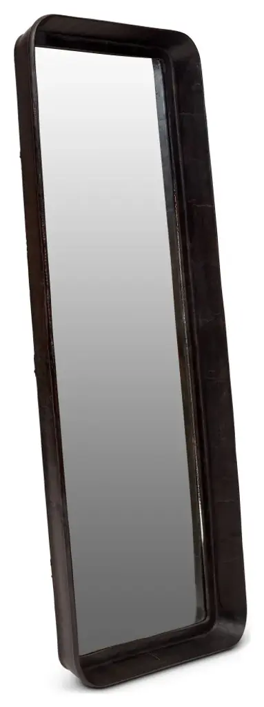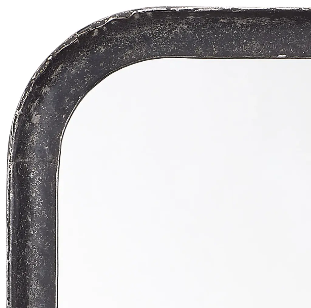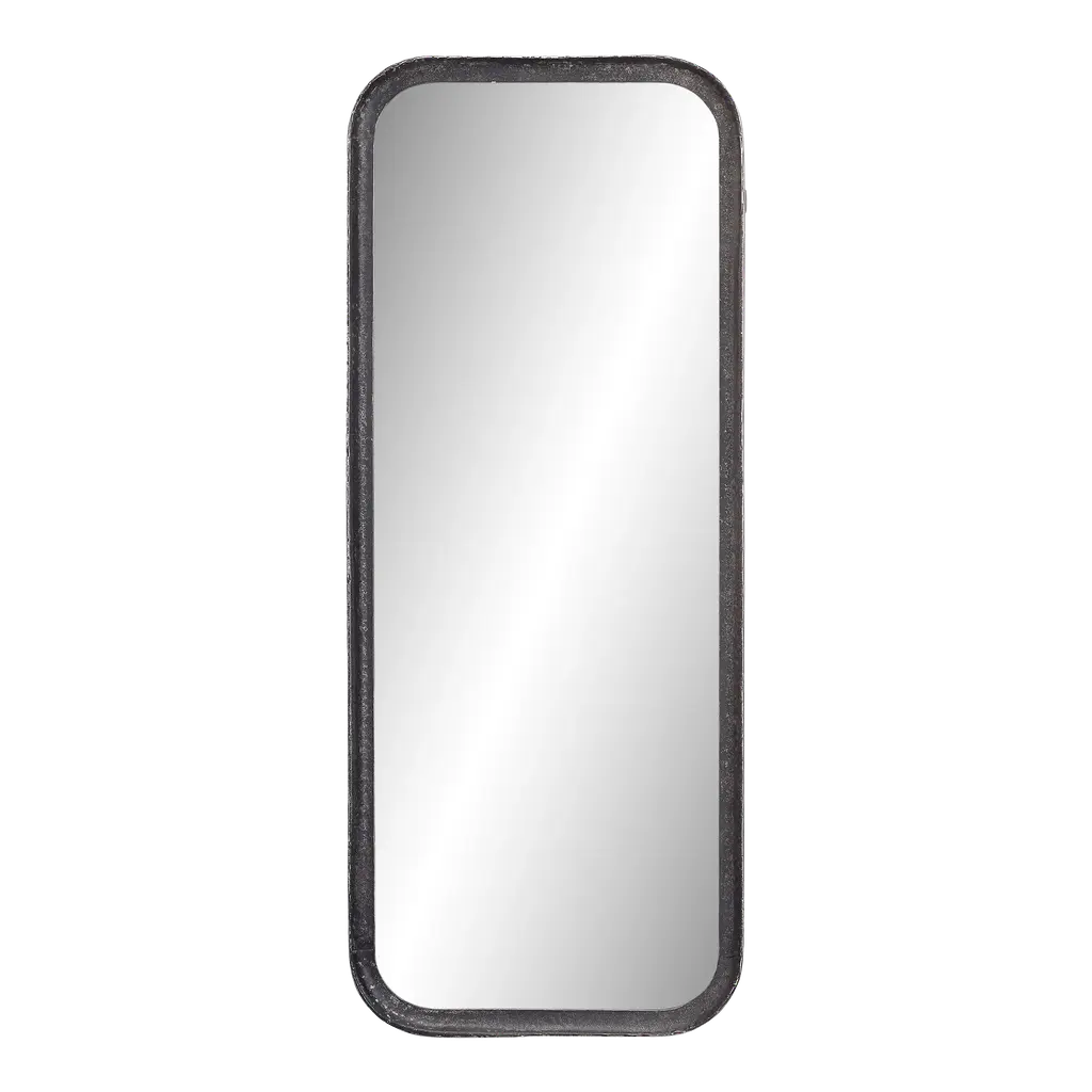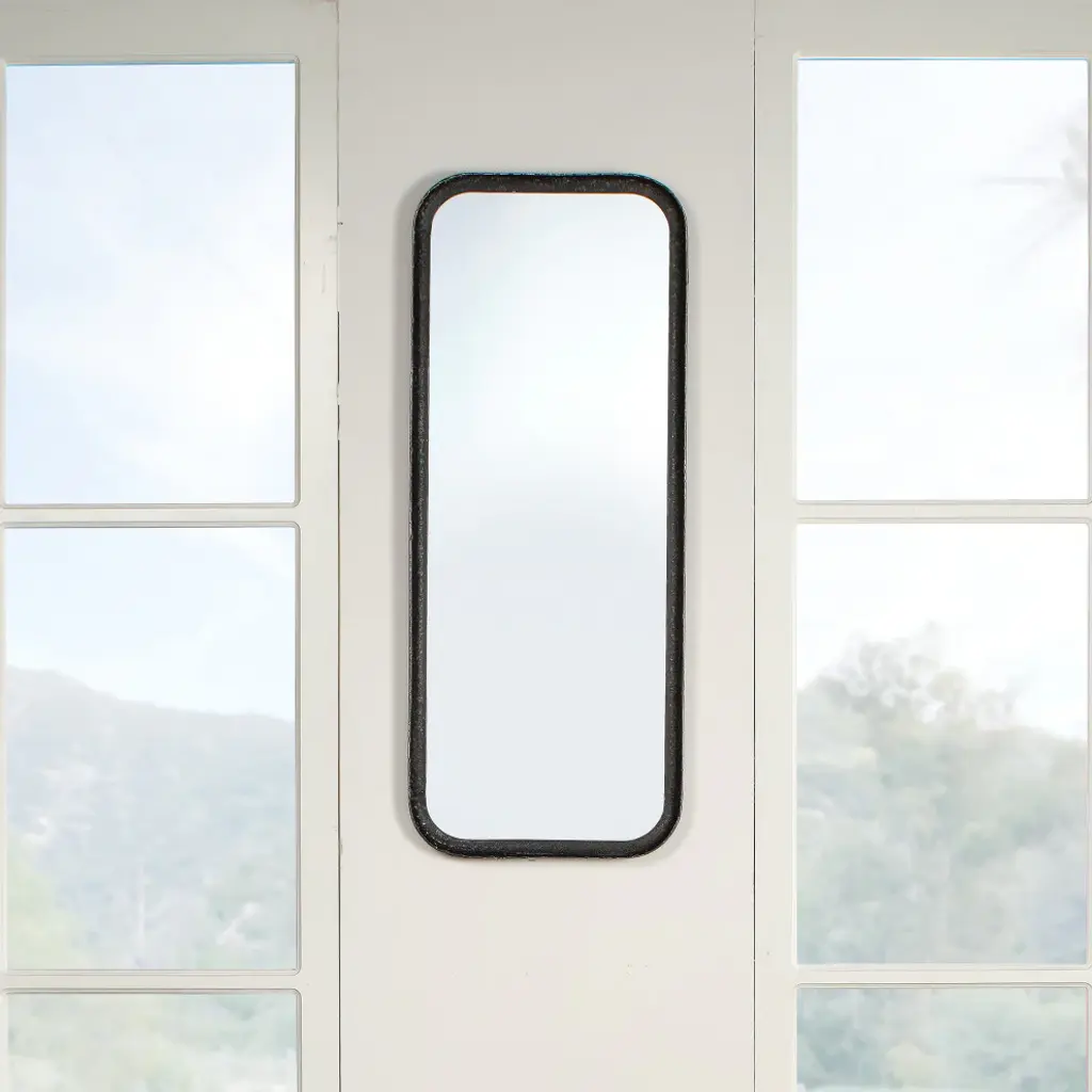 The clean lines of this contemporary wall mirror"™s frame are hand-forged of metal. Featuring gently rounded corners that soften the starkness of the design without distracting and the versatility of hanging horizontally and vertically. Group two or more together for a window-inspired display or use one to add height and dimension to any wall. •Expertly crafted of Iron and hand-distressed in Black•Non beveled glass mirror•Mirror can hang vertical or horizontal•Rustic frameThe inherent variations in tone and texture of hand-forged iron are preserved, to create pieces rich in detail and natural beauty. These unique imperfections give our products character and individuality, with each piece having its own personality. These unique imperfections and variations are what define our products, with each piece having its own personality. •Mirror Surface: 37.5"H x 13.75"W•D-Loop Hanging Mechanism•Frame: 1"W•MDF BackingCare Instructions: Wipe frame with a soft, dry cloth. Wipe glass with standard glass cleaner. DO NOT use cleaners or abrasives on mirror frame.