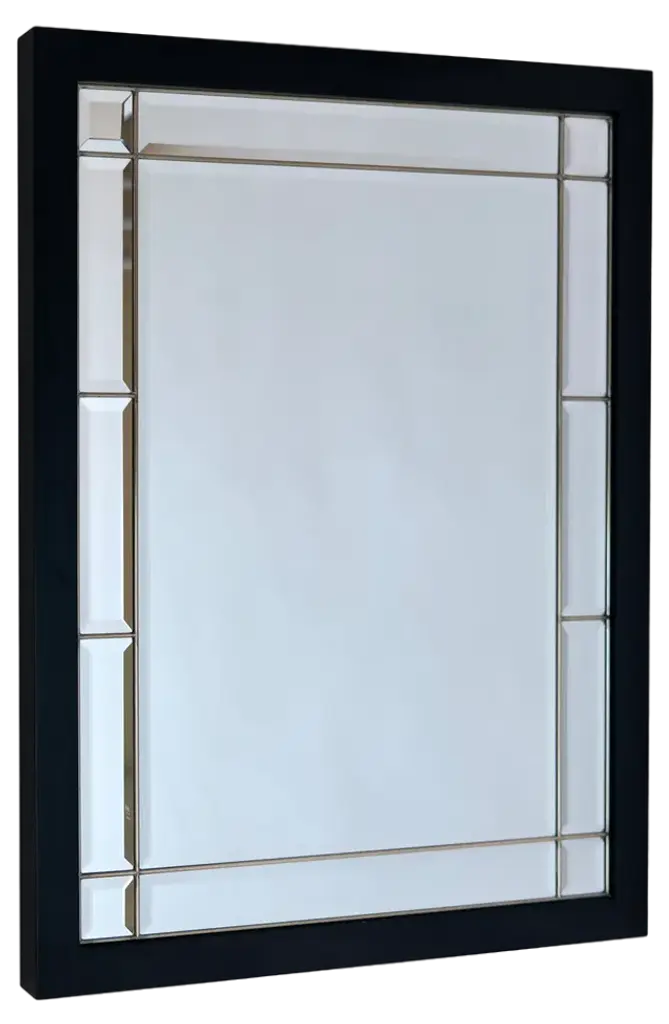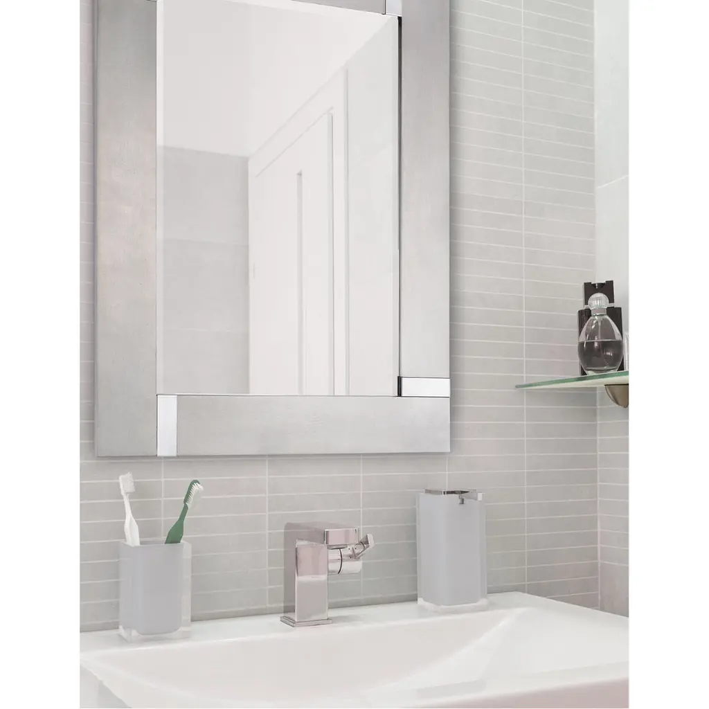 This modern mirror features a silver leaf finish highlighted with chrome corner accents. Mirror is beveled.