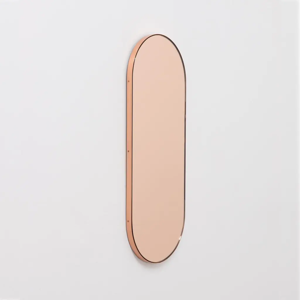 Contemporary Capsula™ capsule / pill shaped rose gold / peach mirror with an elegant copper frame. Designed and handcrafted in London, UK. This mirror is fully customisable.Our mirrors are designed with an integrated French cleat (split batten) system that ensures the mirror is securely mounted flush with the wall.Shipped safely and insured worldwide. All our mirrors are made on demand. Fabrication lead time for this particular mirror is approximately 4 to 5 weeks. Our mirrors are always shipped by courier express. Shipping via courier express typically requires 1 to 2 days to the UK, or 2 to 7 days outside the UK depending on the destination.Available dimensions:Small: 27cm x 68cm x 1.8cm / 10.6" x 26.8" x 0.71"Medium: 37cm x 56cm x 1.8cm / 14.6" x 22" x 0.71"Large: 46cm x 71cm x 1.8cm / 18.1" x 28" x 0.71"Extra Large: 48cm x 97cm x 1.8cm / 18.9" x 38.2" x 0.71"or any bespoke dimension. Available options:- bevelling- back-illumination creating a halo effect- demister padPlease contact us for a quote for any bespoke specifications or added options.Note that the mirror in the images illustrates a small size mirror, measuring 27cm x 68cm x 1.8cm / 10.6" x 26.8" x 0.71"ORDERS OF MULTIPLE MIRRORS OF THE SAME TYPE: Please contact us to receive a Packing and Shipping quote when ordering multiple mirrors of the same type. An order for multiple mirrors of the same type may not be accepted without extra packing and shipping fees. Thank you.