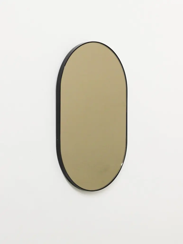 Modern handcrafted Capsula™ capsule / pill shaped bronze tinted mirror with an elegant black powder coated aluminium frame. Designed and made in London, UK. This mirror is fully customisable.Our mirrors are designed with an integrated French cleat (split batten) system that ensures the mirror is securely mounted flush with the wall.The images show a medium size mirror, measuring 37cm x 56cm x 1.8cm / 14.6'' x 22" x 0.71’’Shipped safely and insured worldwide. All our mirrors are made on demand. Fabrication lead time for this mirror is approximately 4 to 5 weeks. Our mirrors are always shipped by courier express. Shipping via courier express typically requires 1 to 2 days to the UK, or 2 to 7 days outside the UK depending on the destination.Available in the following sizes:Small: 27cm x 68cm x 1.8cm / 10.6'' x 26.8'' x 0.71’’Medium: 37cm x 56cm x 1.8cm / 14.6'' x 22" x 0.71’’Large: 46cm x 71cm x 1.8cm / 18.1'' x 28" x 0.71’’Extra Large: 48cm x 97cm x 1.8cm / 18.9" x 38.2" x 0.71’’or any bespoke dimensions.Available options:- frame depth: 18mm / 0.71’’, 24mm / 0.94’’ and 30mm / 1.18’’- frame finish: brass (brushed, polished or with a bronze patina), copper, stainless steel, blackened stainless steel, or in a variety of colours- mirror tint: silver, bronze, black, rose gold / peach, blue or green- bevelling- back-illumination creating a halo effect- demister padPlease contact us for a quote for any bespoke specification or added options.ORDERS OF MULTIPLE MIRRORS OF THE SAME TYPE: Please contact us to receive a Packing and Shipping quote when ordering multiple mirrors of the same type. An order for multiple mirrors of the same type may not be accepted without extra packing and shipping fees. Thank you.