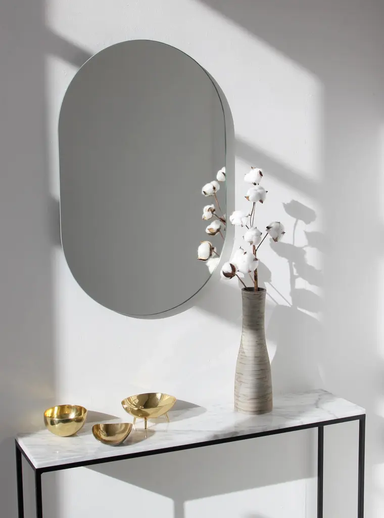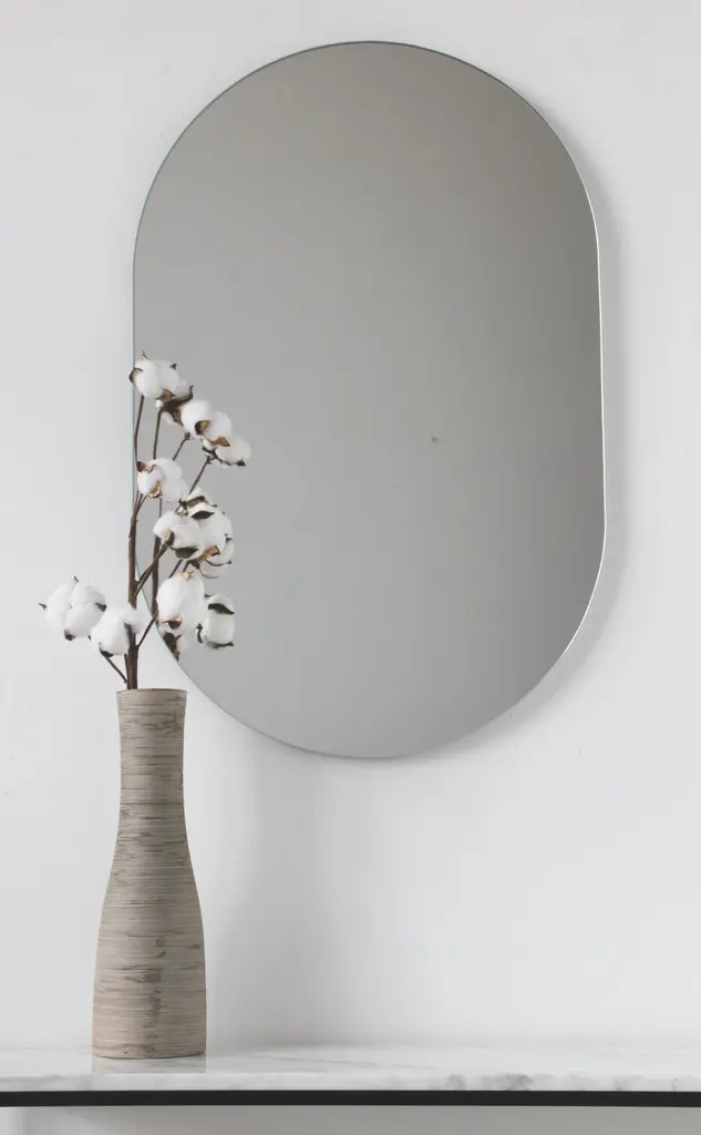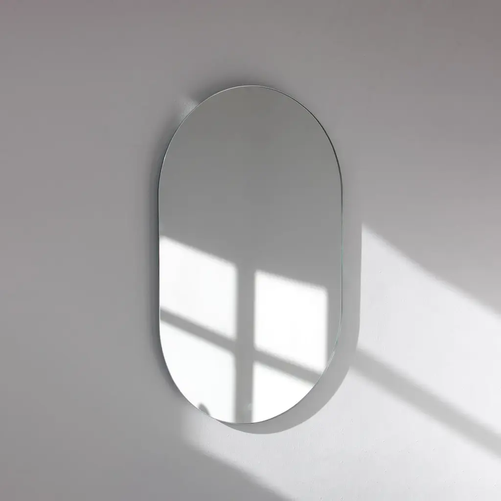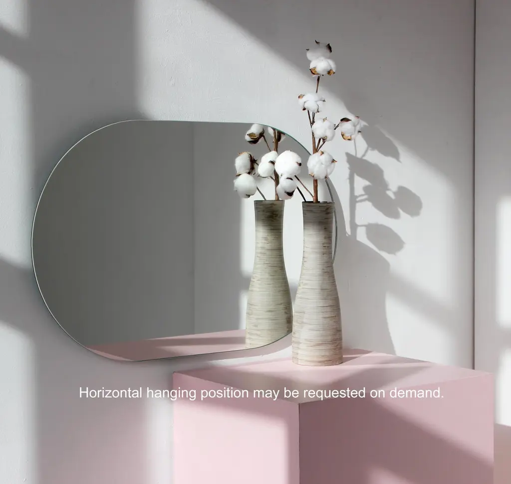 Minimalist capsule / pill shaped frameless mirror. Quality design that ensures the mirror sits perfectly parallel to the wall. Designed and made in London, UK.Fitted with professional plates not visible once installed for an easy and safe installation. Lined at the back with a quality protective film. Supplied with all accessories, including screws and wall plugs.This mirror is fully customisable. The mirror in the images show a medium size, measuring 37cm x 56cm x 0.6cm / 14.6'' x 22" x 0.24’’Note that the standard hanging position for this mirror is vertical. If you wish for the mirror to be hanged horizontally, please let our team know and we may adapt the hanging system.Shipped safely and insured worldwide. All our mirrors are made on demand. Fabrication lead time for this particular mirror is approximately 3 to 4 weeks. Our mirrors are always shipped by courier express. Shipping via courier express typically requires 1 to 2 days to the UK, or 2 to 7 days outside the UK depending on the destination.Available in the following sizes:Small: 27cm x 68cm x 0.6cm / 26.8" x 10.6" x 0.24"Medium: 37cm x 56cm x 0.6cm / 14.57" x 22.05" x 0.24"Large: 46cm x 71cm x 0.6cm / 28" x 18.1" x 0.24"Extra Large: 48cm x 97cm x 0.6cm / 18.9" x 38.2" x 0.24"or any bespoke dimension.Available options:- bevelling - back-illumination creating a halo effect - demister padPlease contact us for a quote for any bespoke specifications or added options.ORDERS OF MULTIPLE MIRRORS OF THE SAME TYPE: Please contact us to receive a Packing and Shipping quote when ordering multiple mirrors of the same type. An order for multiple mirrors of the same type may not be accepted without extra packing and shipping fees. Thank you.