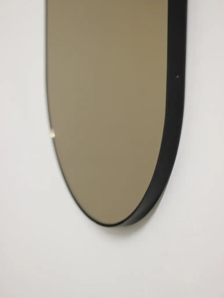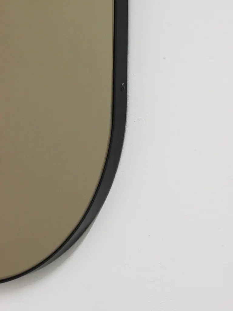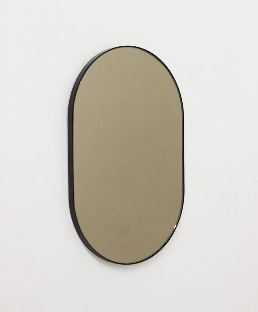 Modern handcrafted Capsula™ capsule / pill shaped bronze tinted mirror with an elegant black powder coated aluminium frame. Designed and made in London, UK. This mirror is fully customisable.Our mirrors are designed with an integrated French cleat (split batten) system that ensures the mirror is securely mounted flush with the wall. An alternative hanging hook or a Z-bar (depending on the size of the mirror) is available on demand for mirrors that need to be installed allowing some separation from the wall.The images show a medium size mirror, measuring 37cm x 56cm x 1.8cm / 14.6'' x 22" x 0.71’’Shipped safely and insured worldwide. All our mirrors are made on demand. Fabrication lead time for this mirror is approximately 4 to 5 weeks. Our mirrors are always shipped by courier express. Shipping via courier express typically requires 1 to 2 days to the UK, or 2 to 7 days outside the UK depending on the destination.Available in the following sizes:Small: 27cm x 68cm x 1.8cm / 10.6'' x 26.8'' x 0.71’’Medium: 37cm x 56cm x 1.8cm / 14.6'' x 22" x 0.71’’Large: 46cm x 71cm x 1.8cm / 18.1'' x 28" x 0.71’’Extra Large: 48cm x 97cm x 1.8cm / 18.9" x 38.2" x 0.71’’or any bespoke dimensions.Available options:- frame depth: 18mm / 0.71’’, 24mm / 0.94’’ and 30mm / 1.18’’- frame finish: brass (brushed, polished or with a bronze patina), copper, stainless steel, blackened stainless steel, or in a variety of colours- mirror tint: silver, bronze, black, rose gold / peach, blue or green- bevelling- back-illumination creating a halo effect- demister padPlease contact us for a quote for any bespoke specification or added options.ORDERS OF MULTIPLE MIRRORS OF THE SAME TYPE: Please contact us to receive a Packing and Shipping quote when ordering multiple mirrors of the same type. An order for multiple mirrors of the same type may not be accepted without extra packing and shipping fees. Thank you.