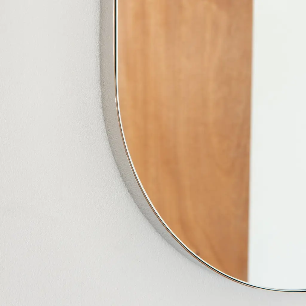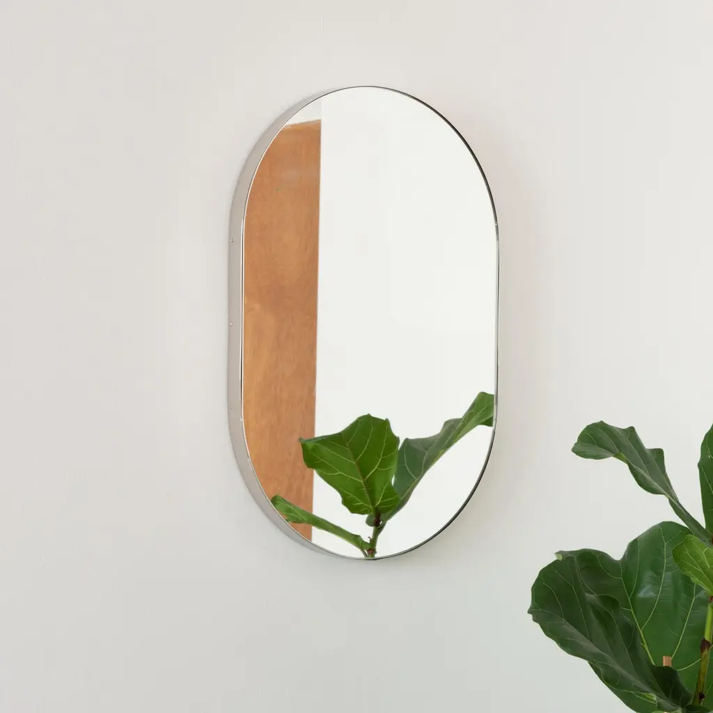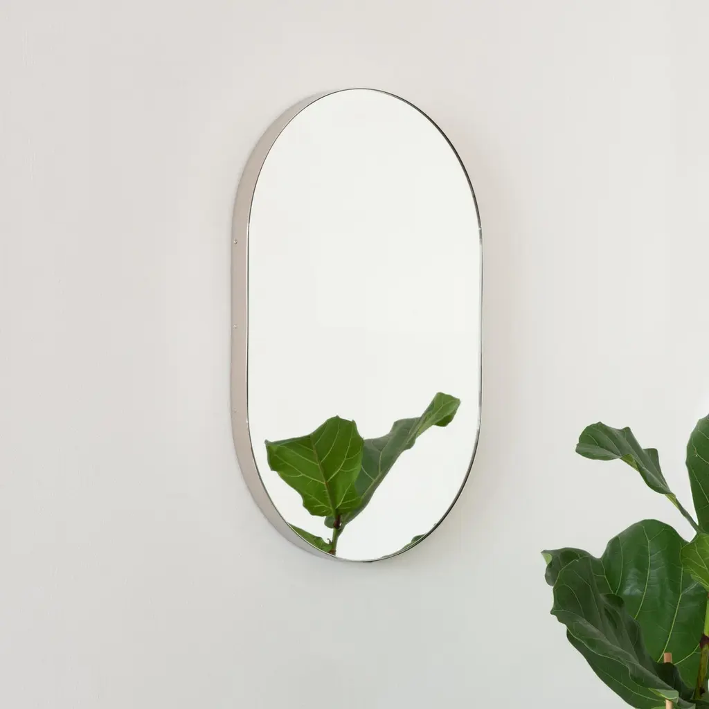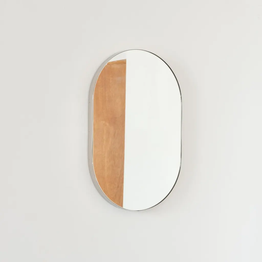 Delightful capsule shaped mirror with an elegant nickel plated frame. Designed and handcrafted in London, UK.Our mirrors are designed with an integrated French cleat (split batten) system that ensures the mirror is securely mounted flush with the wall. An alternative hanging hook or a Z-bar (depending on the size of the mirror) is available on demand for mirrors that need to be installed allowing some separation from the wall.The images show a medium size mirror, measuring 37cm x 56cm x 3cm / 14.6'' x 22" x 1.18’’ This mirror is fully customisable. Shipped safely and insured worldwide.ORDERS OF MULTIPLE MIRRORS OF THE SAME TYPE: Please contact us to receive a Packing and Shipping quote when ordering multiple mirrors of the same type. An order for multiple mirrors of the same type may not be accepted without extra packing and shipping fees. Thank you.