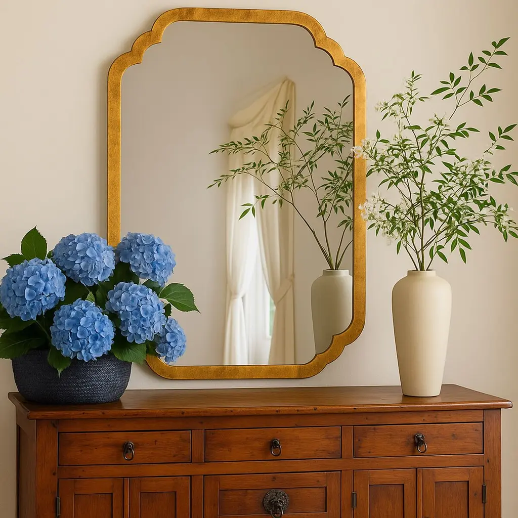 Scalloped corners and a gleaming gold-leaf finish add time-honored elegance to this rectangular wall mirror. Can be hung horizontally or vertically.