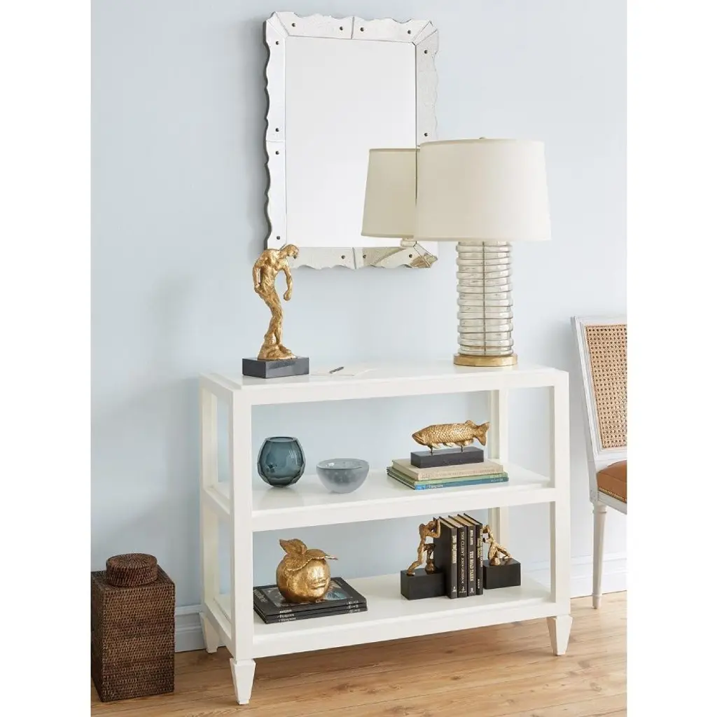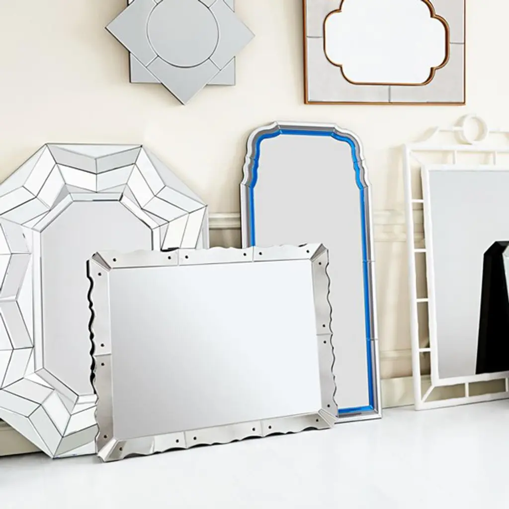 Reflected in this gorgeous wall mirror is the lavish vintage style of a Venetian deco boudoir. Featuring an antique style frame that is precision cut and beveled, the slight undulating curves of the frame juxtaposes superbly with brass cabochon accents and metallic gleam. Its relatively small size makes it perfect for your dressing room, landing, and formal spaces.