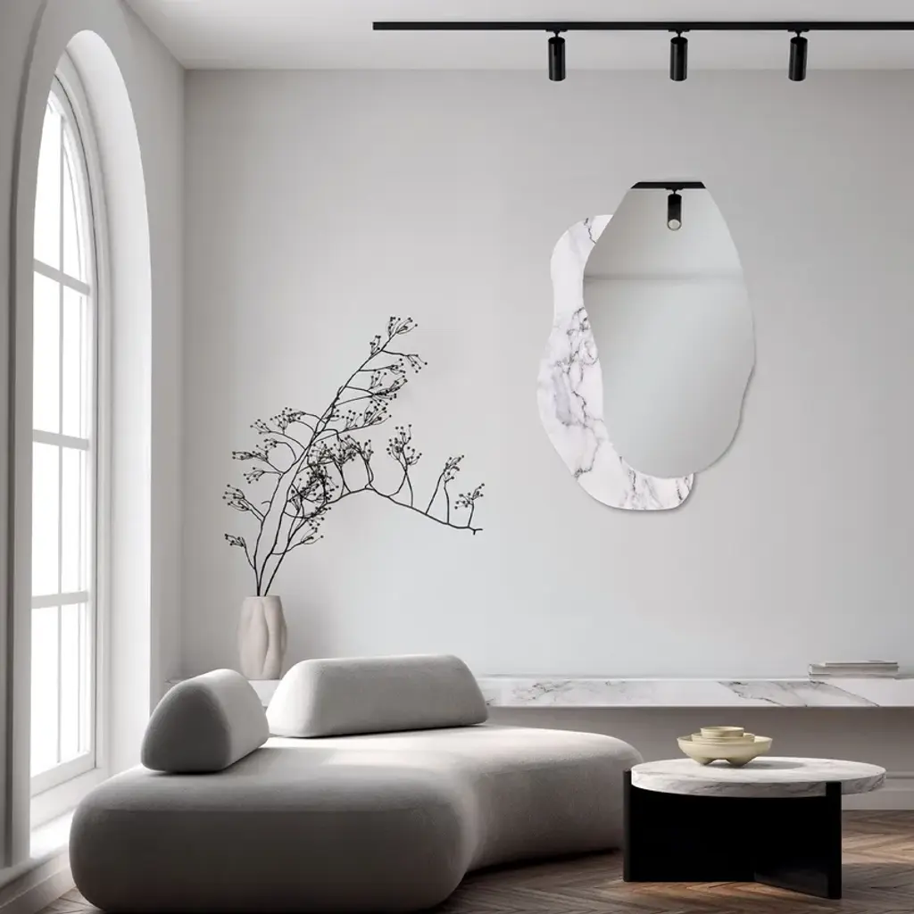 Carrara is a decorative mirror with an innovative design. Soft, sinuous curves are enhanced by a sophisticated section with a white marble finish. The irregular shape of this mirror, a perfect combination of functionality and artistic aesthetics, can give any setting a striking focal point.The AGAVE Art Mirrors collection was born from the desire to merge the art of painting with the functionality of mirrors into a unique and innovative piece of furniture: the Art Mirror. Launched in 2024 to celebrate the 15th anniversary of the AGAVE brand, this collection celebrates the excellence of contemporary art in interior design. These unique mirrors transform spaces into elegant and characteristic environments, perfect for design projects that require a distinctive touch. Discover how the AGAVE collection can enrich and enhance your projects with style and sophistication.