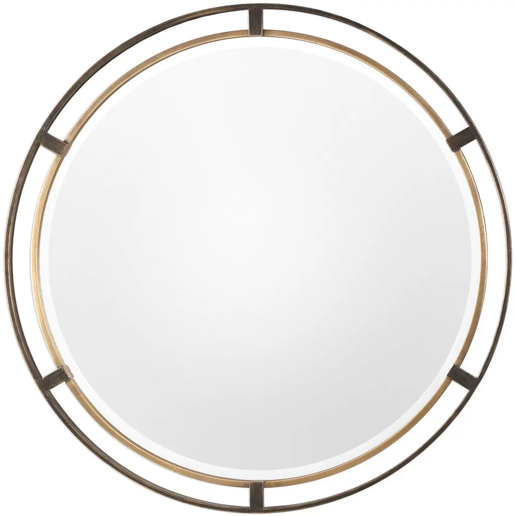 A distressed bronze finished iron frame offers a casual presence to this round beveled mirror that also boasts an inner antiqued gold frame. Versatility comes into play with style placement ... dress up a rustic setting or add a relaxed vibe to a traditional space.
