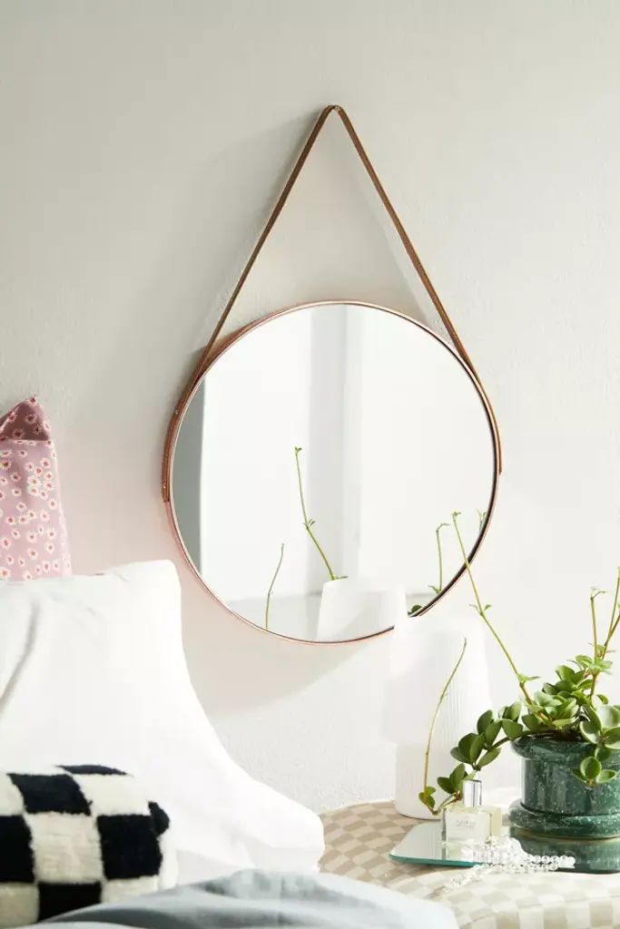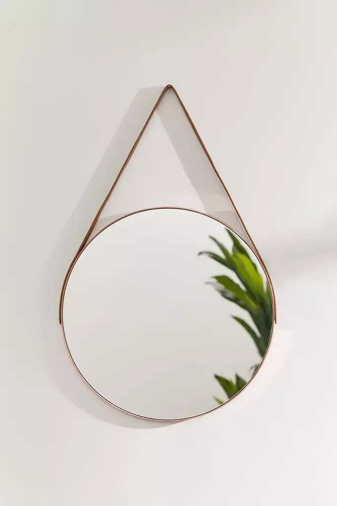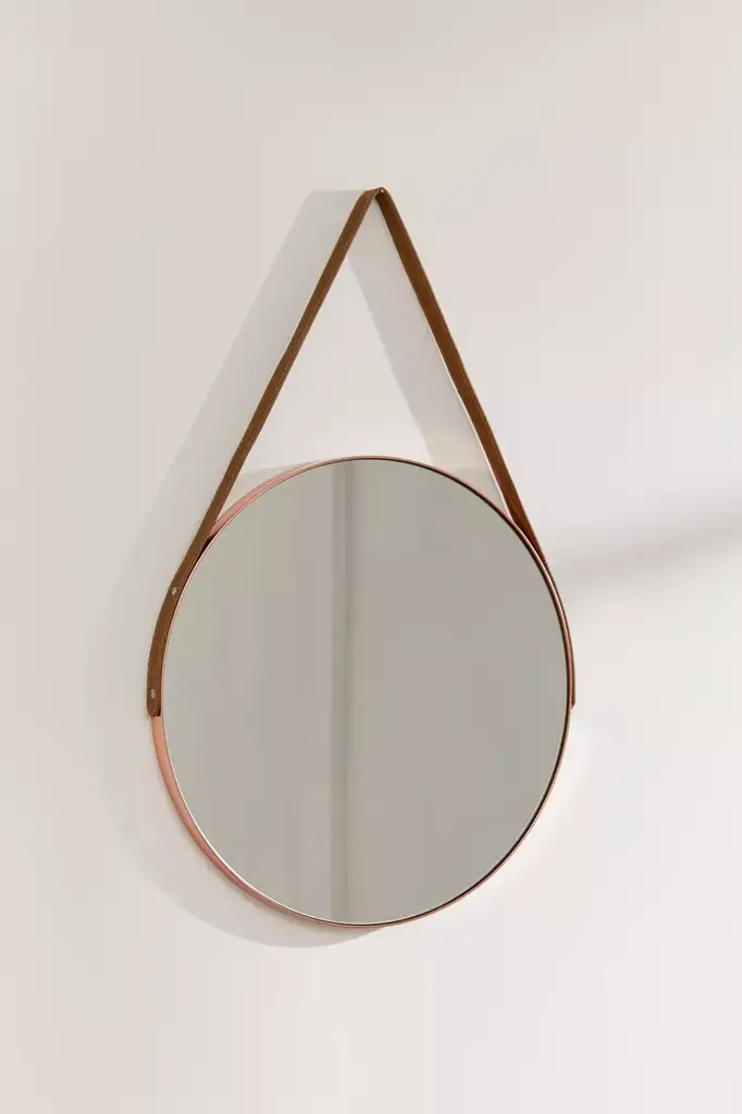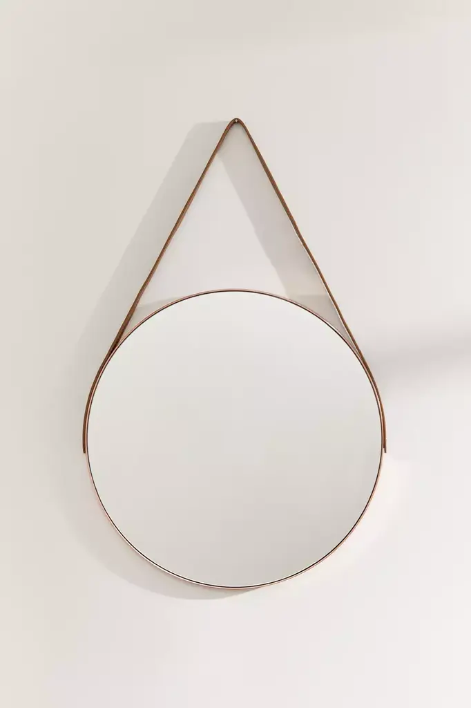 A refined take on an industrial look, this polished round mirror features a sturdy faux leather strap for hanging. Round mirror with a gleaming metal frame and bolted strap. Available exclusively at Urban Outfitters.