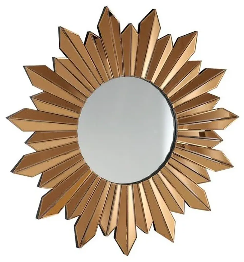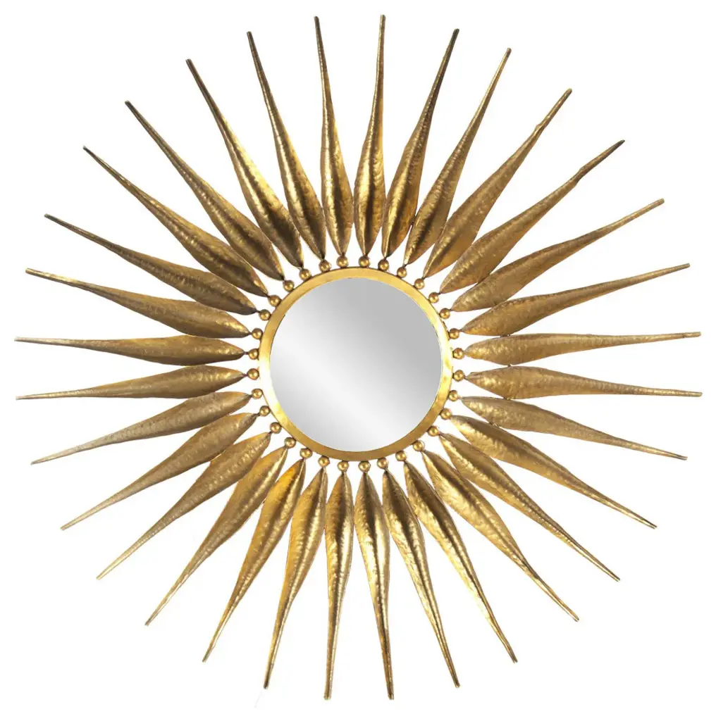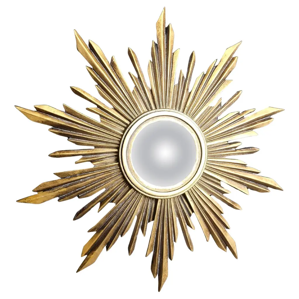 This mirror features a striking starburst pattern and is finished in a lovely silver leaf.Frame Dimensions: 32"W X 32"H X .5"DMirror Dimensions: 6"W X 6"HFinish: Silver LeafMaterial: ResinBeveled: YesShape: RoundWeight: 21Included: Brackets, Ready to Hang