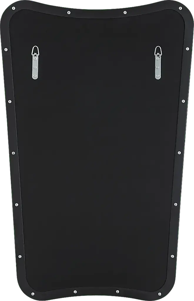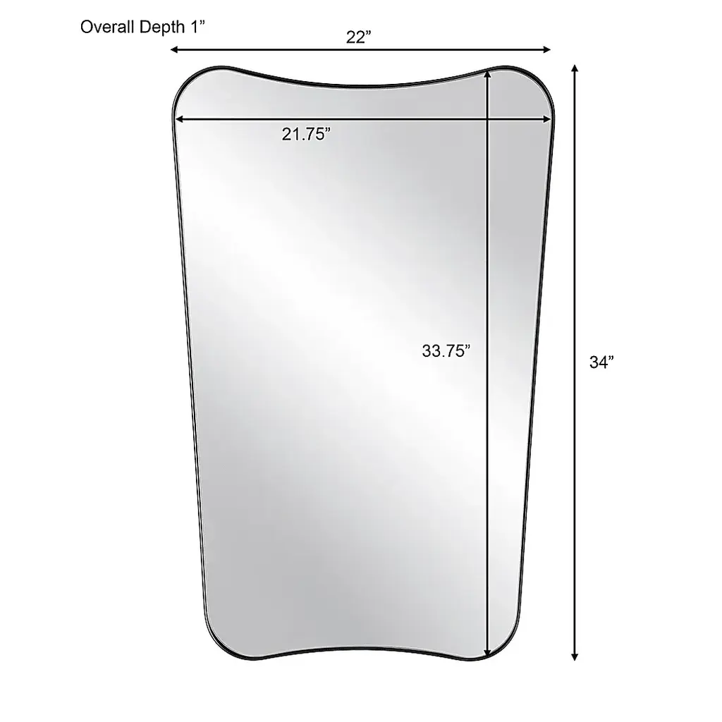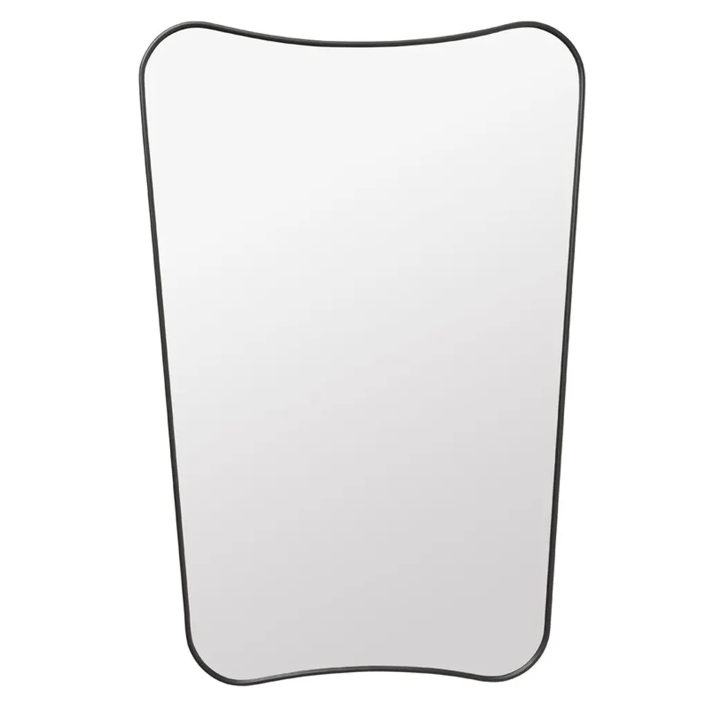 This Casina vanity mirror features a sophisticated iron frame finished in a sleek satin black, surrounding a floating polished-edge mirror. The curved silhouette adds a contemporary feel to this piece.