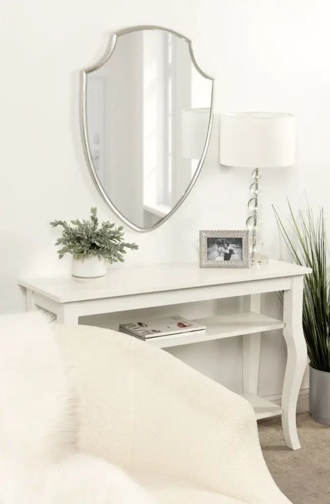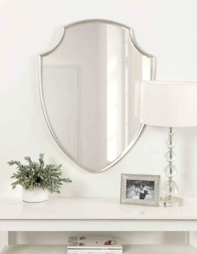 Shake up your home decor by introducing the Caskill mirror to your wall. Inspired by the ingenuity of traditional style, this sophisticated wall mirror has an irregular shield shape, presenting a symmetrical yet visually striking piece of wall decor. The shield-shaped frame is complemented by a beautiful silver finish along its edge, invoking luxurious glamour through its dazzling shine. It is a fantastic focal point to unify your wall decor, measuring 24 inches wide by 32 inches tall, the perfect size to attract your guests and create a unique conversation piece. The large surface area of this accent adds more function beyond decor: it''s also an excellent way to open up your smaller spaces by enhancing the vibrancy and dimension of the room. Use the Caskill to create warm and comforting dining room, living room, entryway, or bedroom decor. If you''re planning on a bathroom decor refresh, the Caskill is also great as a bathroom mirror above your single or double vanity. Hang this lovely decor piece in only a matter of minutes with metal D-ring hangers attached to the back of the frame.• Traditional Design: The Caskill mirror is the perfect piece of vintage home decor to dazzle your guests, featuring a shield shape that brings traditional and glamorous aesthetics to the forefront• Glamorous Finish: This unique wall mirror''s shield-shaped frame features a beautiful silver finish, creating a sleek chrome look that captures the eye on any wall• Large Size: Indulge in a robust look that makes a statement with the Caskill''s large size, measuring 24 inches wide by 32 inches tall for any wall in your home• Versatile: The lovely Caskill mirror''s large size and vintage style look excellent as a glamorous bathroom vanity mirror or a dazzling wall decor focal point in the living room, bedroom, or entryway• Easy to Hang: To allow for a seamless installation process, D-ring hangers are attached to the back of the Caskill''s frame for quick and easy wall mounting in a matter of minutes