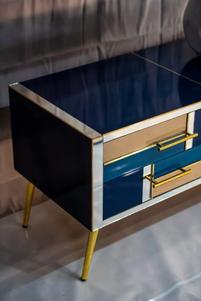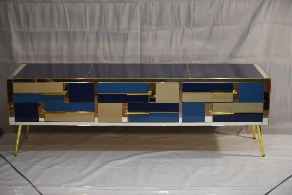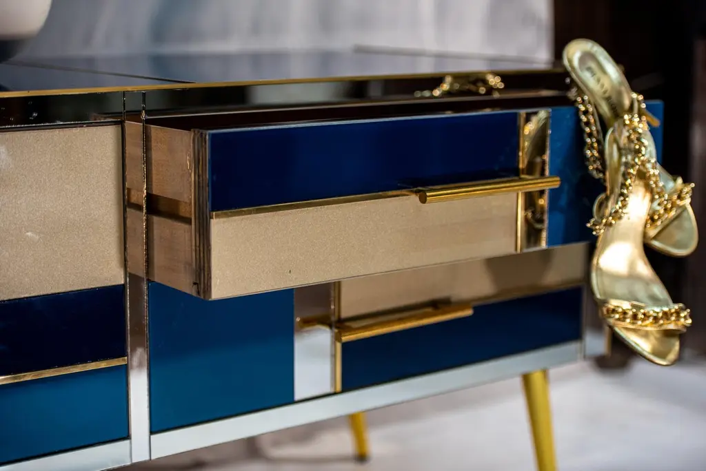 Scopri la nostra esclusiva cassettiera artigianale, un vero gioiello dell'arte italiana. Ogni dettaglio di questo mobile è frutto di un'abilità artigianale senza pari: i sei cassetti sono realizzati a mano in vetro, con tagli di una raffinata tonalità di blu zaffiro, oro e blu notte, alternati con delicati specchi. Le rifiniture in ottone aggiungono un tocco di lusso e raffinatezza al design. Questa splendida cassettiera, creata interamente a mano in Italia, incarna la tradizione artigianale italiana. Perfetta per chi desidera arricchire il proprio ambiente con un mobile unico e di alta qualità. Aggiungi un tocco di eleganza e sofisticatezza alla tua casa con questa creazione distintiva e senza tempo.