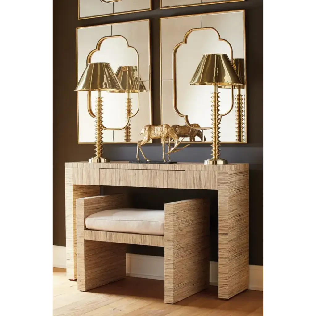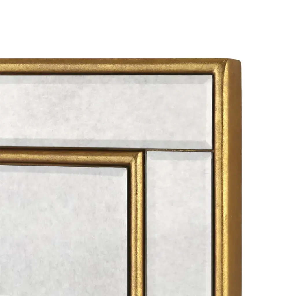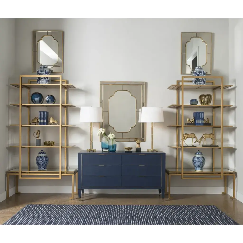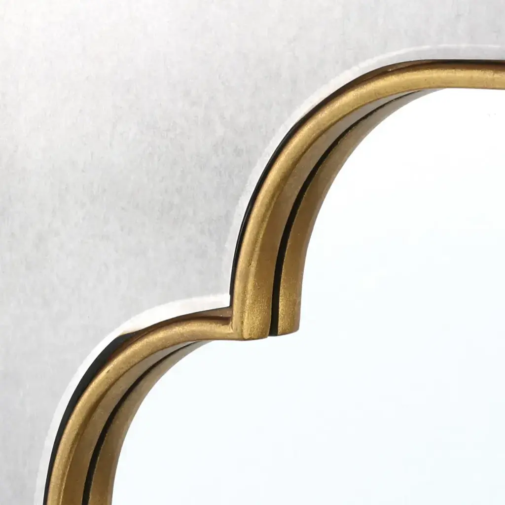 There’s no question that the Cassia Mirror exudes glamour, from its gilded accents to its decorative shape. At its center, the mirror itself is an elongated quatrefoil, combining elements of classic European and Arabic design, while its beveled gold-leafed borders and glass tile frame nod to the opulence of the Art Deco movement. A vintage finish on the outer glass adds to the sense that the Cassia could be an antique from the 1920s, though its overall resplendence certainly transcends time.