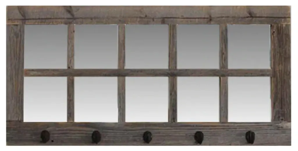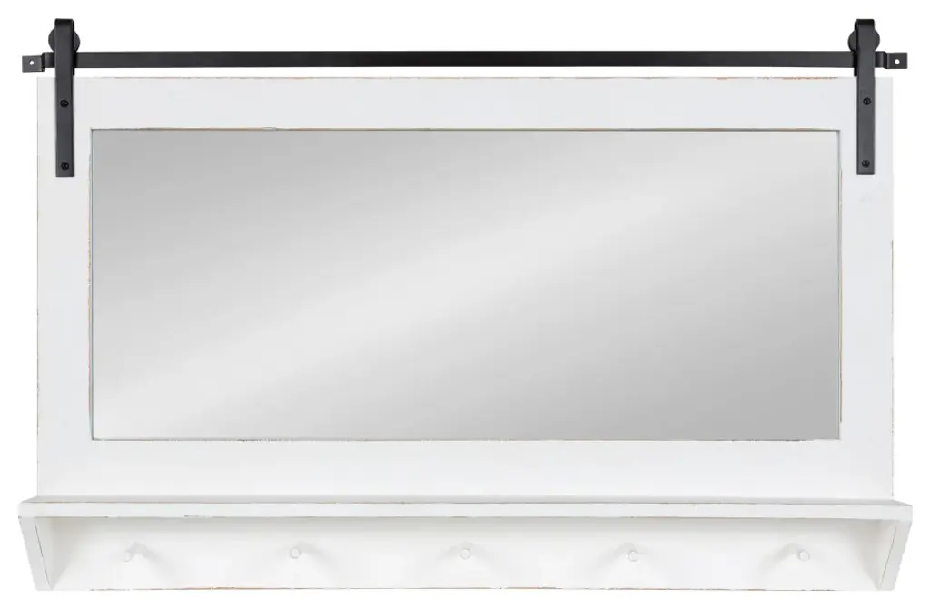 Decorate your home with farmhouse functionality by incorporating the Cates pub mirror into your wall decor. Inspired by rustic design, the Cates pub mirror has a barn door-inspired door with a wooden frame hanging from metal brackets. This wooden frame is crafted from robust, solid wood, while the metal brackets are crafted from rich iron to offer secure hanging. The distressed white finish on the solid wood frame also lends itself to vintage style that offers coastal coziness in any space of your home. The overall dimensions of this shelf are 41.5 inches wide by 4.25 inches deep by 26.75 inches tall. However, this mirror isn''t purely aesthetics, as it also features a full shelf and five hanging pegs. The shelf is 40 inches wide by 3.5 inches deep, giving you plenty of space to hold household necessities and display small decor accents. The five hanging pegs are excellent for hanging pet leashes, light jackets, and small backpacks. Hang the bold Cates pub mirror in a matter of minutes using the pre-drilled holes in the iron brackets. • FARMHOUSE INSPIRATION: The Cates mirror features a barn door-inspired design and a distressed finish to give it that vintage, rustic look • QUALITY MATERIAL: The Cates is crafted from robust solid wood with iron barn door brackets to emphasize the high-quality farmhouse style • LARGE SIZE: The overall dimensions of this horizontal wall mirror are 41.5 inches wide by 4.25 inches deep by 26.75 inches tall, fitting in the entryway, bedroom, bathroom, or living room• MULTIFUNCTIONAL: Not only does the Cates add vibrancy and dimension to your space, but also offers a shelf and five hanging pegs for display accent pieces and hanging light jackets, pet leashes, and more• EASY TO HANG: The pre-drilled holes in the back of this mirror makes wall installation quick and efficient, allowing this lovely accent piece to be ready for mounting in a matter of minutes