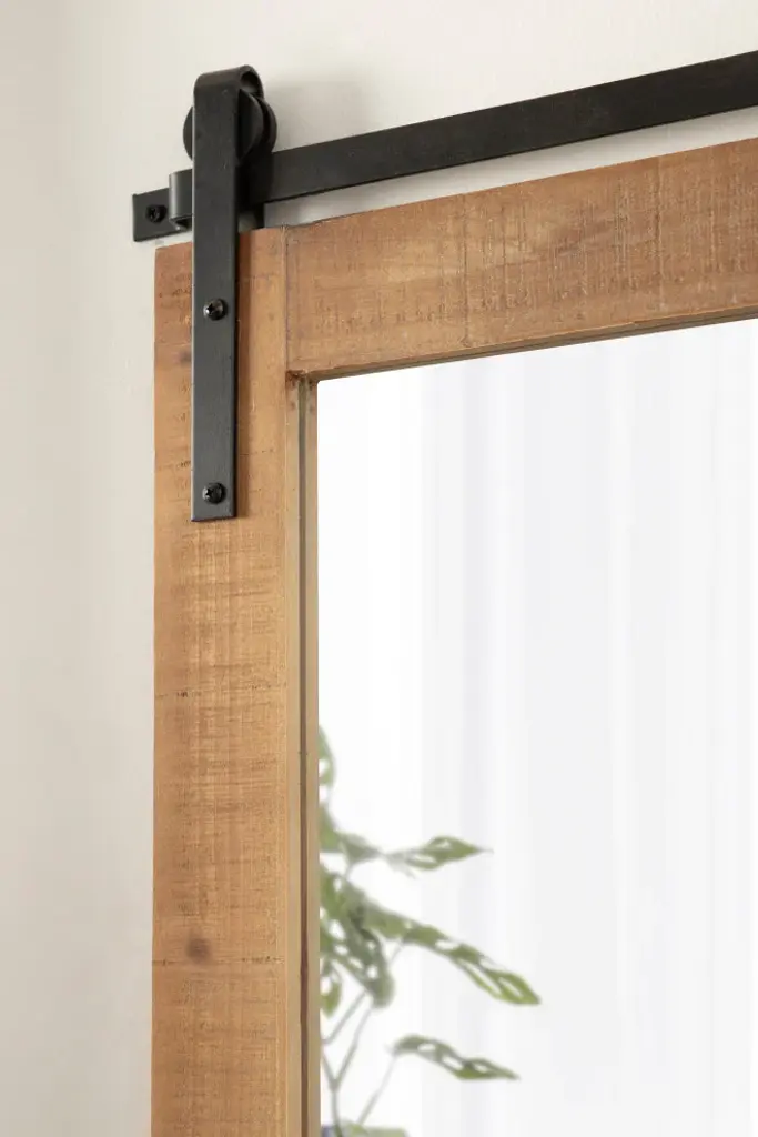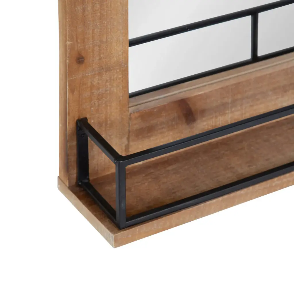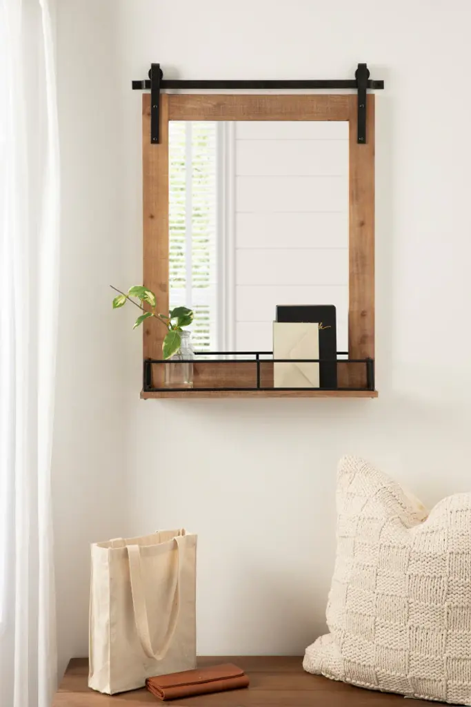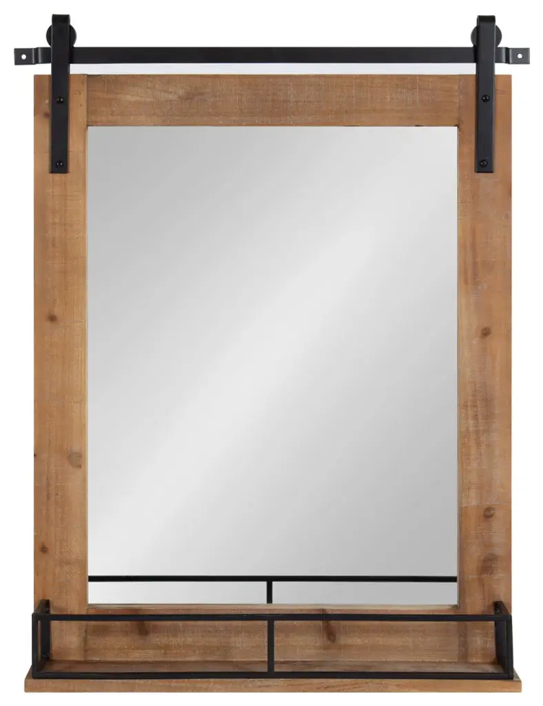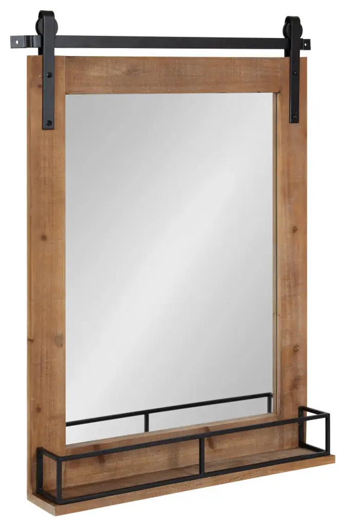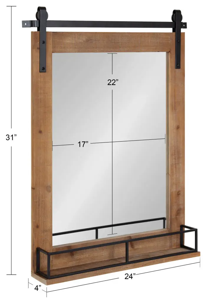 Create the cozy farmhouse home of your dreams with the multifunctional Cates mirror. This lovely wall mirror embraces the rustic stylings of vintage design, with a barn door design and a hand-distressed rustic brown finish on the frame. The rectangular frame of the Cates wall mirror is crafted from robust solid wood, while the metal hanging bracket is made with rich, rustic iron. The overall dimensions of this excellent piece of home decor are 24 wide by 4 inches deep by 31 inches tall, making it a fantastic element to introduce to your bathroom, living room, dining room, or entryway. Not only does the Cates wall mirror feature a large mirror surface, but it also includes a functional metal shelf that is 4 inches deep. This multifunctionality allows you to use this wall mirror for more than aesthetics: you can use this wide shelf to showcase your favorite succulents, store household necessities, act as a small medicine shelf, or display your favorite photos! With the versatile styling and multifunctional design, this beautiful mirror is a fantastic showcase of what you can do with your home decor. Use the pre-drilled holes located in the iron frame to install the Cates in a matter of minutes. • RUSTIC DESIGN: The barn door-inspired design combined with the hand-distressed rustic brown finish make the Cates wall mirror a dynamic and sophisticated piece of farmhouse decor for any room• QUALITY MATERIAL: The rectangular frame of this mirror is crafted from robust, solid wood, while the hanging mechanism comes from rich iron to deliver the ultimate rustic look• LARGE SIZE: The dimensions of the Cates mirror are 24 inches wide by 4 inches deep by 31 inches tall for use as bathroom decor above your vanity or as an accent piece in the living room or entryway• MULTIFUNCTIONAL: While the reflective glass surface of this mirror is fantastic for making your space feel more open, its attached shelf is perfect for showcasing decor and storing household items• EASY TO HANG: The iron hangers feature pre-drilled holes for secure mounting and installation in a matter of minutes