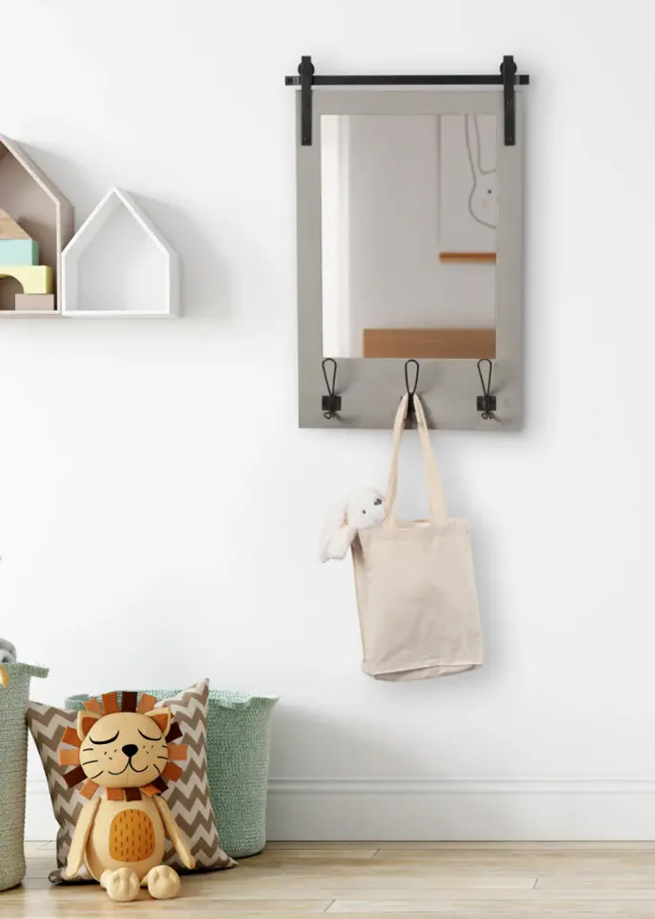 Cates Wood Framed Wall Mirror With Hooks, Gray, 18x28