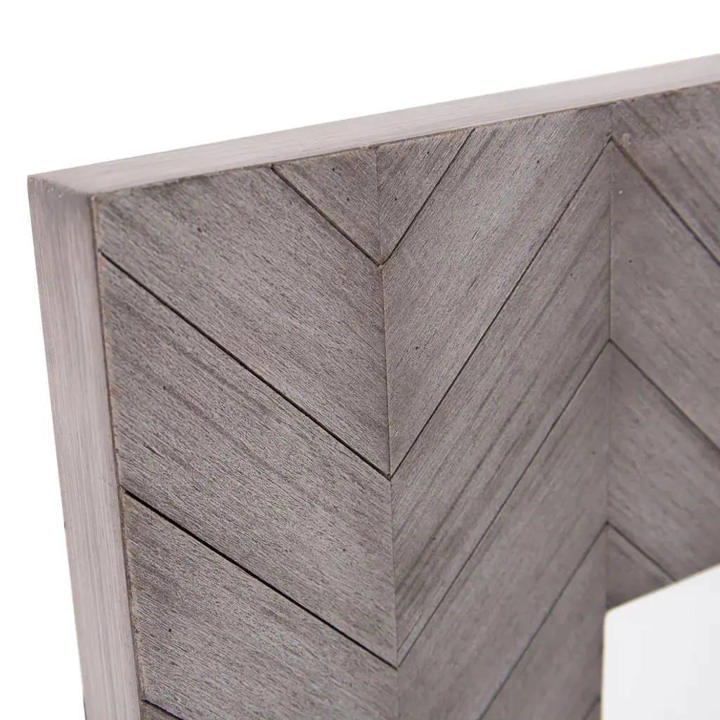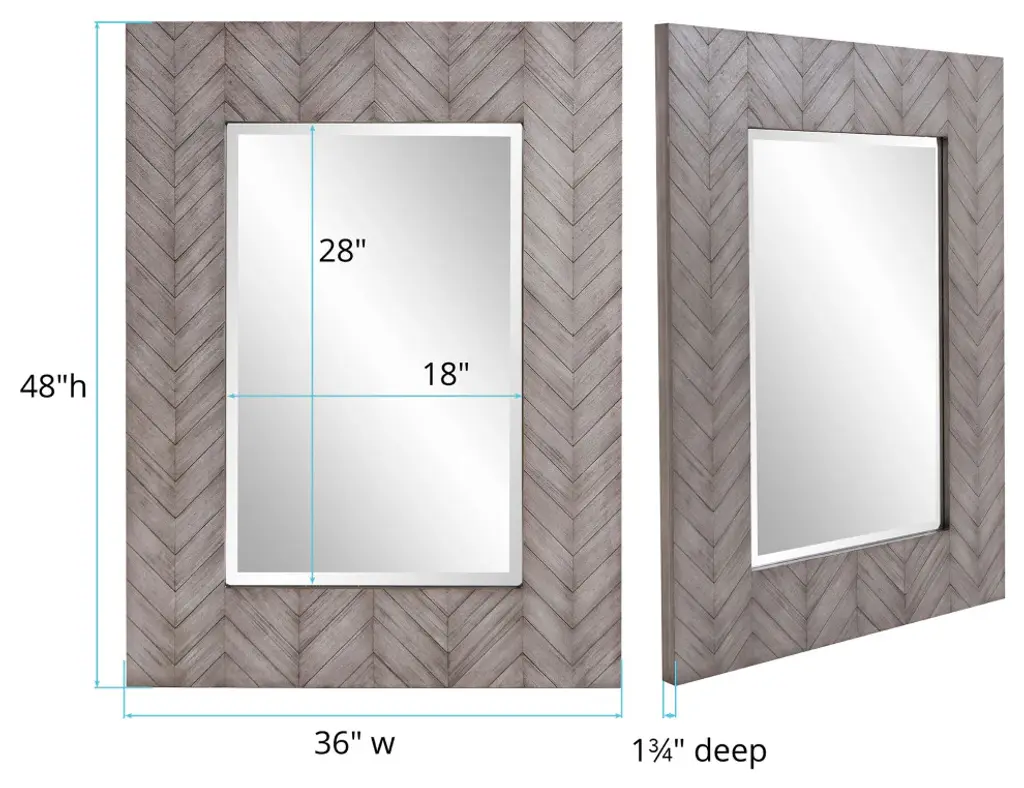The Cavalier Mirror features a rectangular wood frame detailed with a chevron pattern. It is finished in a gray wash that adds a subtle color to the piece while letting the natural characteristics of the wood shine through. It is a perfect focal point for an entryway, bathroom, bedroom or any room in your home. D-rings are affixed to the back of the mirror so it is ready to hang right out of the box in a horizontal or vertical orientation! The mirrored glass on this piece has a bevel adding to its beauty and style.
