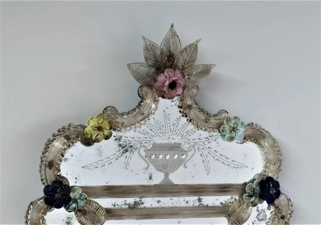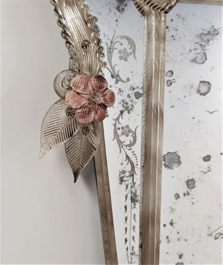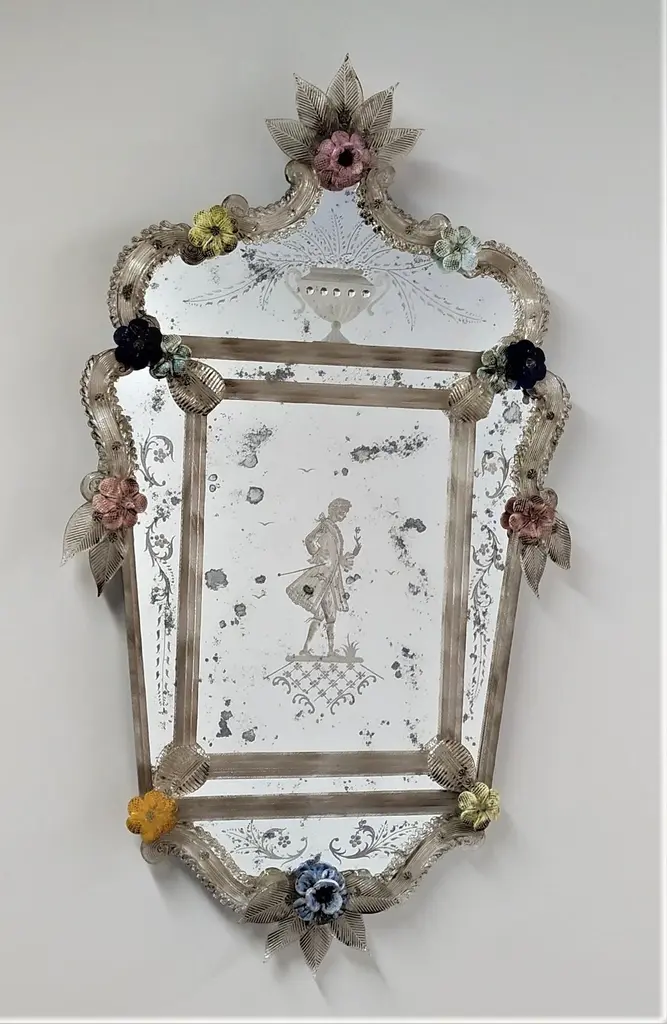 Riproduzione di uno specchio Antico Veneziano del XX secolo, anticato, inciso e lavorato a mano, con cornice e foglie in colore cristallo antico, fiori in pasta vitrea multicolor in vetro di Murano, realizzato secondo le antiche tradizioni dei maestri vetrai muranesi.Al centro dello specchio una meticolosa ed accurata incisione di un Cavaliere Veneziano, tutto lo specchio è antichizzato quasi da sembrare originale realizzato dalle mani esperte dei Fratelli Tosi nell'Isola di Murano, azienda che produce ancora seguendo le antiche tecniche degli specchieri del passato, un'eccellenza nell'isola di Murano.