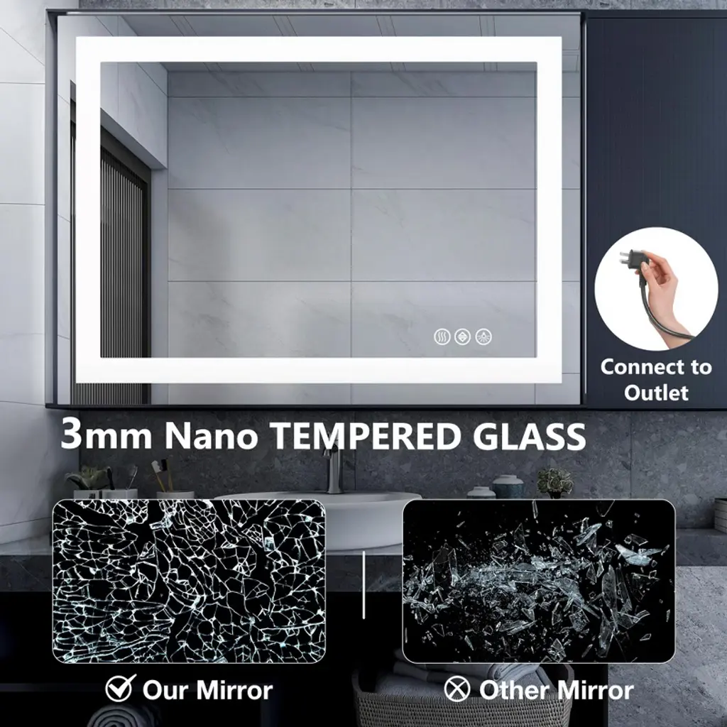 Enhance your bathroom experience with this sleek and functional LED bathroom mirror. Featuring an anti-fog function, you can easily activate it with a single press, ensuring a fog-free reflection. With three customizable lighting modes—warm light (3000K), natural light (4000K), and white light (6500K)—you can tailor the lighting to suit your needs. Choose between backlit, front lit, or both light sources for a truly customized lighting effect. The adjustable brightness feature lets you fine-tune the intensity from 15% to 100%. The mirror also includes a memory function, remembering your last settings for convenience. Constructed with durable 3mm nano glass, this mirror offers clarity, sturdiness, and explosion-proof safety for a reliable bathroom accessory.