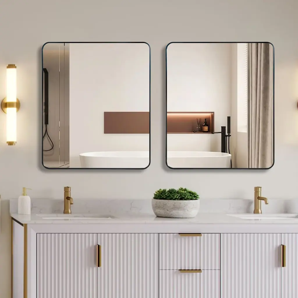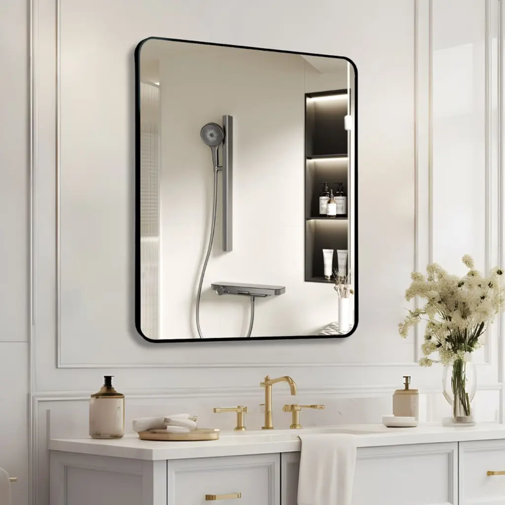 Add a touch of elegance and whimsy to your space with this 30x36-inch rectangular bathroom mirror. Designed for modern and contemporary rooms, the mirror features high-quality 4mm HD glass that provides a clear, distortion-free reflection. The premium brushed metal frame is made of anti-rust aluminum alloy, ensuring durability and style. The mirror is equipped with a shatterproof film and density board for added safety, reducing the risk of breakage. It comes with reinforced hooks, screws, and a clear installation manual, making it easy to mount on your wall. Perfect for bathrooms, living rooms, or any modern setting.