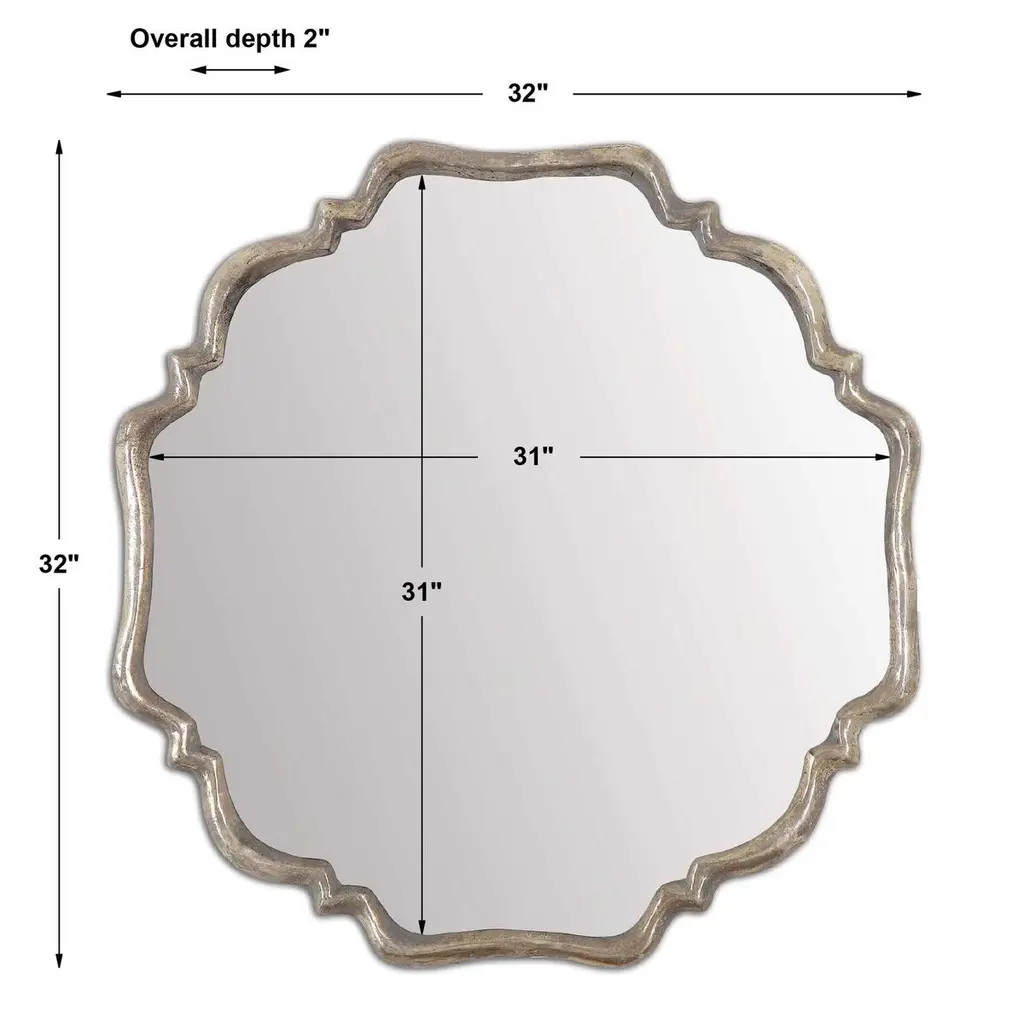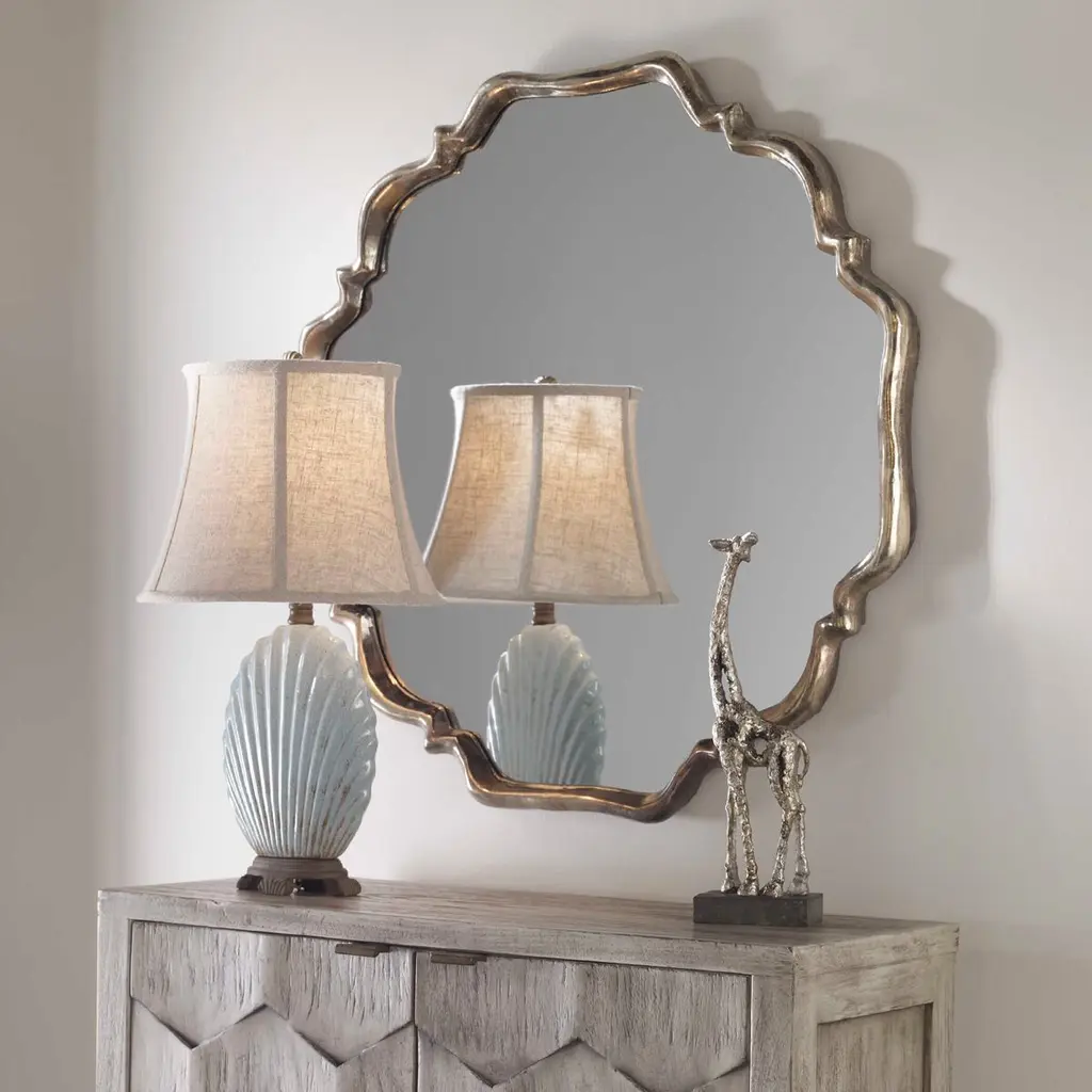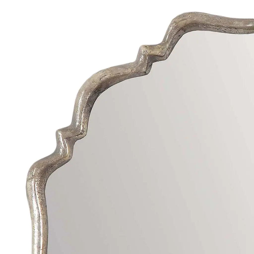This shapely mirror features a frame with a plated, oxidized silver finish and a rust gray wash.