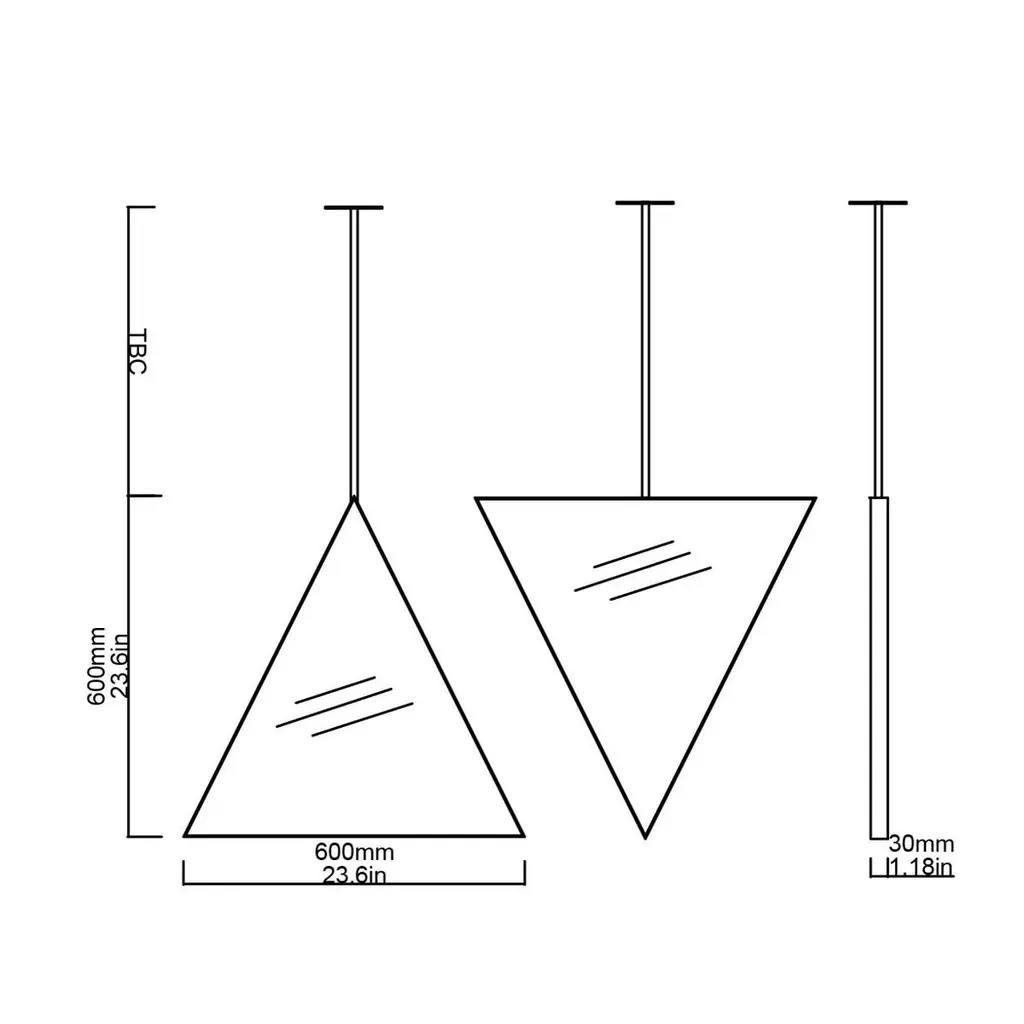 Original ceiling suspended triangular mirror with an elegant solid brushed brass frame. Our unique collections of ceiling suspended mirrors are designed and handcrafted in London, UK, and are therefore fully customisable to suit the specific requirements of your interior.Mirror dimensions: 600mm (23.62") High x 600mm (23.62“) Wide x 30mm (1.18") DeepMirror drop: Customisable – a drop greater than the height of the mirror may lead to price adjustment. Please contact our team for information.The high quality finish of our suspended mirrors extends to their backings, which are made from a powder coated panel available in black or white. Backings can also be upgraded to a finish that matches the frame (as illustrated in the pictures) or can be substituted by a second mirror, making your mirror double sided.The ceiling plate is supplied with a cover hiding the screws to complete the minimalist design of the mirror.Shipped safely and insured worldwide. All our mirrors are made on demand. Fabrication lead time for this mirror is approximately 6 to 7 weeks. Our mirrors are always shipped by courier express. Shipping via courier express typically requires 1 to 2 days to the UK, or 2 to 7 days outside the UK depending on the destination.Available options:•double sided mirror•backing in a finish that matches the frame•frame finishes: brass (brushed, polished or with a bronze patina), copper, stainless steel, blackened metal, powder coated aluminium in a range of standard or bespoke colours•full frame that extends to the front of the mirror•mirror tints: standard silver, black, bronze, blue, rose gold / peach•back-illumination creating a halo effect•front-illumination around the periphery of the mirror•ON/OFF sensor switch•demister pad•bevelA presentation illustrating the options above is also available on demand. Please contact us for a quote for any bespoke specification or added options.IMPORTANT NOTES:-This suspended mirror is intended to be mounted onto the ceiling and cannot be installed onto a countertop. Countertop mounted mirrors are available on demand.-The illumination offered with our mirrors is decorative or intended to create mood lighting in the room that they are installed in.ORDERS OF MULTIPLE MIRRORS OF THE SAME TYPE: Please contact us to receive a Packing and Shipping quote when ordering multiple mirrors of the same type. An order for multiple mirrors of the same type may not be accepted without extra packing and shipping fees. Thank you.
