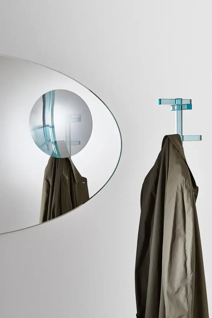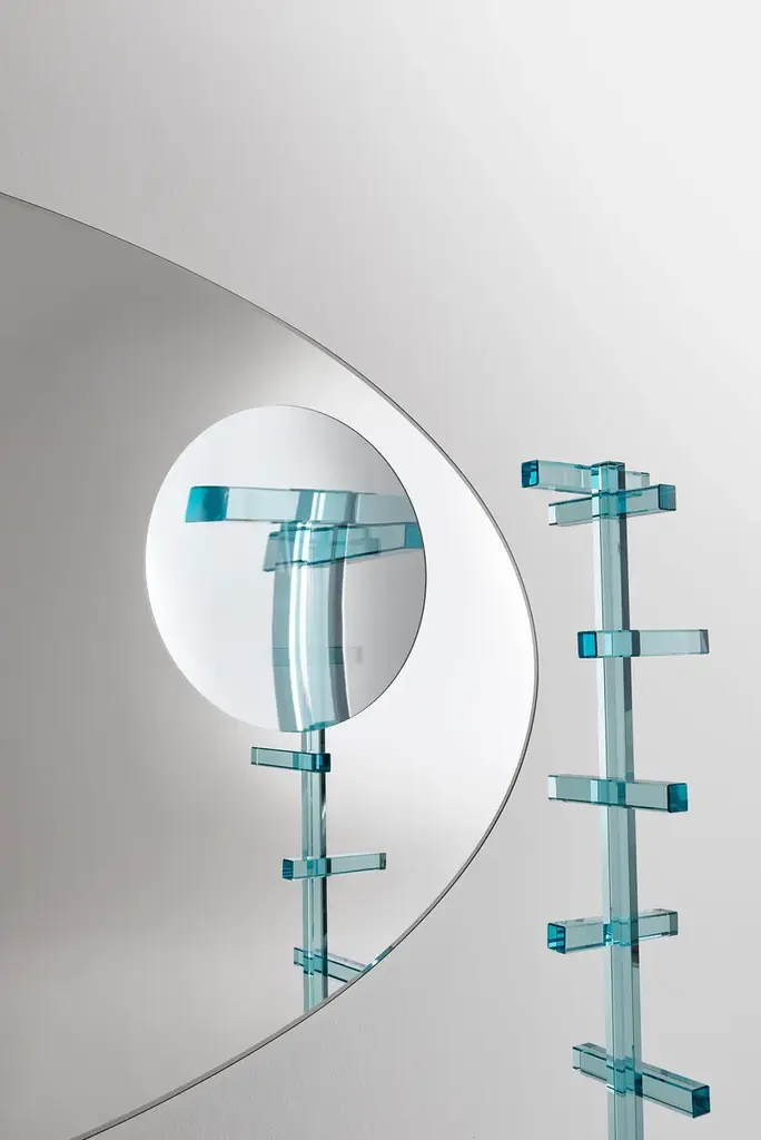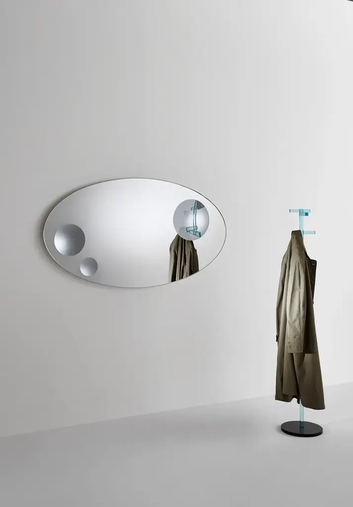 Celeste is a 5mm extralight mirror available in round or oval shapes. The mirror assumes a magnetic aspect creating surreal effects thanks to three magnifying portholes fixed on a flat surface with each porthole having a different diameter and different degree of magnification. The mirror has a delicate bevelled edge on its perimeter under the silvered surface to refine and enhance the beauty of this object.