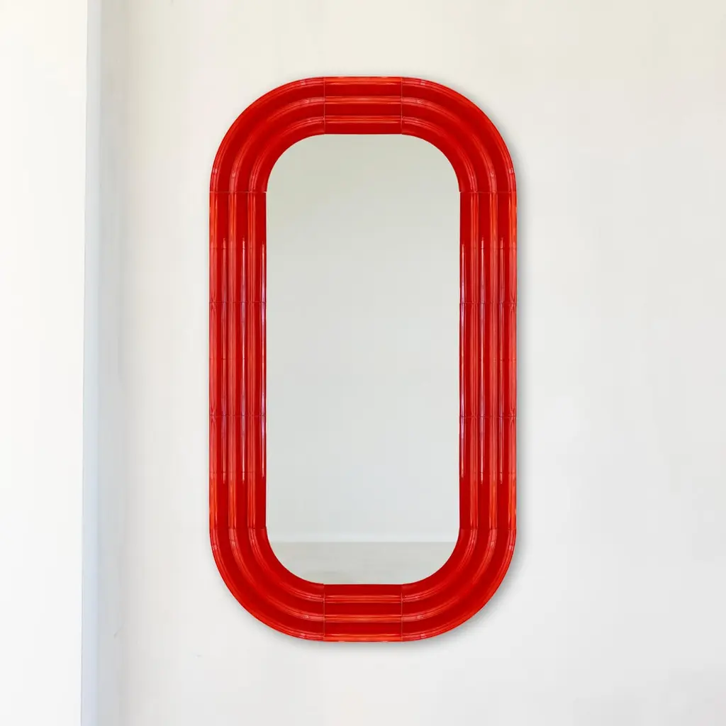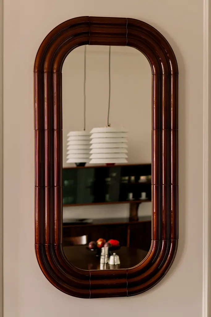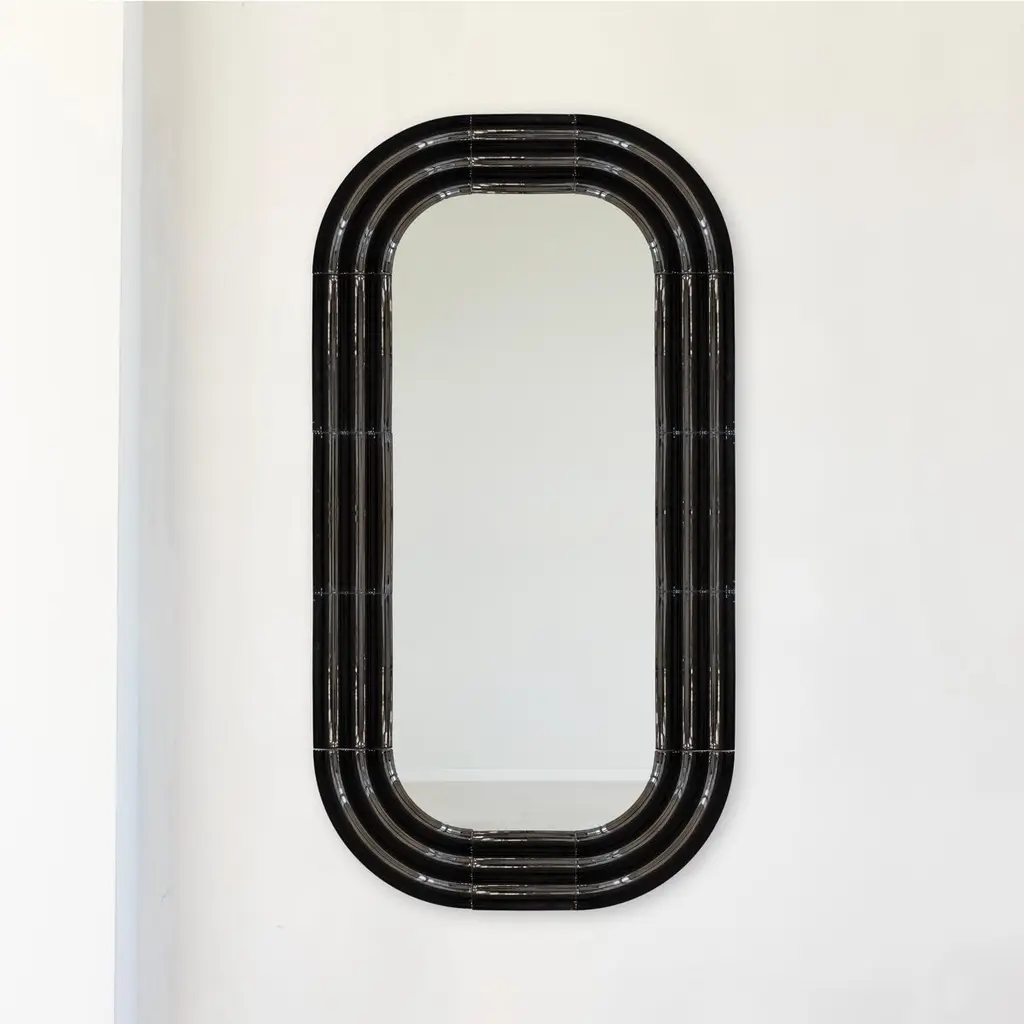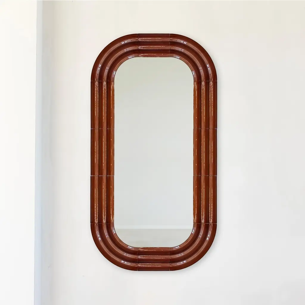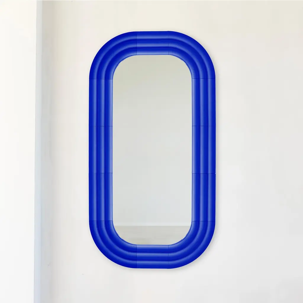 In the ELO mirrors collection, Pani Jurek explores ceramics and the reflective potential of mirror surfaces. Inspired by the ripple effect on water, the sculptural frames mimic the expanding circles that appear after a splash. The ceramic elements are airbrushed glazed by hand, which gives them a unique, artisanal character. The name "ELO" is a playful nod to Polish slang for "hello," referring to the greeting between you and your reflection in the mirror.Object dimensions: 150 x 80 x 4 cm / 59 x 31,4 x 1,58"Mirror dimensions: 120 x 50 cm / 47,2 x 19,7"Material: hand-glazed ceramicPani Jurek straddles the border between fine arts, craft and design. Applied art objects are created in an artisanal manner. The brand was established in 2010 by Magda Jurek, artist and designer. A painting graduate, she thinks of her objects as signs, sculptures or installations, treating them also as tools for building abstract compositions. Utility forms can also be a means of expression, like colors, stains, textures, shapes. The social projects and non-commercial initiatives, in which she willingly engages, serve not only as tools to make the world a little bit better but they often become the trigger for the creation of usable products.Pani Jurek's objects go beyond conventional functions. Interactivity is their inherent feature. Conceived as part of a composition, they are designed in response to their surroundings and the people who use them. However, the usability of Pani Jurek's products is never neglected. The possibilities are tamed by ergonomics and material.Fascination with the material, mostly ceramics and respect for its possibilities and limitations is visible in all of Pani Jurek's products. All objects are produced on site in Pani Jurek’s manufacturing studio, mostly by hand, under the designer’s vigilant eye.