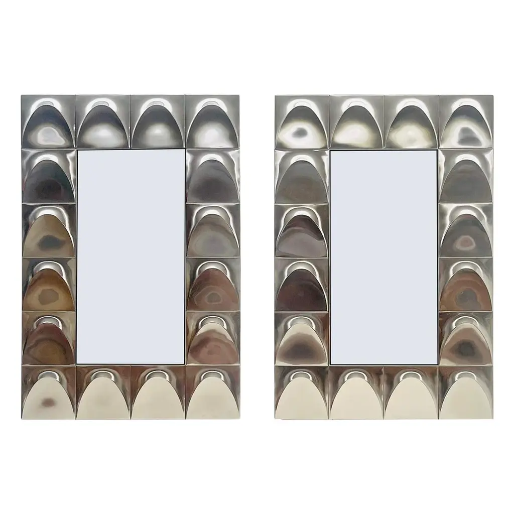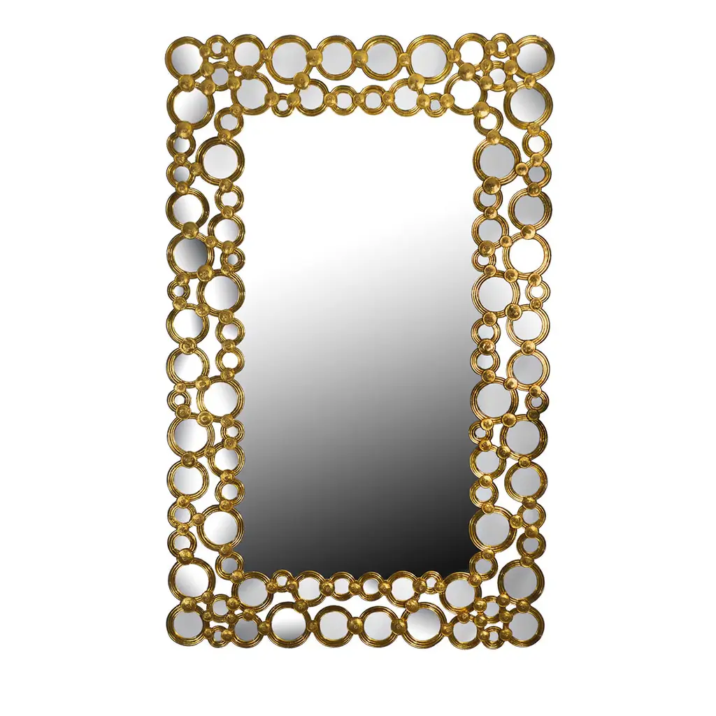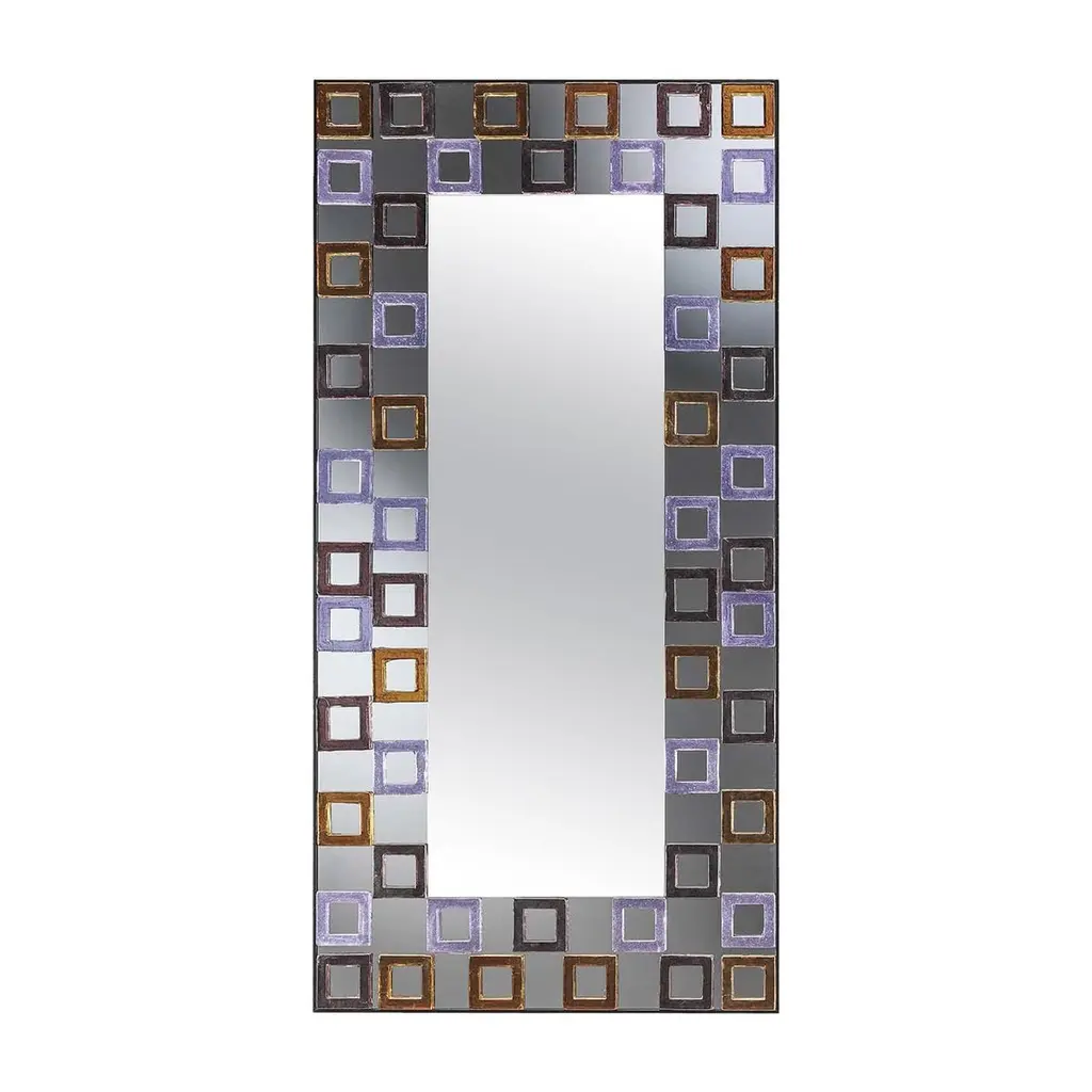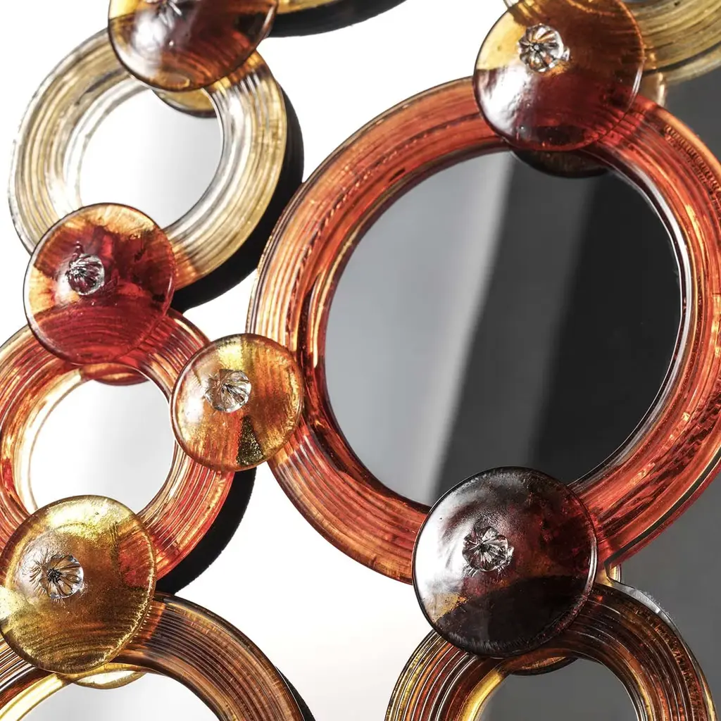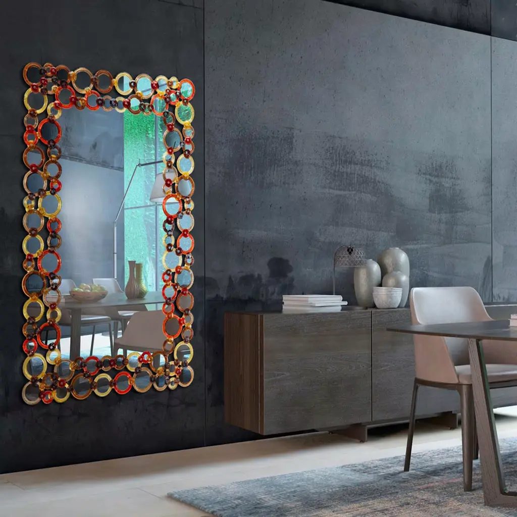 Part of the Cerchi collection (circles in English), this stunning mirror is a modern interpretation of traditional Venetian artifacts. The rectangular frame of this piece comprises a series of round elements of different sizes that are applied on the mirror and enclosed in differently colored mouth-blown Murano glass frames. This stunning decorative piece will enrich an entryway or living room, a bedroom or powder room with unique flair.