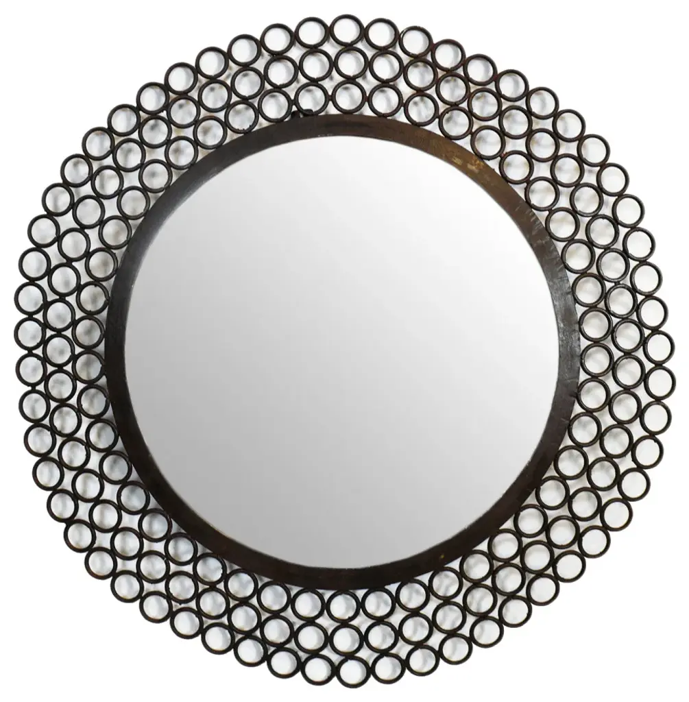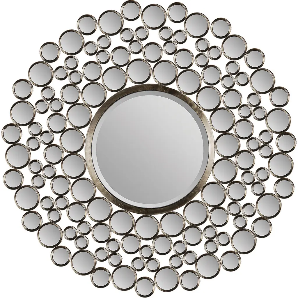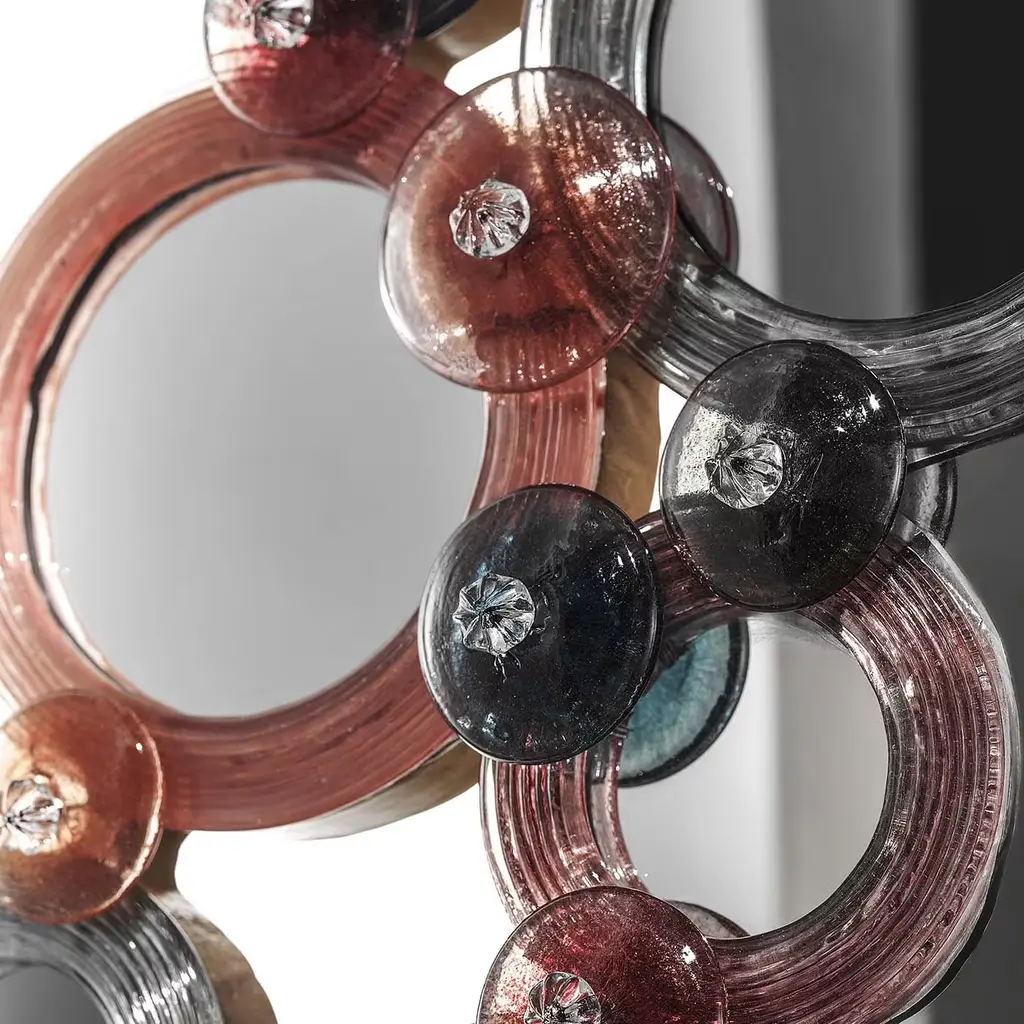 This stunning decorative mirror plays on the geometric element of the circle to create a superb modern piece that will add sparkling reflections and a colorful accent to a contemporary home. The round shape of the piece is framed with an asymmetric series of round elements in mirror enclosed within blue- and re-colored mouth-blown Murano glass frames. Small circles attach the various elements of this piece for a textured effect.