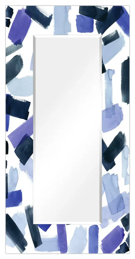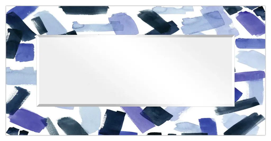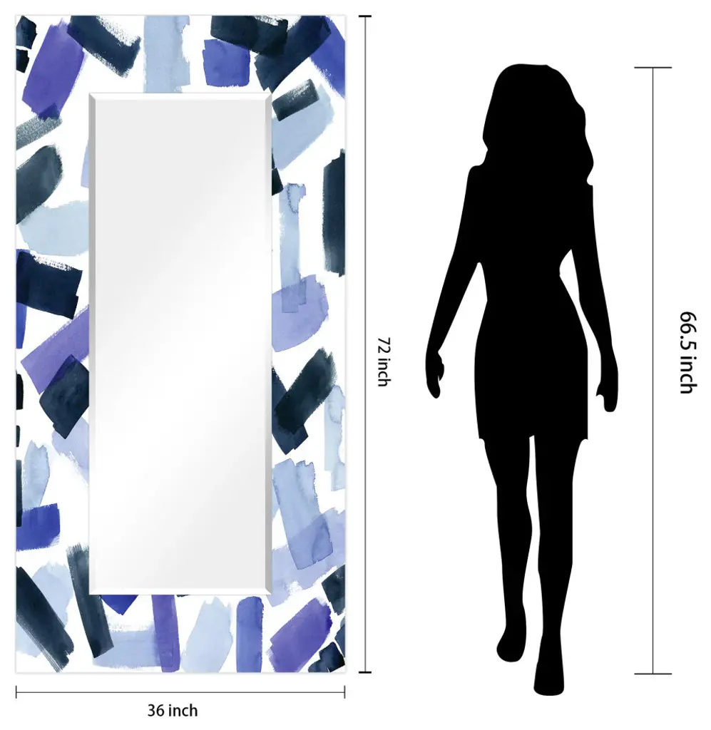 This stunning 72" x 36" frameless, free-floating tempered glass art is the perfect addition for any room where a 6 ft tall mirror is preferred. This specific mirror places a large rectangular mirror over beautiful abstract art of different shades of blue. The mirror in the middle is 55"x 20" with a 0.7" beveled edge. 4 strong steel hangers are attached to the back of the mirror for quick and easy installation either vertically or horizontally.