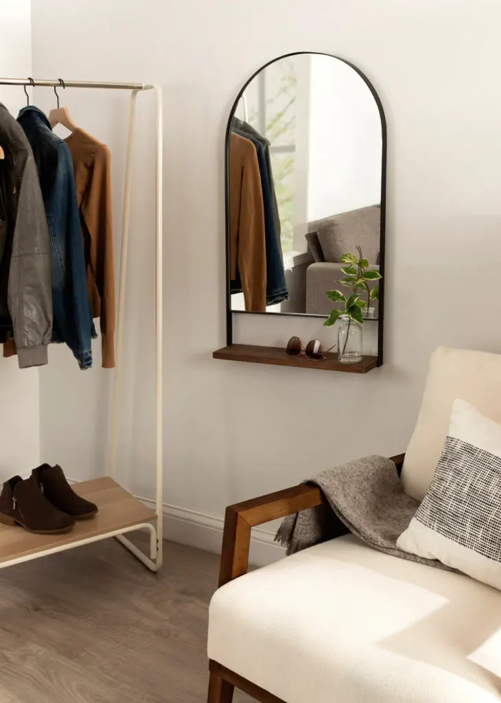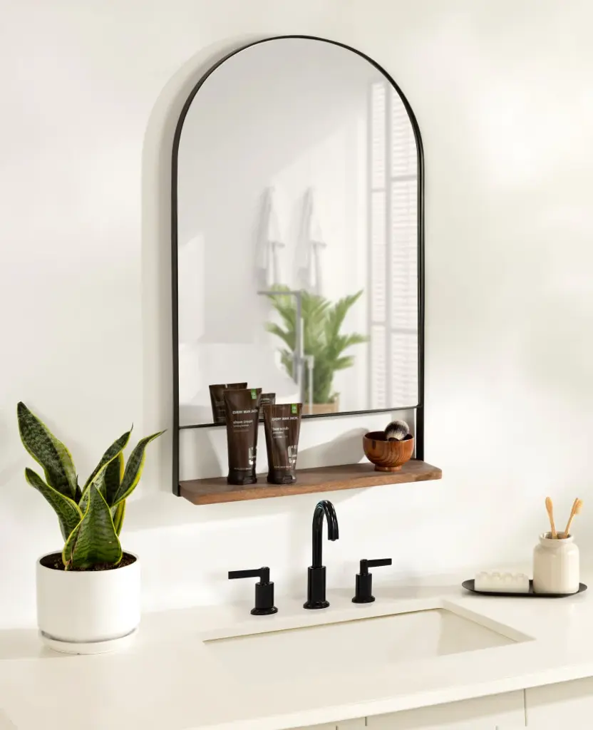 Create a beautiful, farmhouse-inspired aesthetic in your home with an accent piece that increases the vibrancy of your space while making it look more dimensional. The Chadwin mirror takes farmhouse aesthetics and updates them for the modern home, featuring a sleek arched shape and neutral black and wood tones. This mirror is handcrafted in India by skilled artisans, making each piece in this collection distinct in woodgrain and finish. The frame is forged with a resilient iron material, while the small attached shelf ledge is composed of robust mango wood. Its overall dimensions are 20 inches wide by 4 inches deep by 34 inches tall, creating an attention-grabbing focal point in any room of your home. The Chadwin''s large size is perfect for use as a bathroom mirror above your vanity, or as a commanding farmhouse statement piece in your entryway, living room, bedroom, or dining room. It''s easy to hang in any of these places thanks to the sturdy metal keyhole hangers conveniently attached to the back of the frame.• CHIC STYLE: This lovely mirror is perfect for the modern farmhouse home with a lovely arched shape and a dimensional look• QUALITY DESIGN: The Chadwin is crafted in India out of rich mango wood and iron, making each piece distinct and one-of-a-kind• LARGE SIZE: The dimensions of the Chadwin are 20 inches wide by 4 inches deep by 34 inches tall, creating an ideal bathroom mirror or decorative focal point in your living room, bedroom, or entryway• FUNCTIONAL: This mirror includes a 20-inch shelf with a 4-inch depth that''s fantastic for toiletries, candles, small succulents, and more• EASY TO HANG: Keyhole hangers are attached to the back of the frame for quick and easy installation