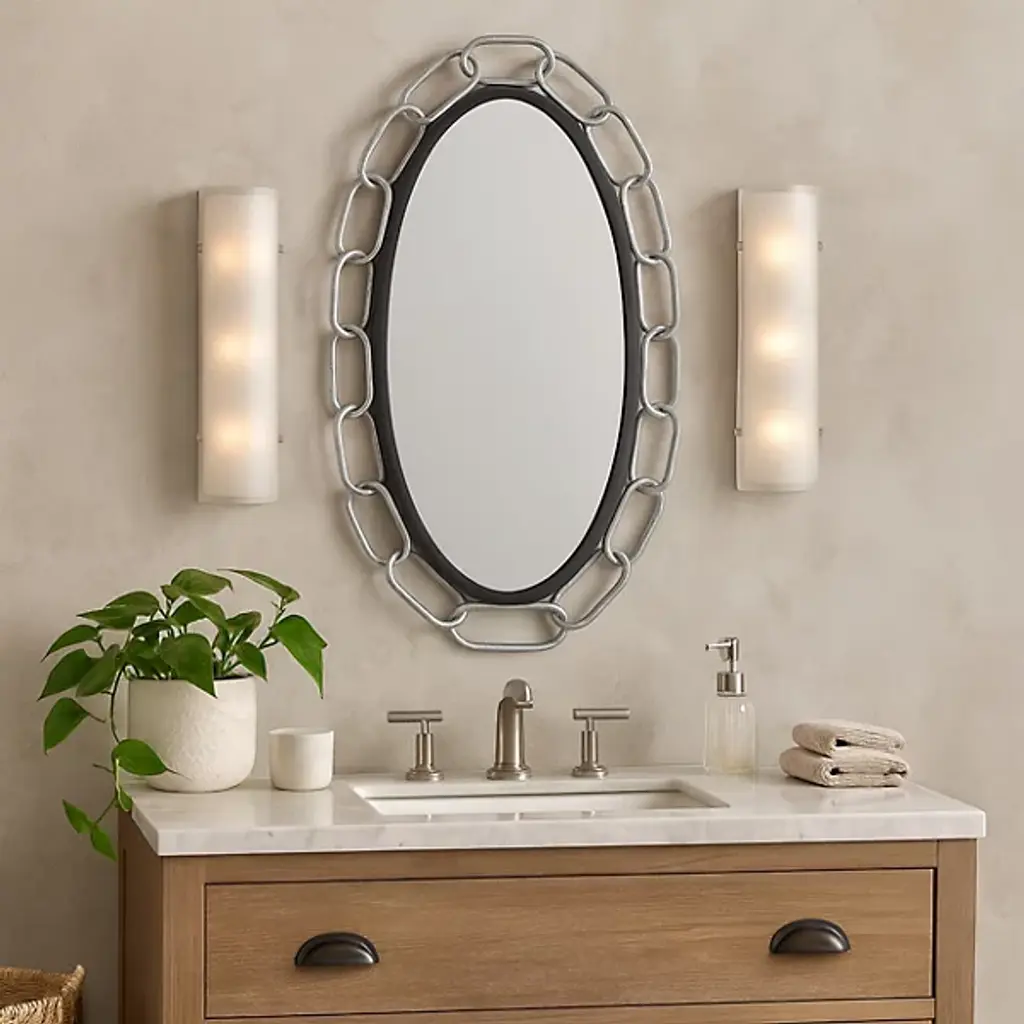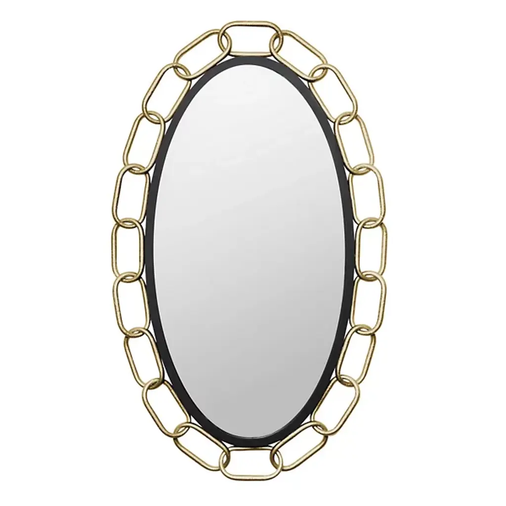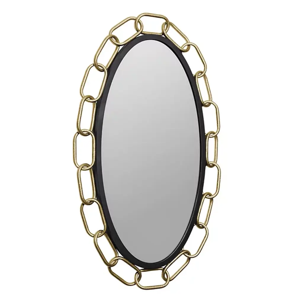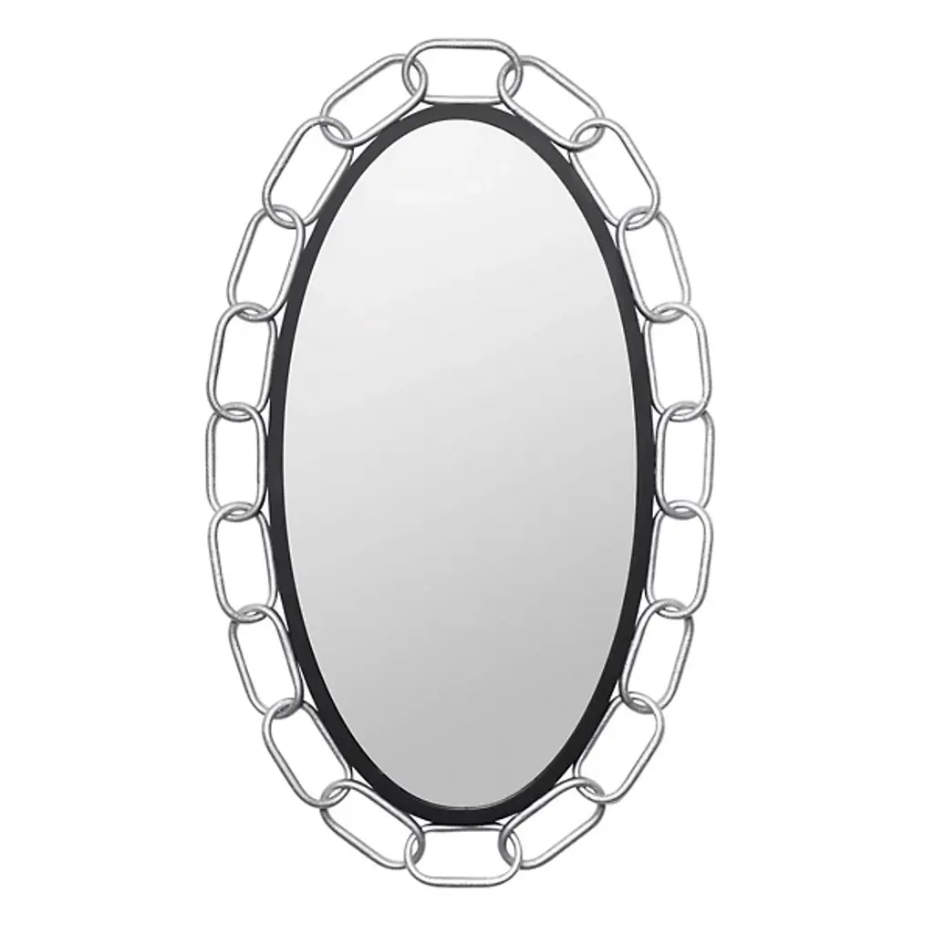 The Chains of Love Oval Wall Mirror from Varaluz, where artistry seamlessly meets functionality. This mirror features a frame made from a chain of links, forming a captivating and distinctive design that adds character to any space. Its elegant oval-shaped mirror serves as both a practical reflection surface and brings a touch of sophistication to your decor. Whether mounted vertically or horizontally, it offers versatility in how you choose to display it. This mirror is crafted from hand-forged recycled steel.