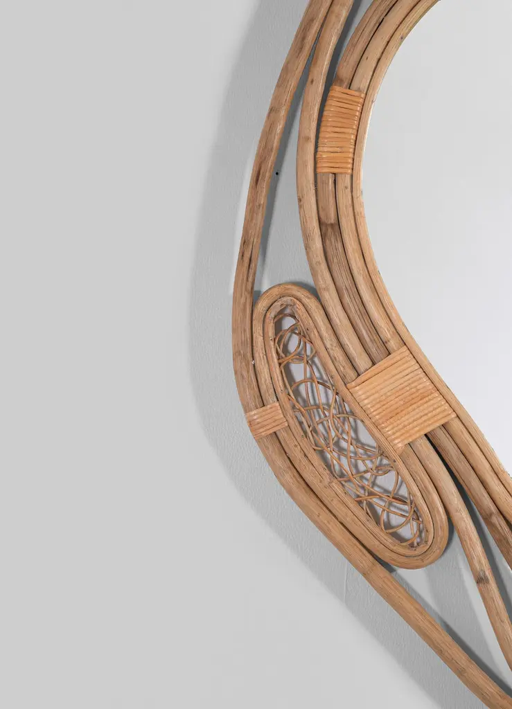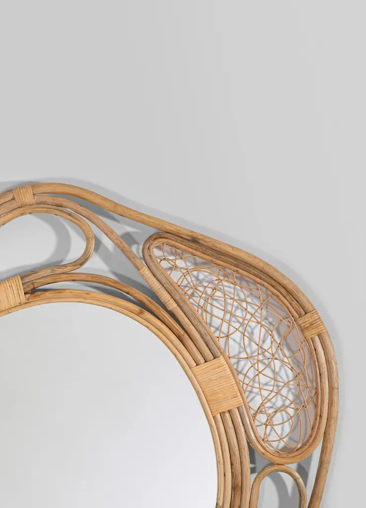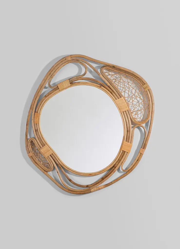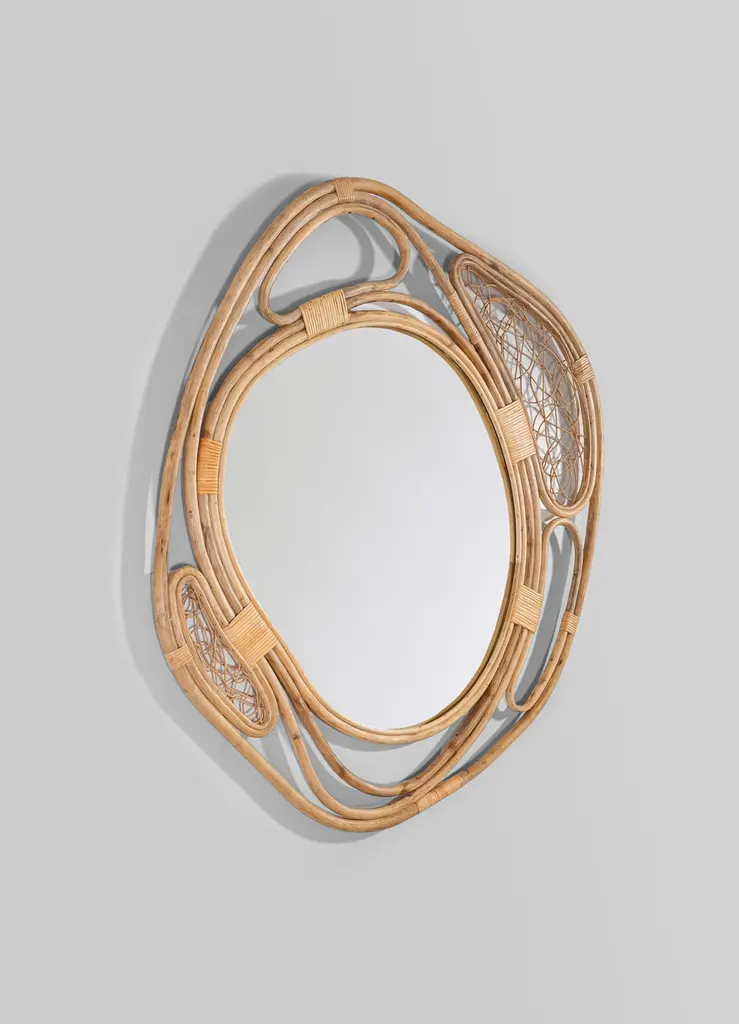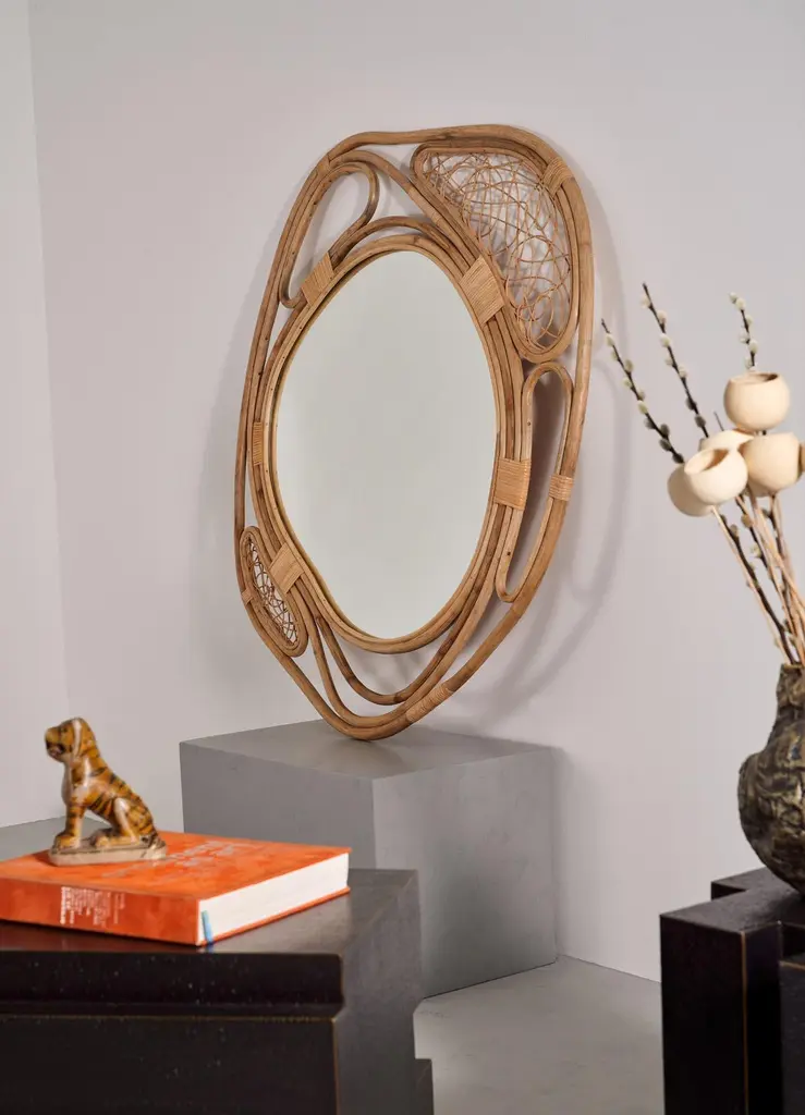 Chakra Mirror Round in Cane, Viya by Vikram GoyalPerhaps nothing is more captivating than nature's enduring metamorphosis, persisting in graceful transformation even beyond the boundaries of life. In this enchanting ritual - one with an intimate relationship with India and its cottage industries - cane is delicately peeled from the bark of the rattan plant, bathed in water, and skillfully woven and knotted into ethereal creations. The result is feather-light, resilient and references the chakra, circular energy points which unlock a harmonious unity of mind, body, and spirit.Mirror in cane. Handmade in India.Product DetailsMaterial: CaneSize: 44.5"H x 38"W x 1.5"D 113 H x 96.5 W x 3.8 D cmWeight: 9.7 kg 21.34 lbsNumber of Pieces: 1 MirrorSKU: VMI201This product has been handcrafted by local artisans. As such, slight variations are a testament to the unique character of a piece made by hand.