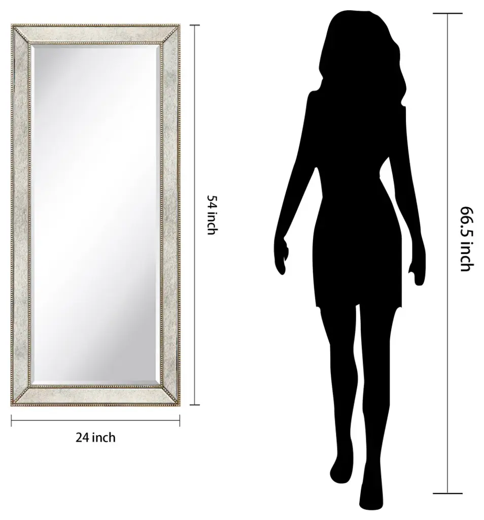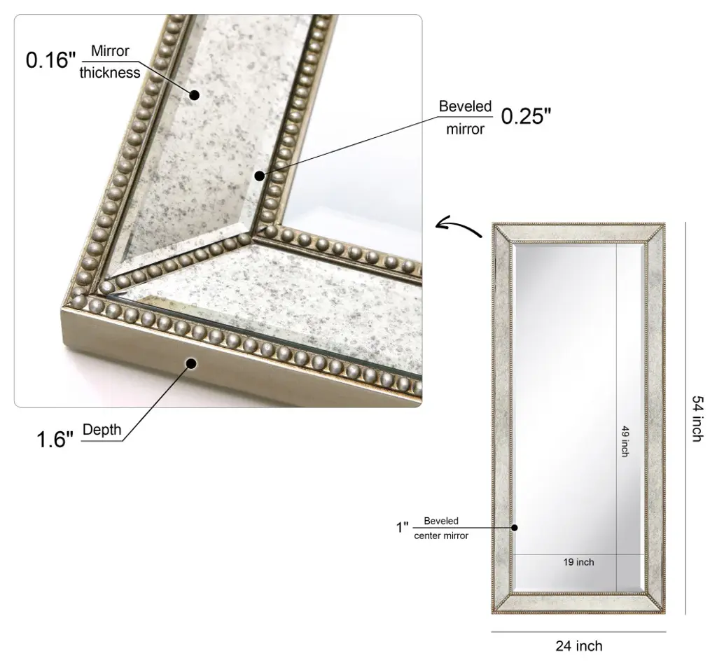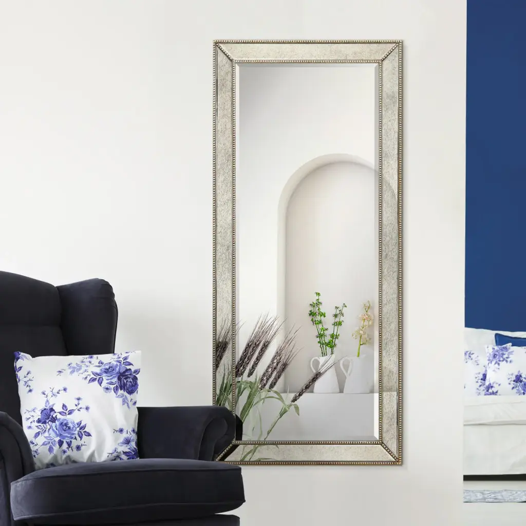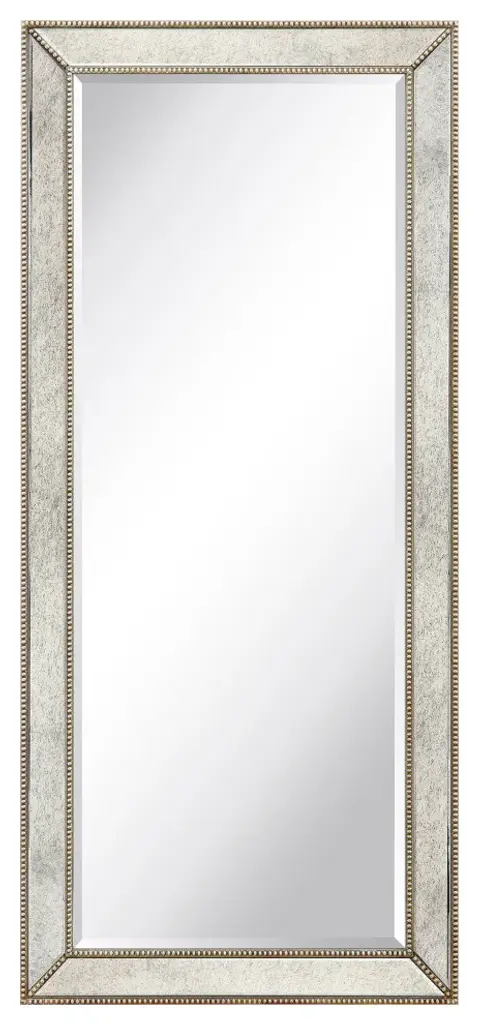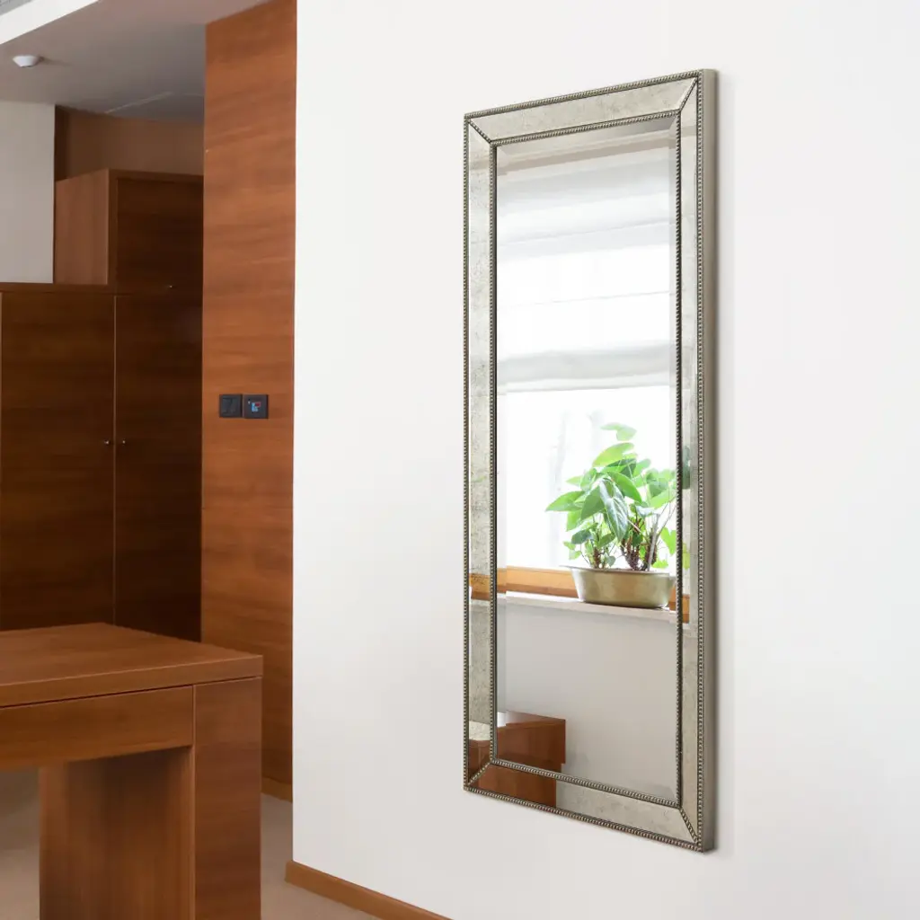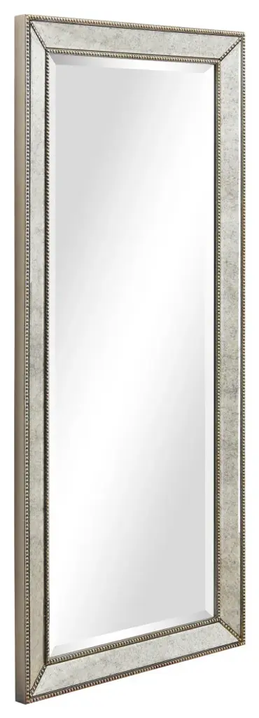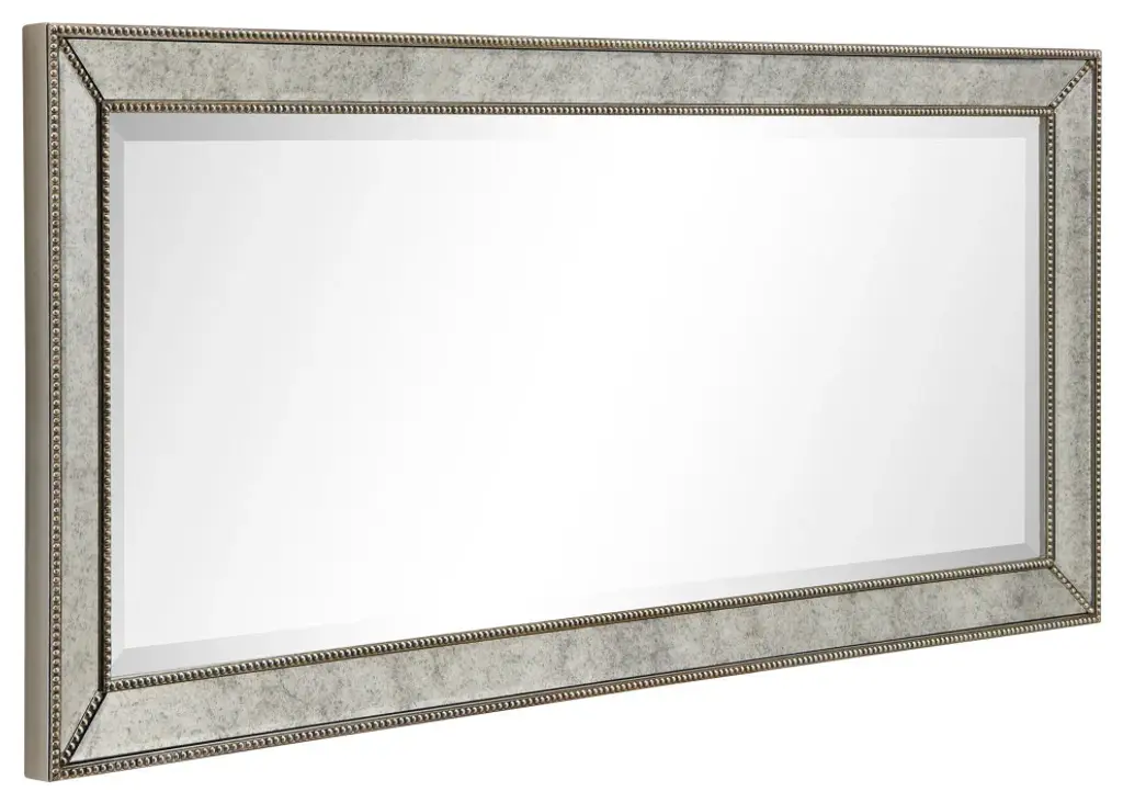 This wall mirror is raised slightly from its surrounds by a 1-inch bevel that helps the mirror to project a presence into the room, while also providing a space for adornment. The mirror has a silver pattern with bronze beads that recalls a royal style. 4 Hooks are affixed to the back of the mirror so it is ready to hang right out of the box in either a horizontal or vertical orientation! Packaged in strong carton with full protective corners and styrofoam.