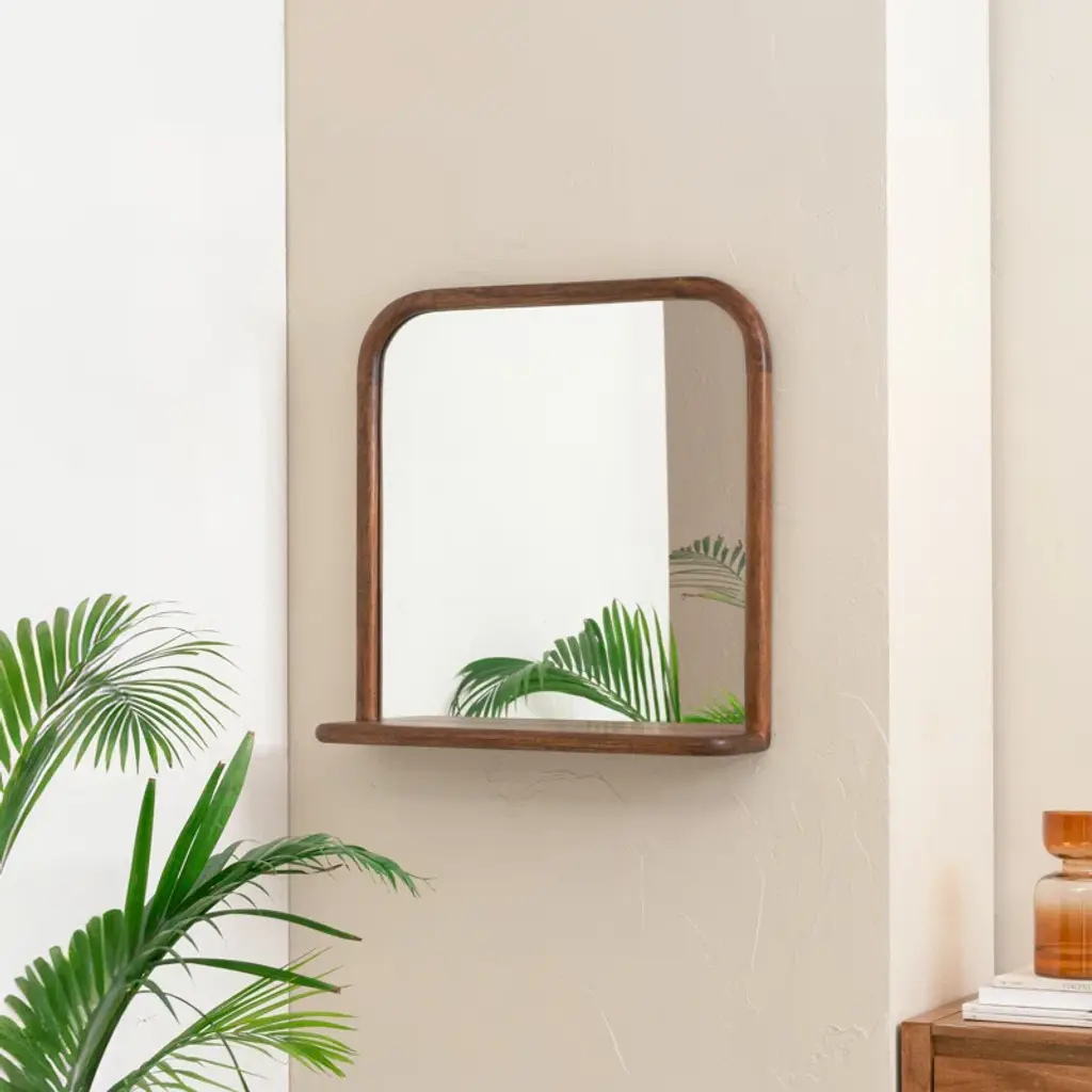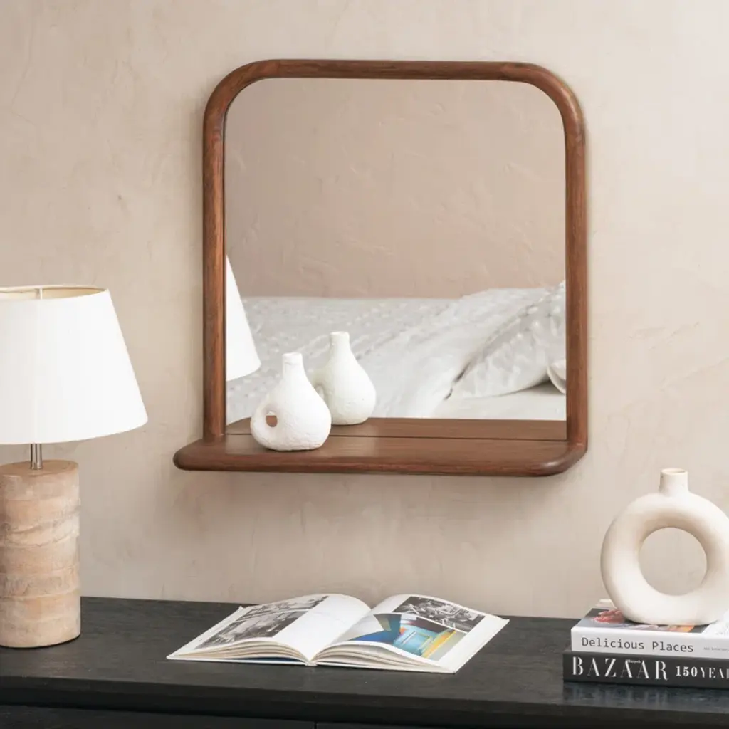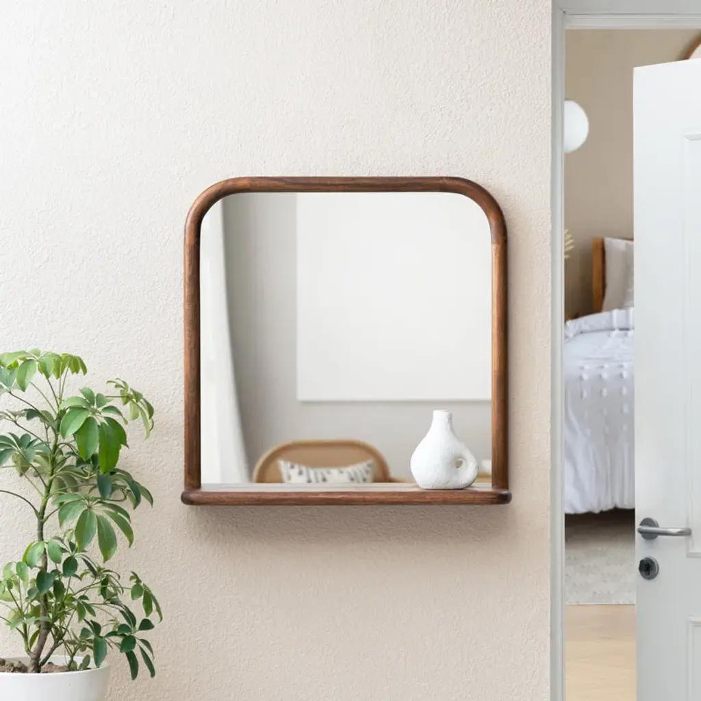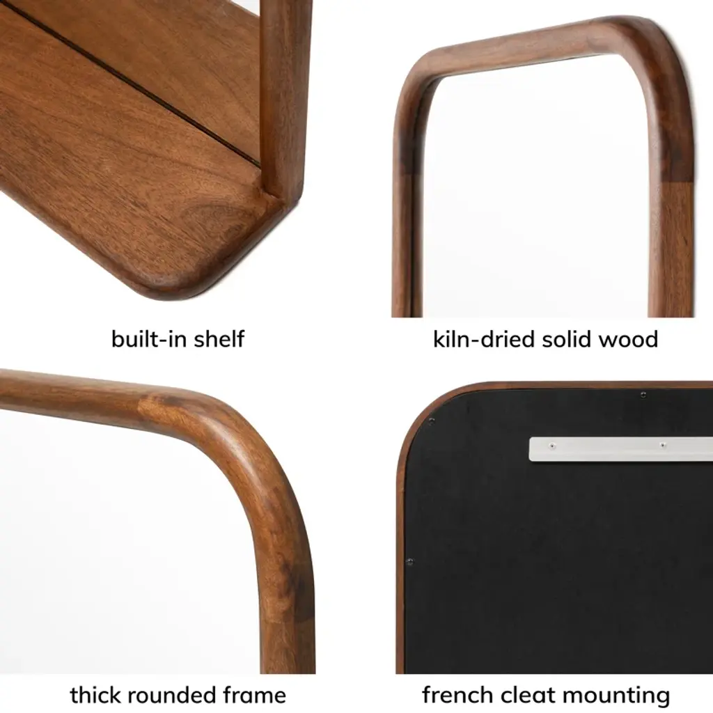 STYLE MEETS FUNCTION Designed with versatility in mind, this mid-modern mirror is a blend of style and functionality. Thick rounded frame carved out of solid wood all over, built-in shelf offers storage for your go-to-essentials or displays. Comes with a pre-installed French cleat for easy mounting. Simple in design and handy in use, this piece is perfect for your entryway, living, or bedroom.