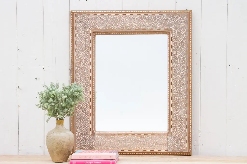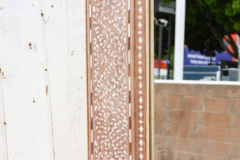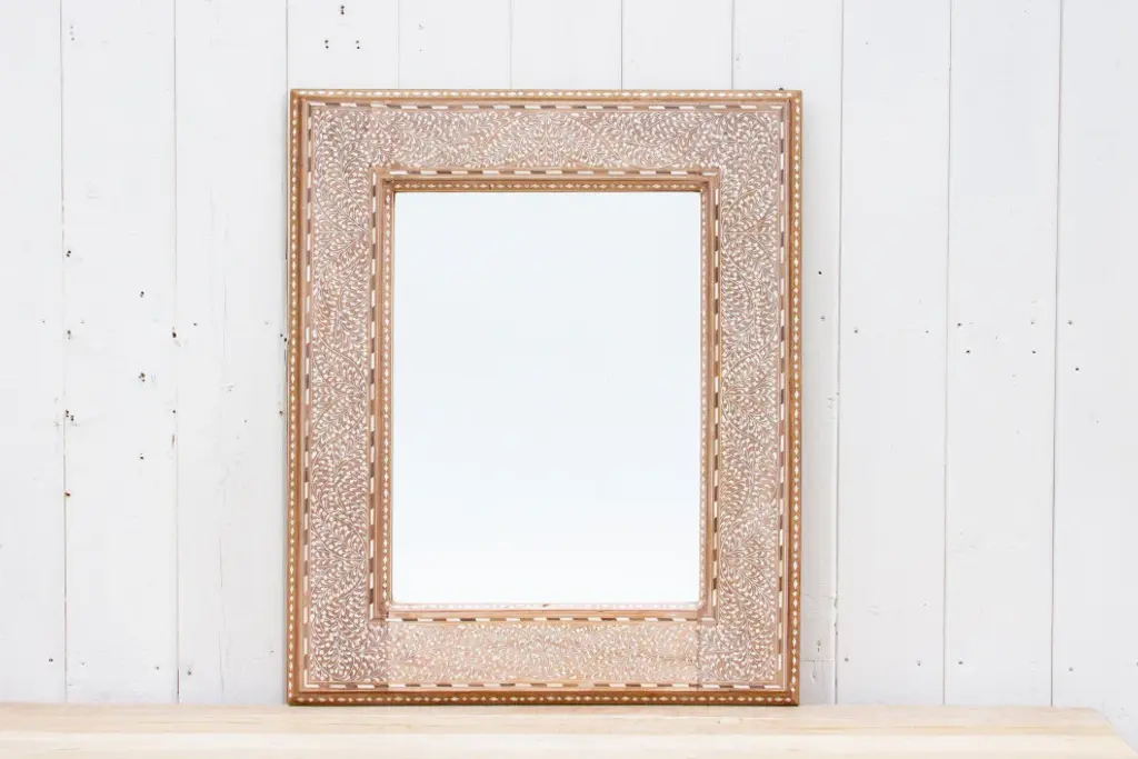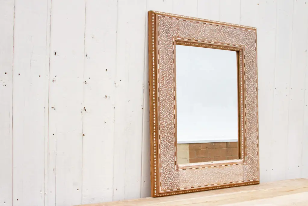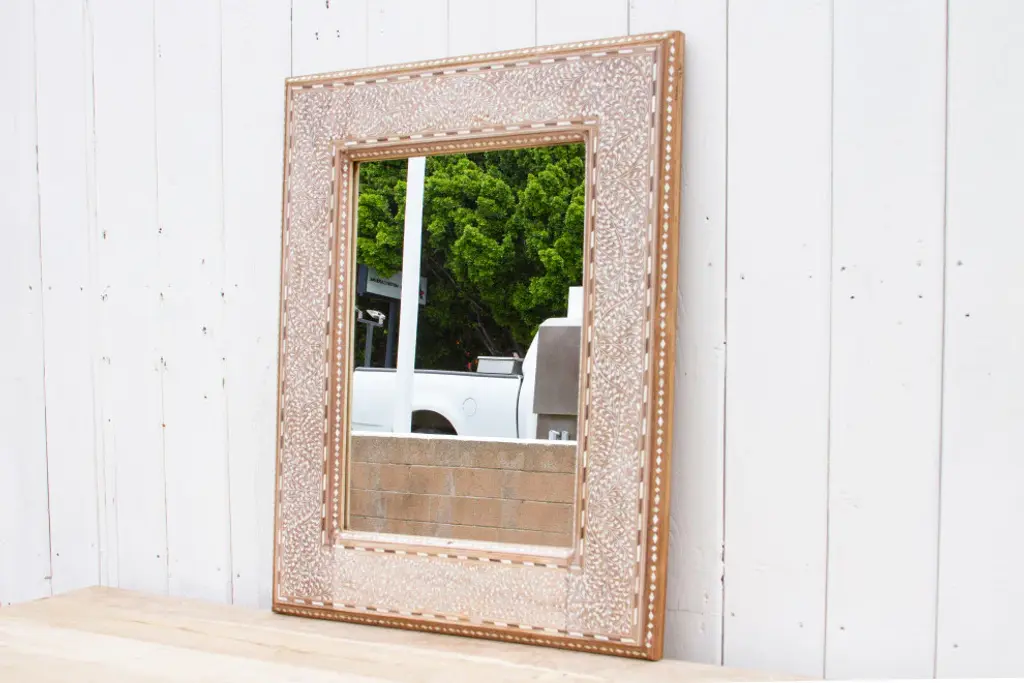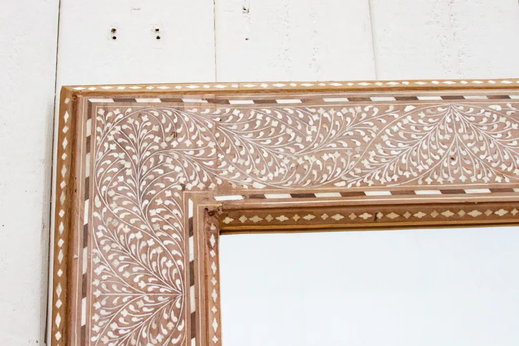 This Anglo-Indian mirror is a remarkable piece of furniture crafted from reclaimed teak wood. This charming mirror showcases exquisite hand-inlay work, with beautiful floriated designs adorning the entire frame with a geometric inlaid border around the edge. This modern farmhouse inlay mirror showcases a natural unsealed teak finish, adding to its authentic charm and rustic appeal. With a rich history rooted in the fusion of British and Indian craftsmanship, Anglo-Indian furniture emerged during the colonial era. This exotic mirror exemplifies the intricate inlay technique that was popular during that time.